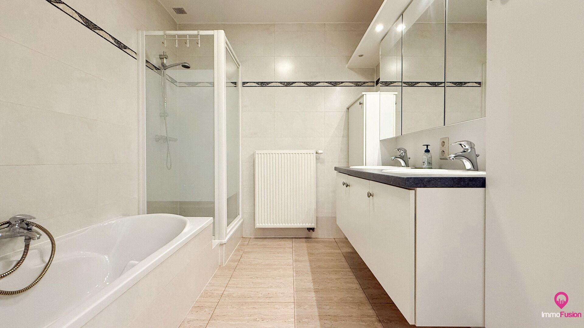 De badkamer is uitgerust met een bad, douche en dubbele wastafel.