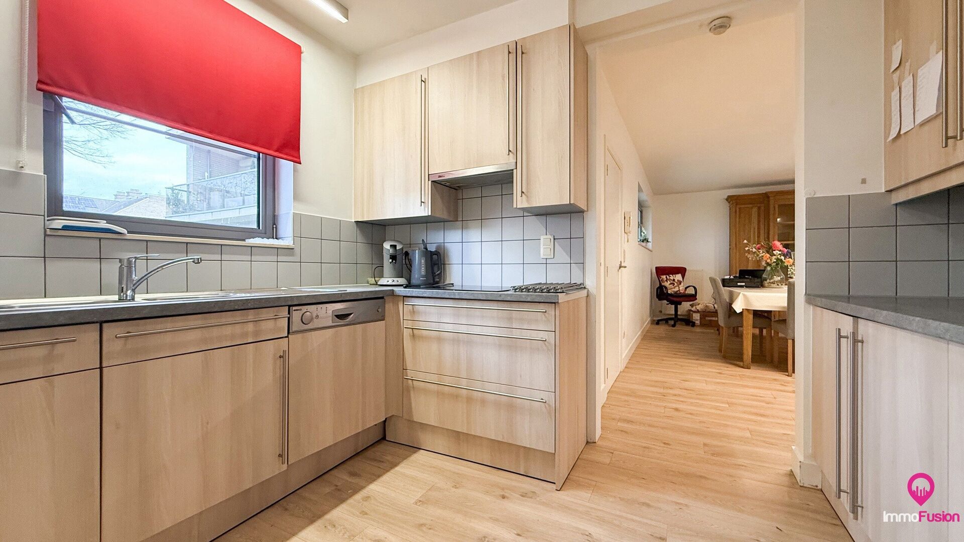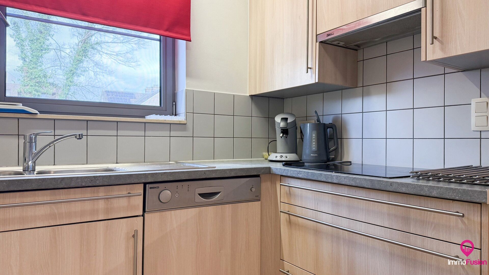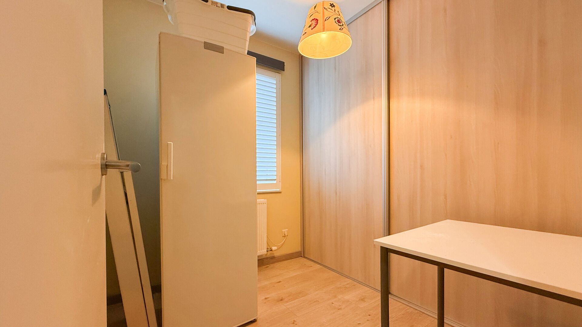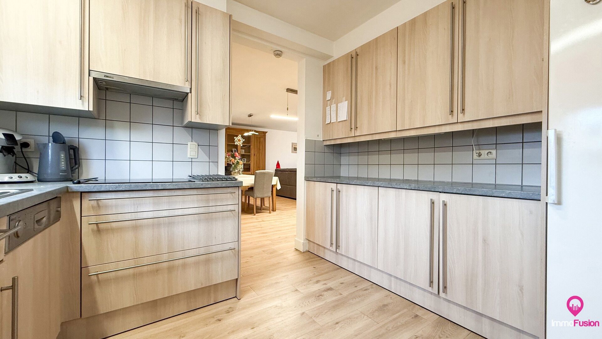 De leefruimte sluit aan op een mooi terras, ideaal om in alle rust te genieten. De volledig geïnstalleerde keuken is praktisch ingericht en uitgerust met alle nodige toestellen, waaronder een vaatwasmachine. Aansluitend bevindt zich een aparte berging met voldoende ruimte voor een wasmachine en droogkast.