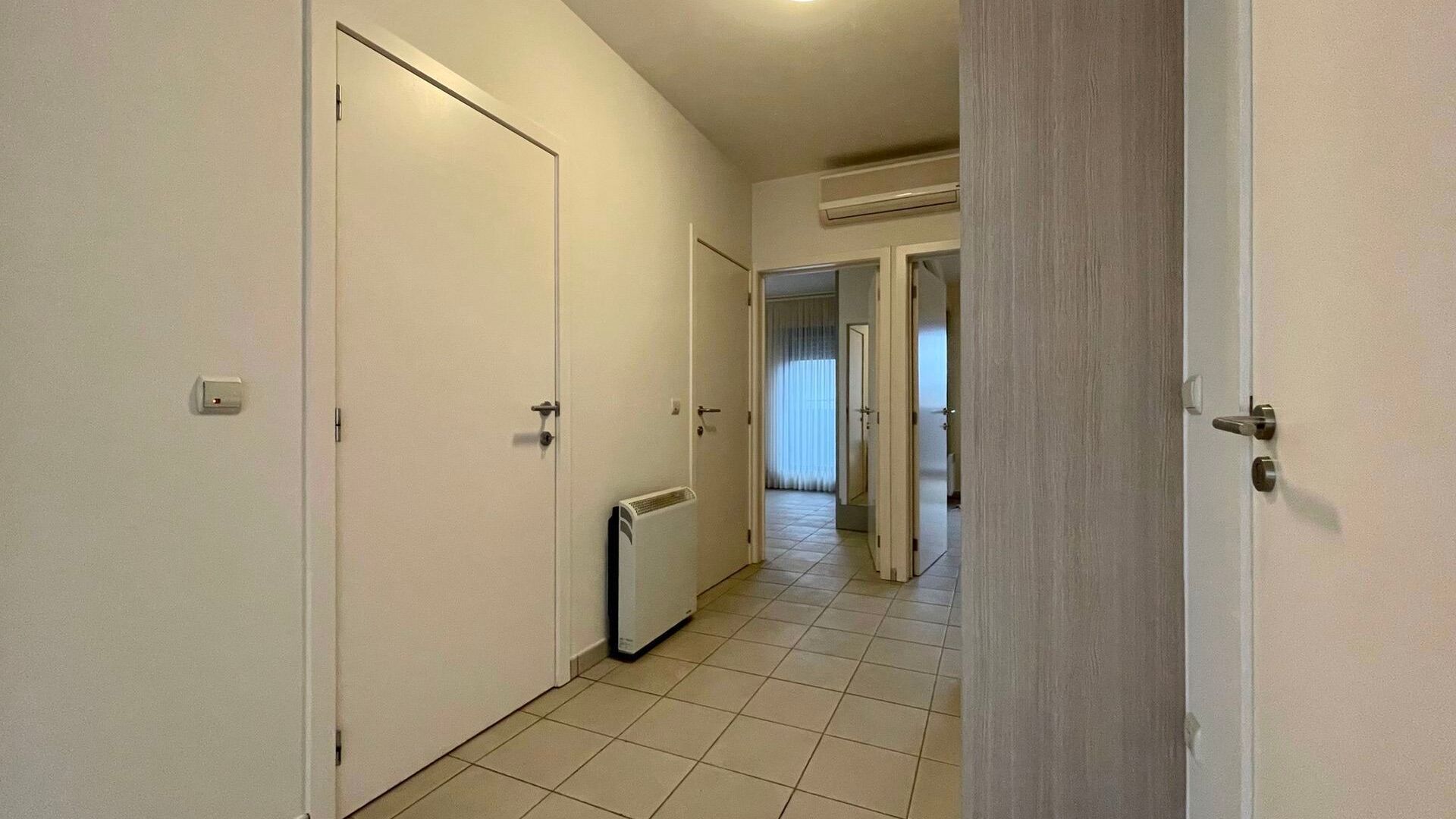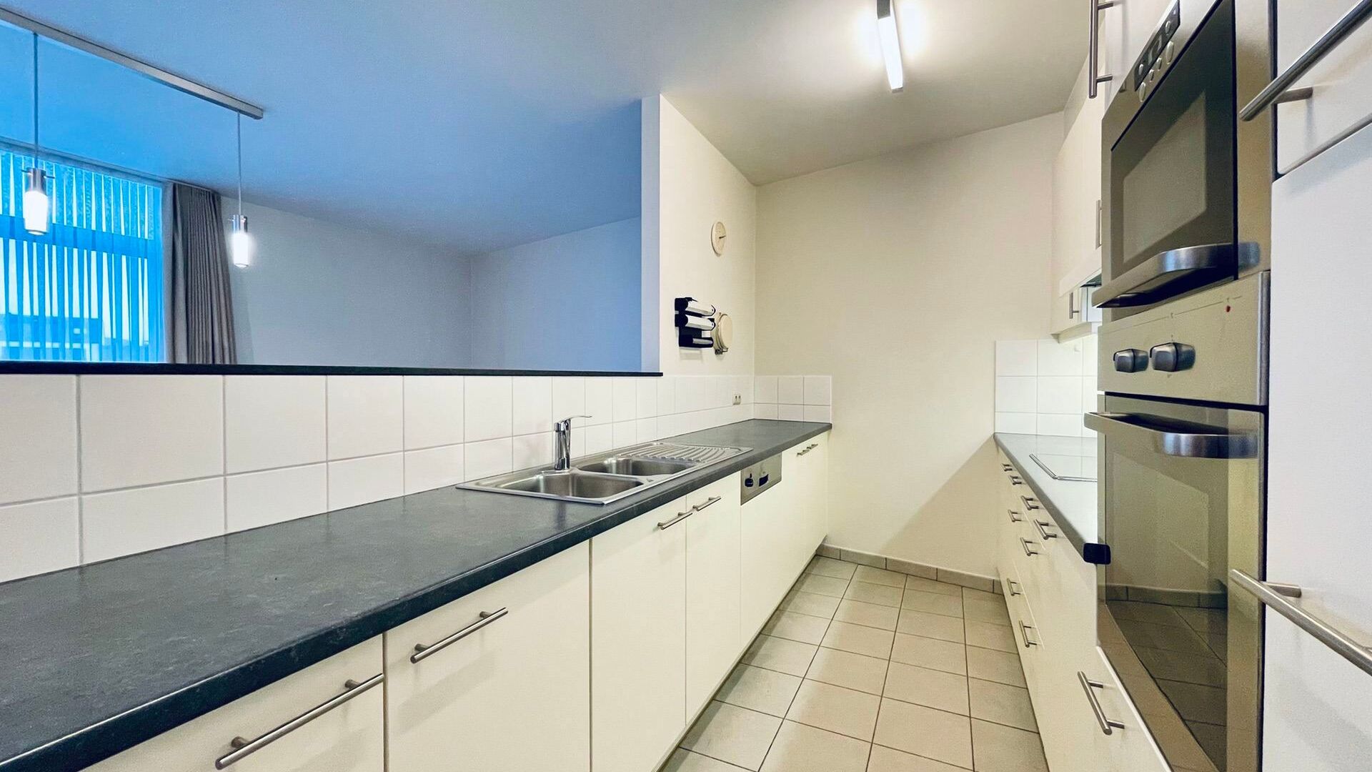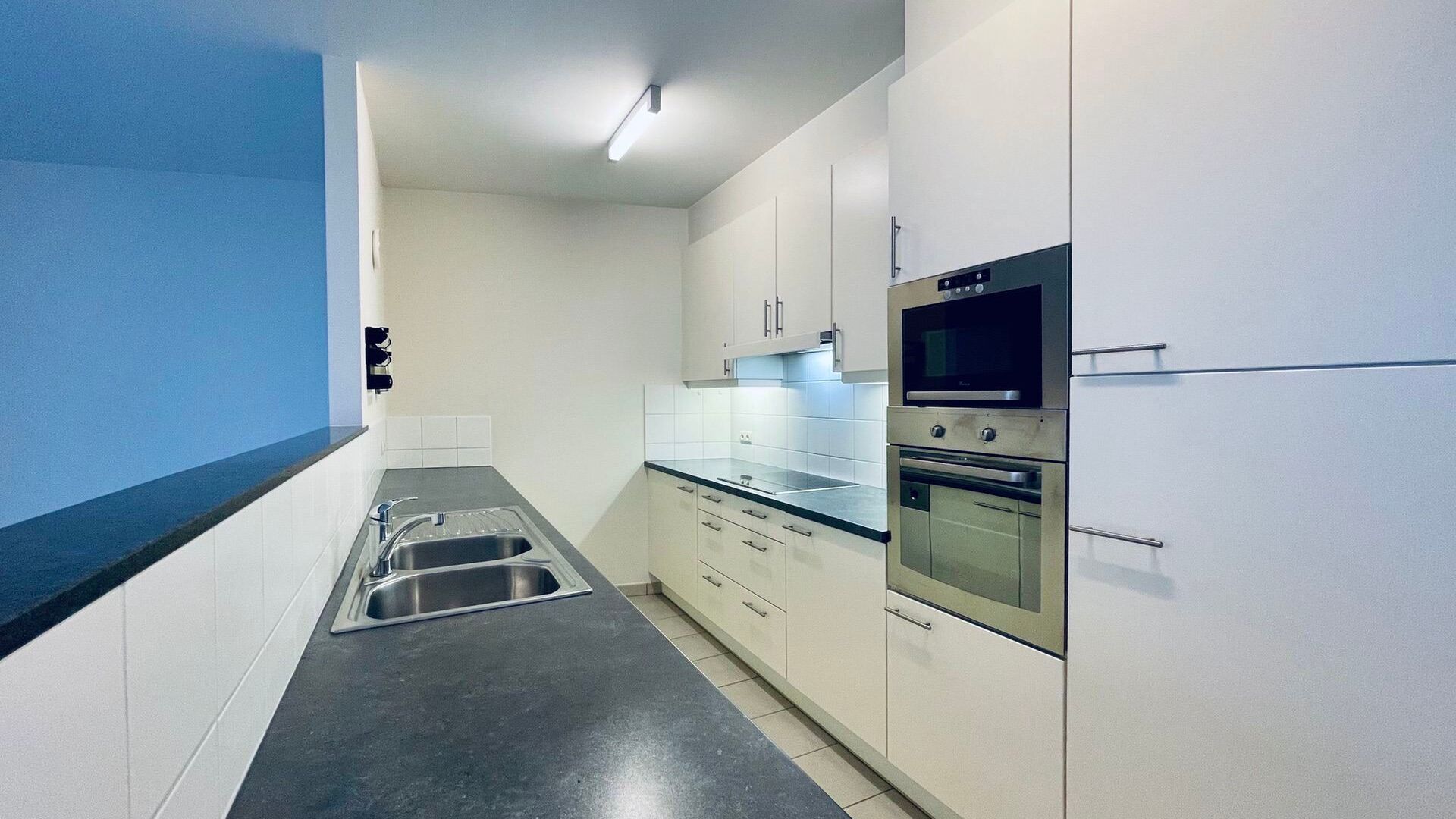 Het appartement beschikt over twee slaapkamers, waarvan één directe toegang geeft tot de badkamer. Let wel: de badkamer is enkel bereikbaar via deze slaapkamer. De keuken is volledig uitgerust met alle nodige toestellen, en er is bovendien een praktische berging voorzien voor een wasmachine.