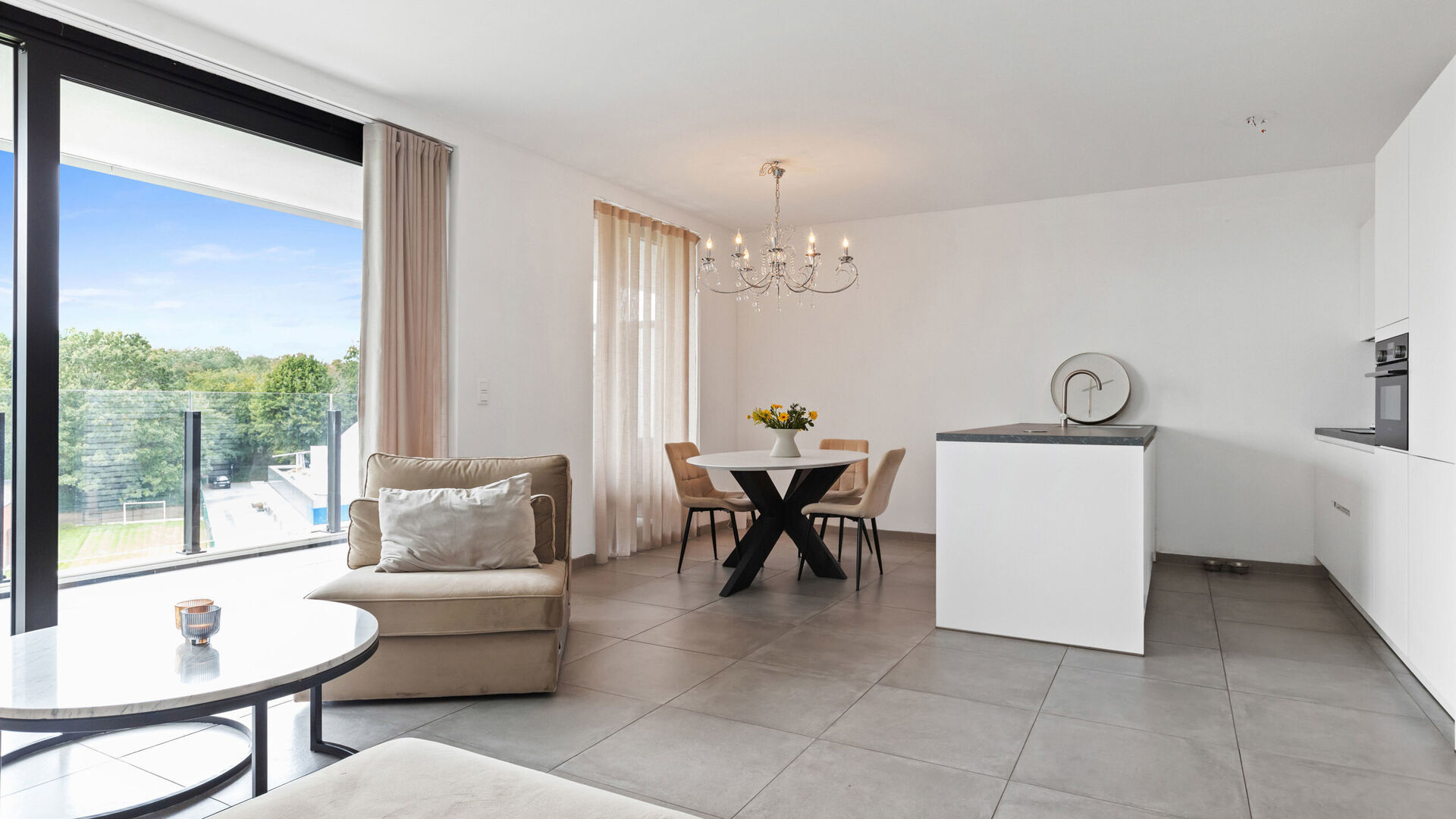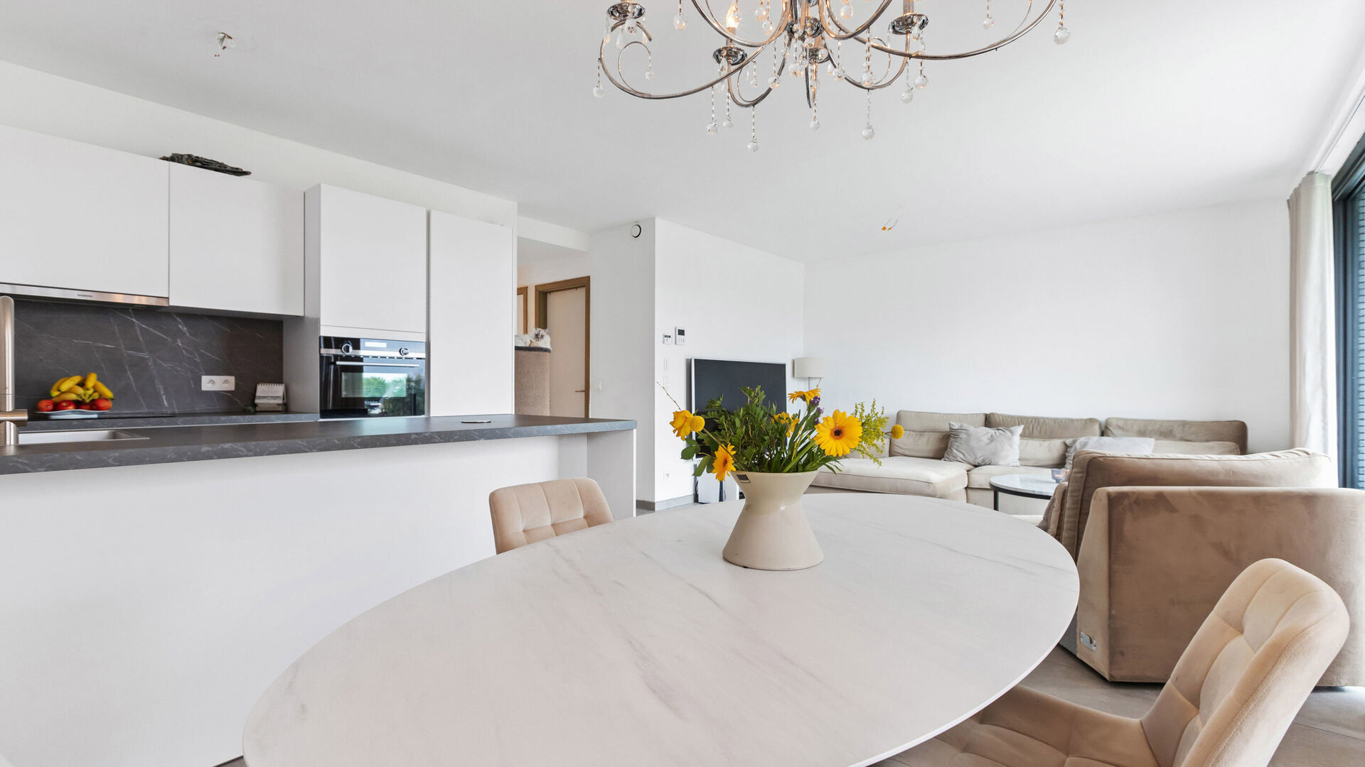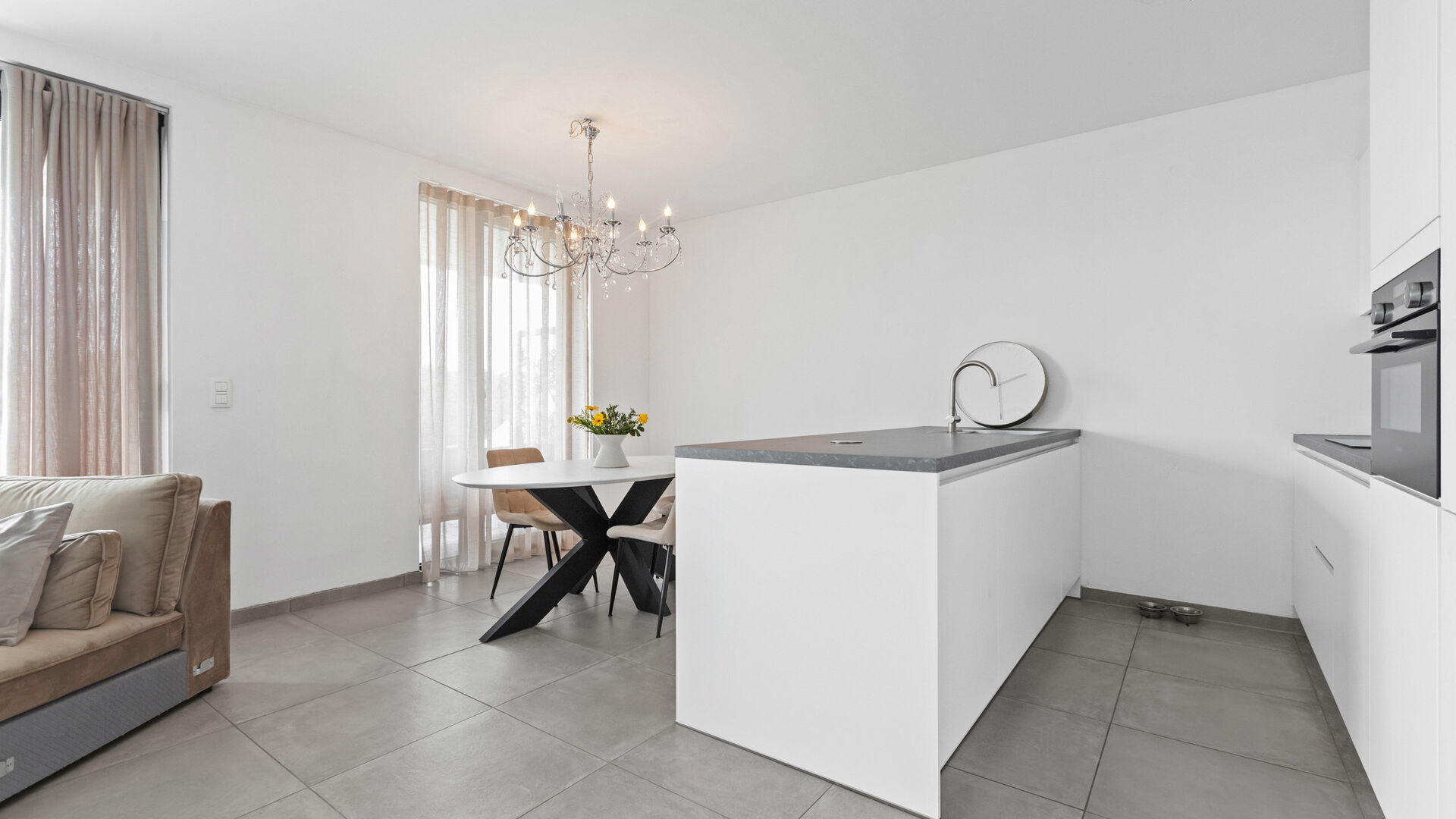 De leefruimte baadt in natuurlijk licht en sluit naadloos aan op de volledig uitgeruste, kwalitatief afgewerkte keuken. Verder beschikt het appartement over een praktische berging, twee volwaardige slaapkamers, een gastentoilet en een moderne badkamer. Het zongerichte terras vormt de ideale plek om te ontspannen.