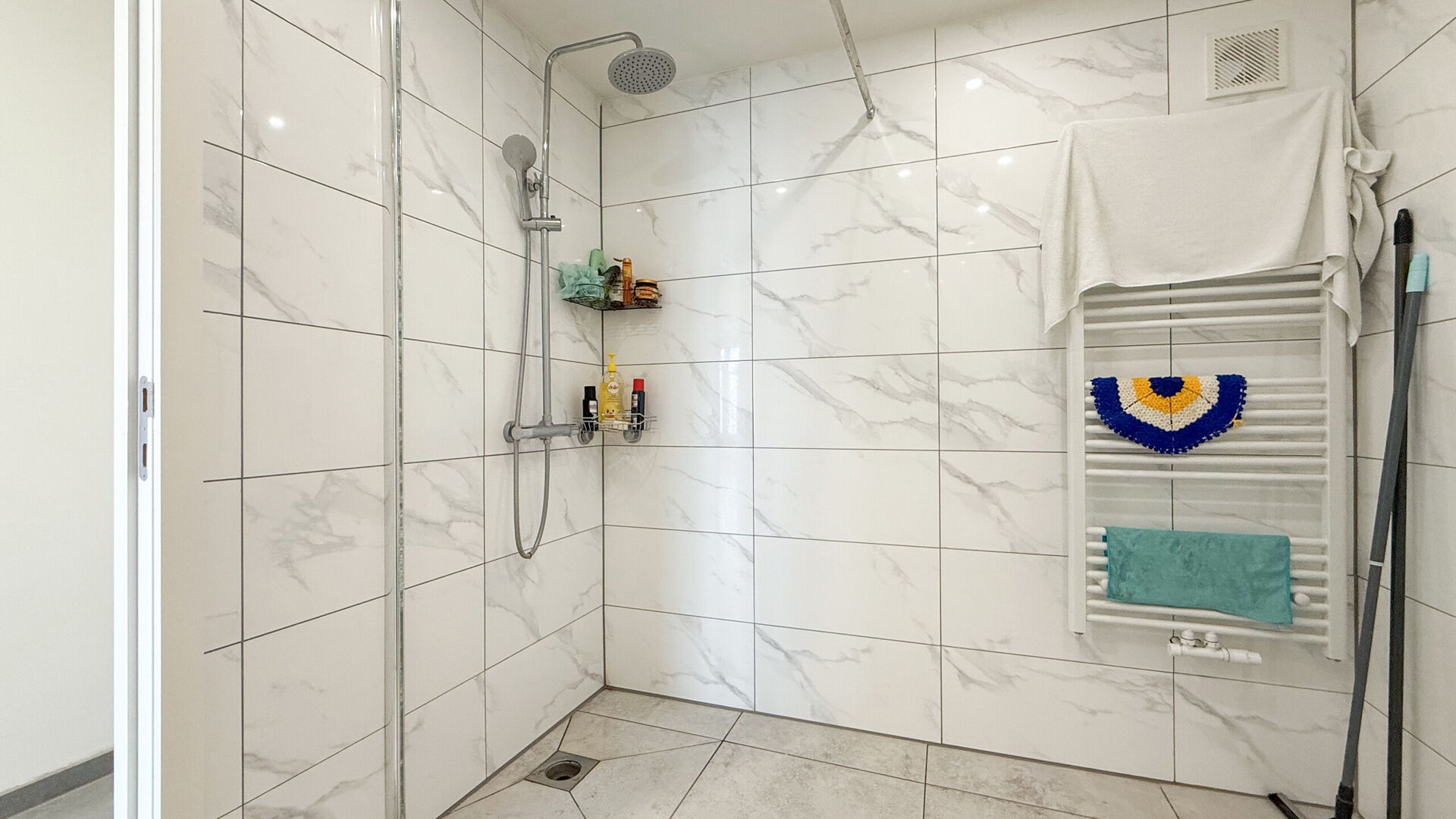De badkamer is praktisch ingericht met een douche, dubbele lavabo, wc en een ingebouwd droogrek. Daarnaast is er nog een apart gastentoilet aanwezig op de gang.
