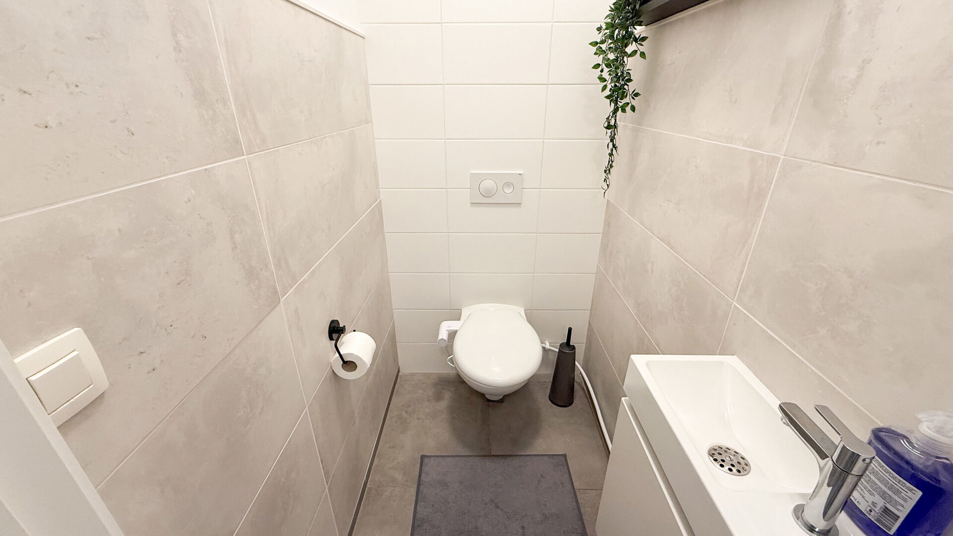 Het appartement beschikt over 2 slaapkamers: een ruime master bedroom van 17m² met directe toegang tot de badkamer, en een tweede slaapkamer van 11m², perfect als kinder-, logeer- of bureauruimte. De moderne badkamer is uitgerust met een inloopdouche, dubbele wastafel en toilet. Daarnaast is er nog een apart gastentoilet aanwezig.