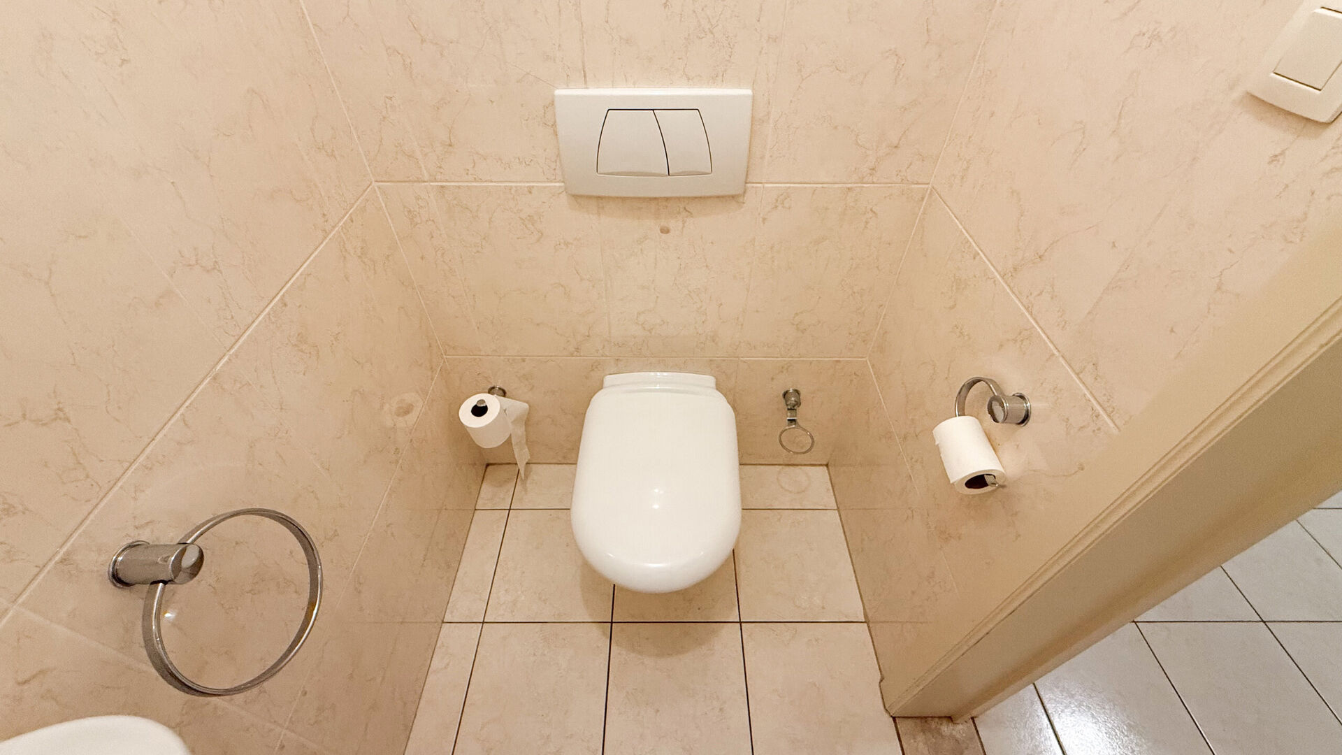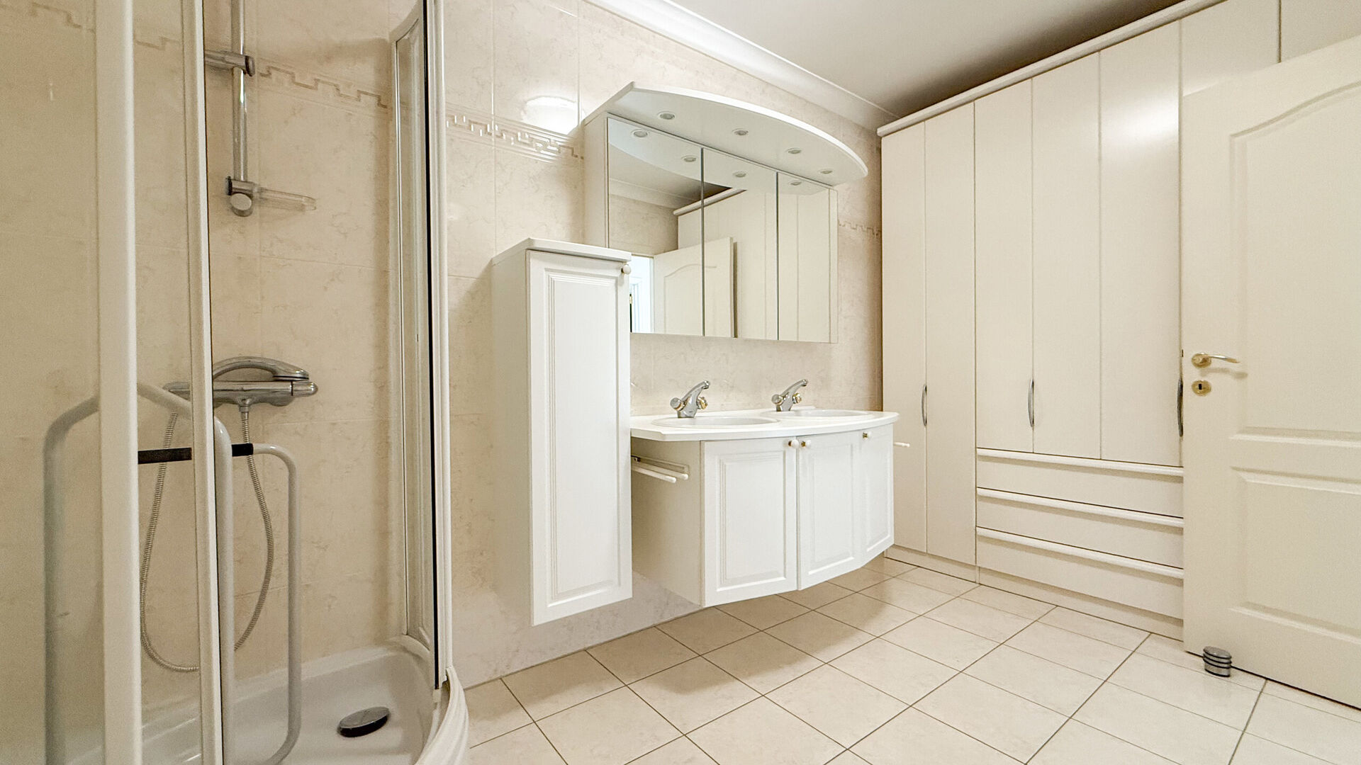 - Badkamer met douche en dubbele lavabo + apart toilet