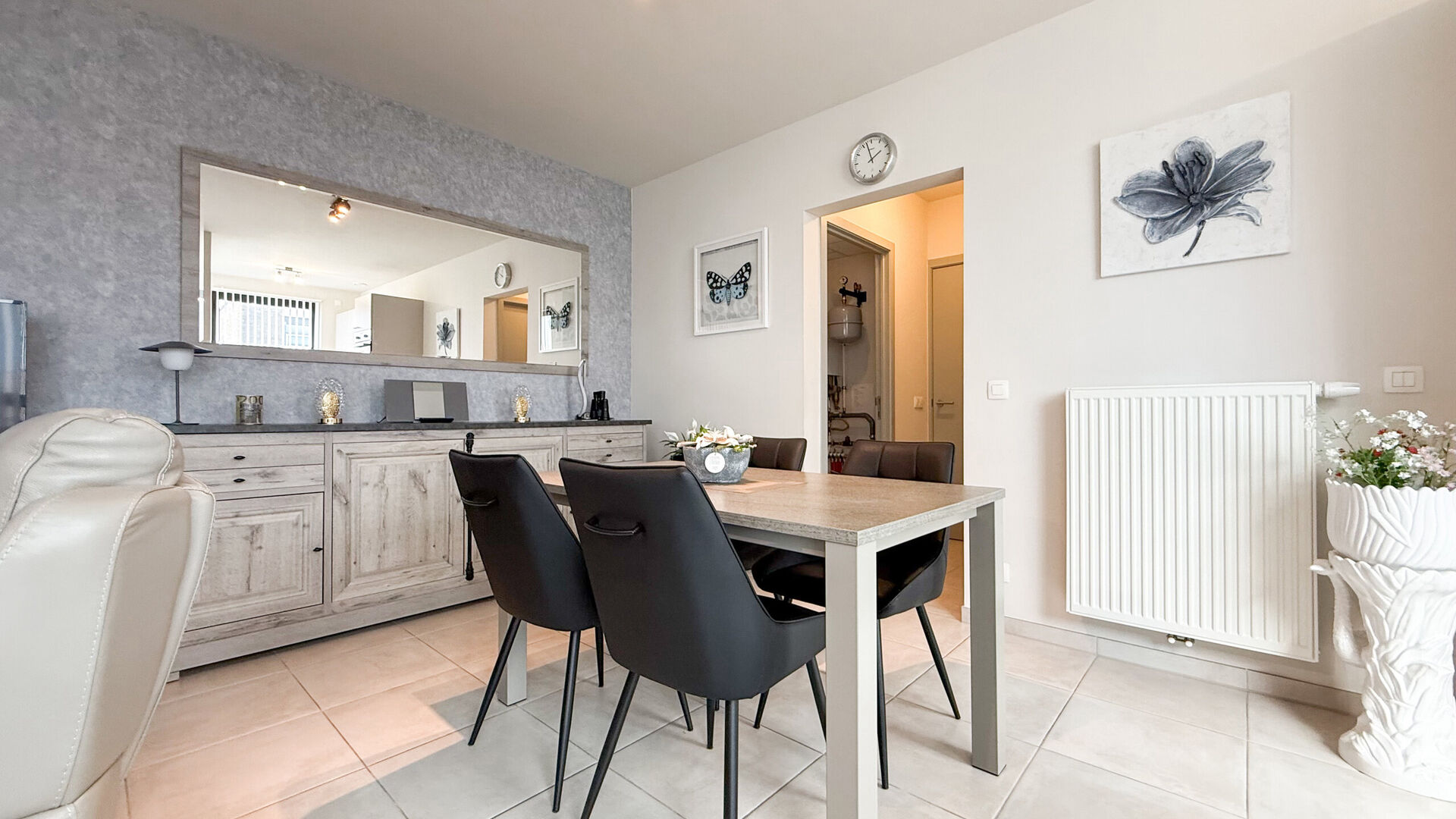 De leefruimte biedt voldoende plaats voor een gezellige zithoek en een ruime eettafel. Aansluitend vind je het terras van 10 m², een ideale plek om te ontspannen of te genieten van een kopje koffie in de buitenlucht.