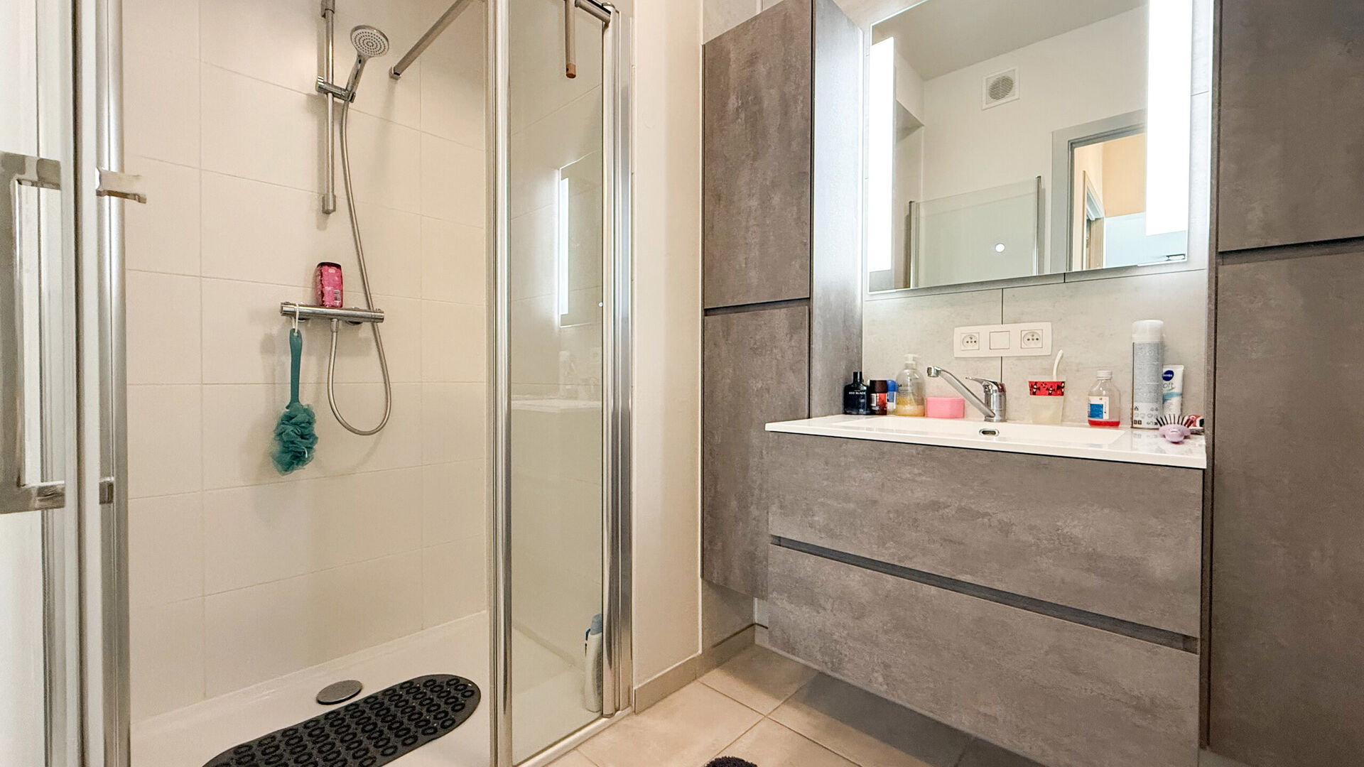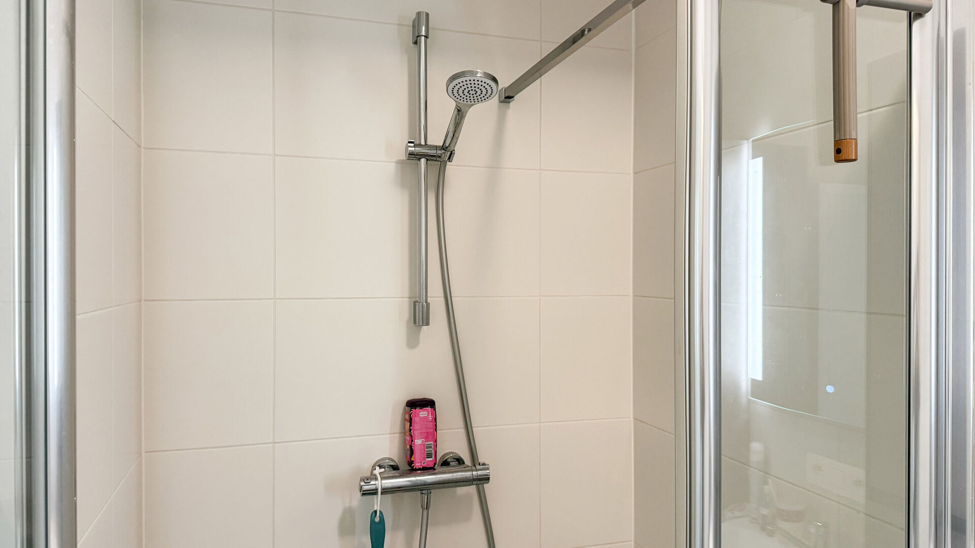 De badkamer is stijlvol afgewerkt en voorzien van een comfortabele inloopdouche, wat bijdraagt aan het hedendaagse karakter van het appartement.