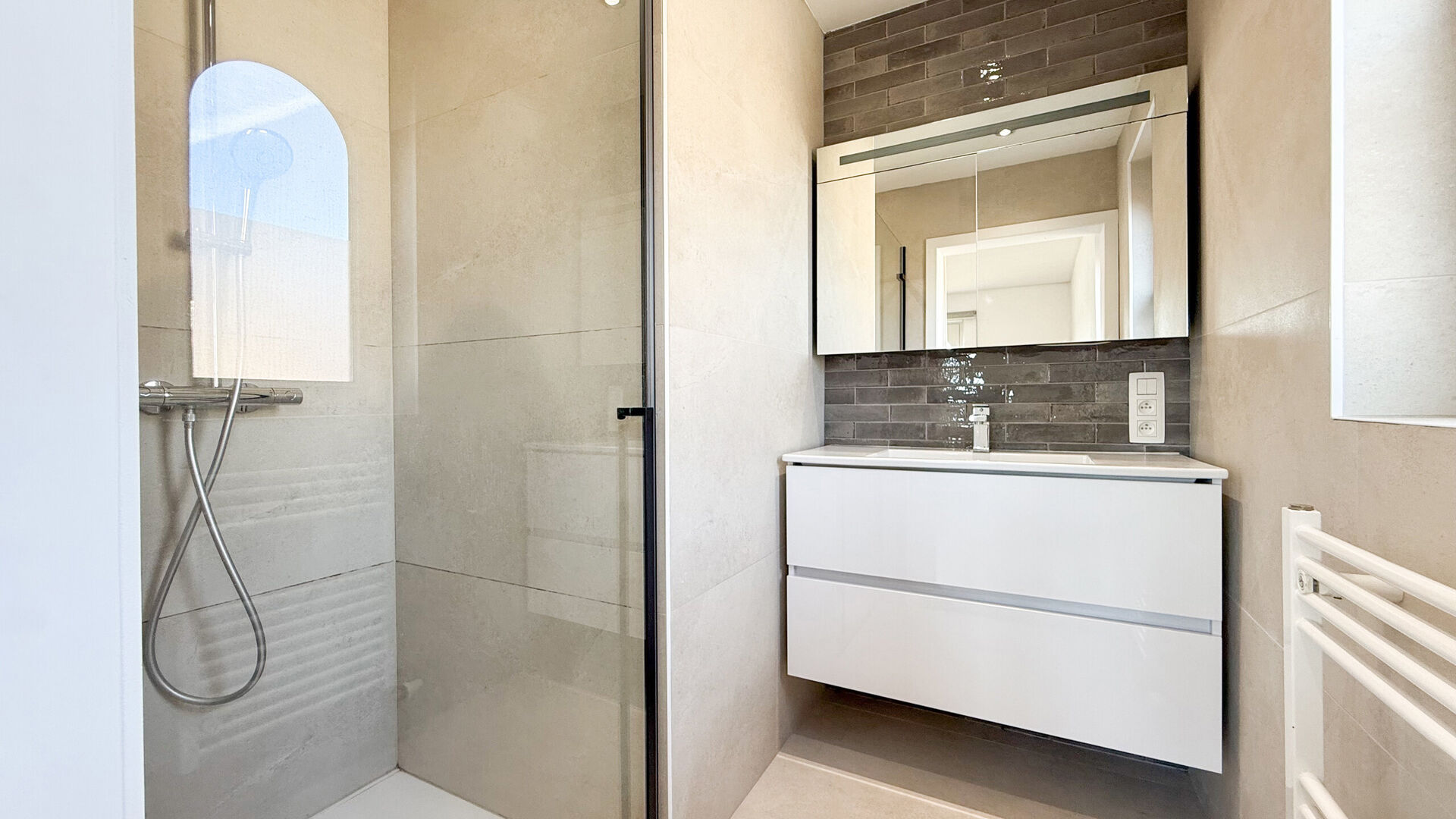 Binnenin beschikt het appartement over een lichtrijke leefruimte met een overvloed aan natuurlijke lichtinval, wat zorgt voor een aangename en open sfeer. Bovendien is de living uitgerust met airconditioning voor extra comfort tijdens warme dagen.