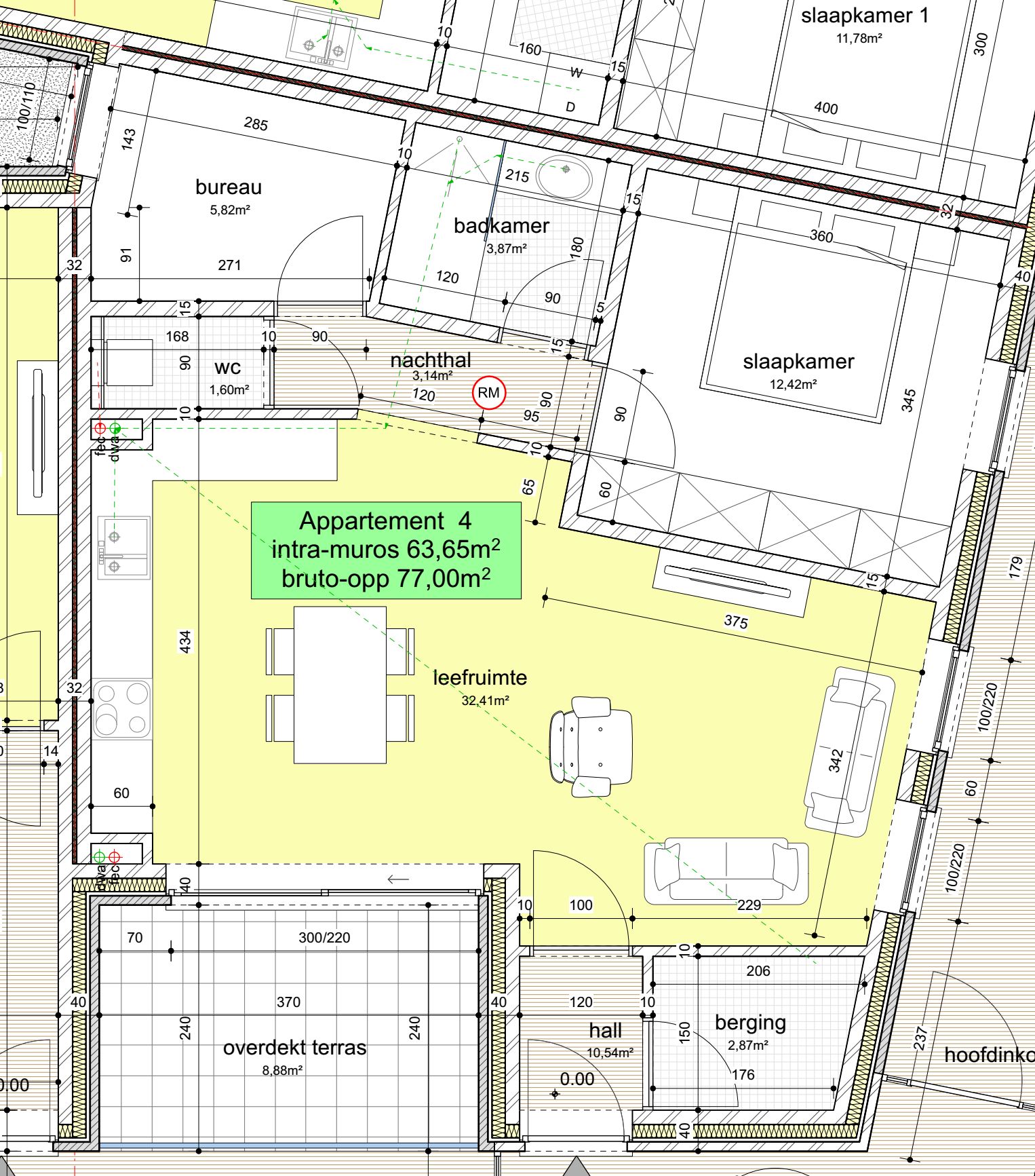 - App 4: 77m² (1 slk + buro met raam) met terras van 8.8m² = 210.000 € excl kosten