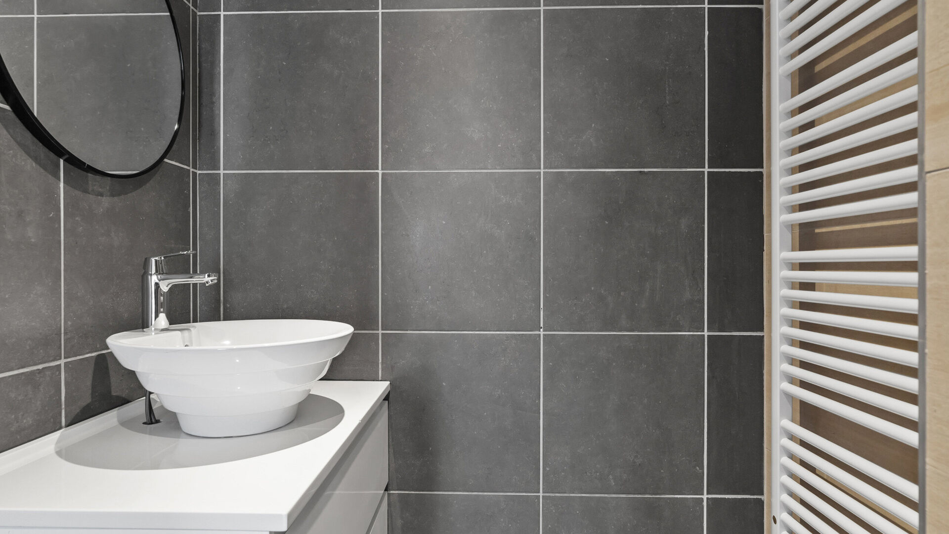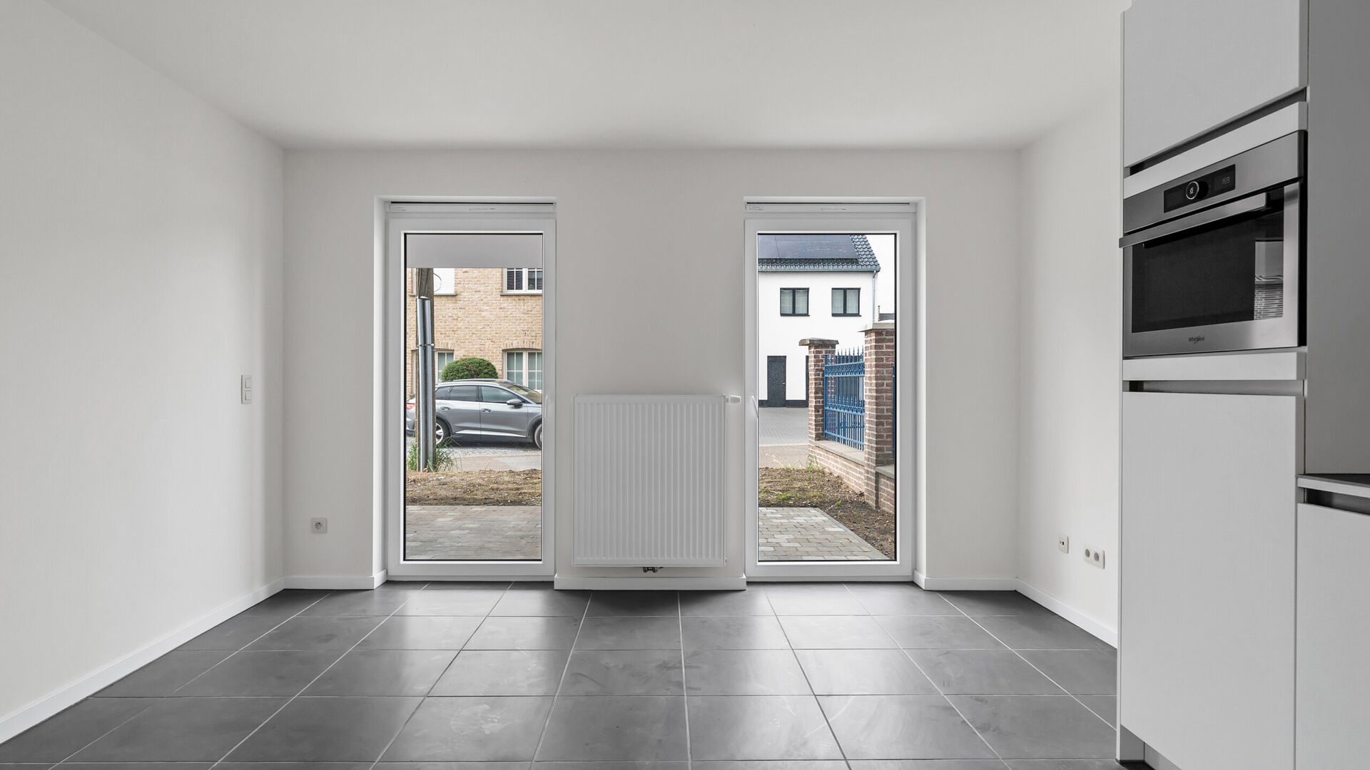 Bij binnenkomst word je verwelkomd door een ruime inkomhal met gastentoilet. Aan de linkerzijde bevindt zich de slaapkamer, voorzien van een groot draai-/kiepraam dat uitkijkt op het terras en de tuin. De lichte grijze tegelvloer, die door het volledige appartement doorloopt, zorgt voor een moderne, uniforme uitstraling en is bovendien onderhoudsvriendelijk.