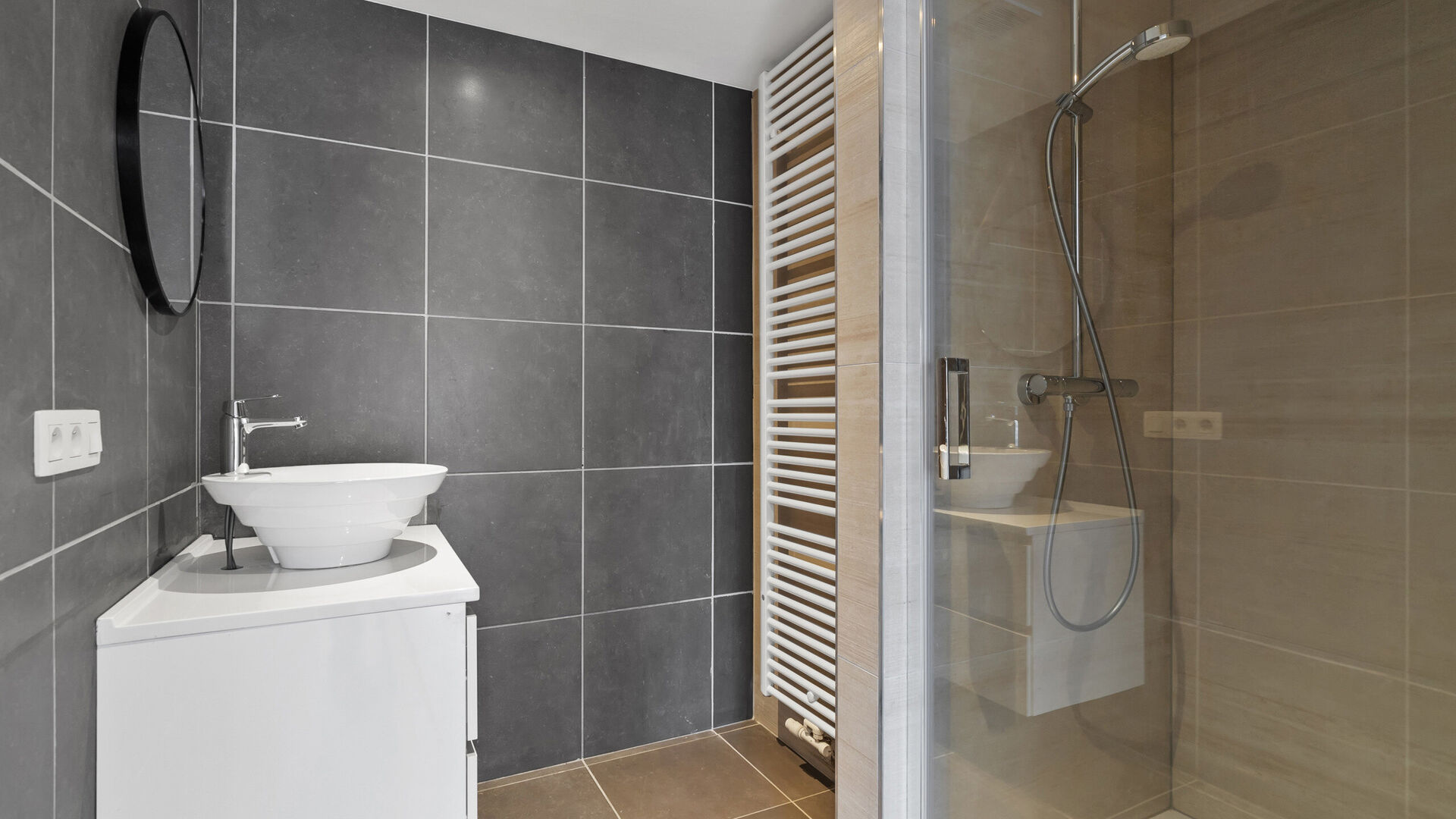 De keuken is volledig uitgerust met moderne apparatuur: een keramisch kookvuur, dampkap, koelkast, combi-oven/microgolf en vaatwasser, waardoor de ruimte zowel praktisch als stijlvol is. De badkamer heeft een strakke, moderne uitstraling met een inloopdouche met regendouche, een stijlvolle lavabo en een sierradiator die een extra touch toevoegt.