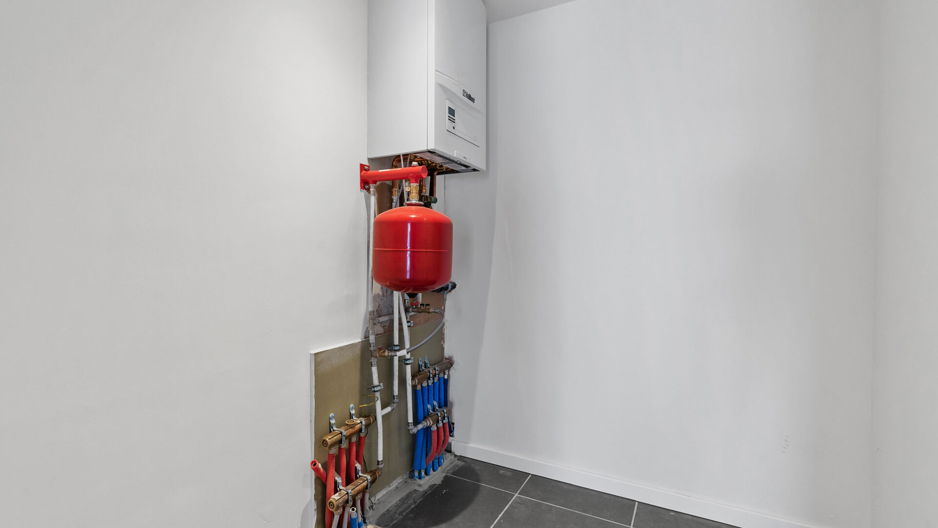 In de aparte berging is voldoende ruimte voor een wasmachine en droogkast, en hier bevindt zich ook de Vaillant gasketel.