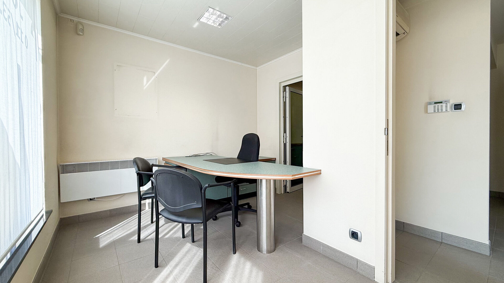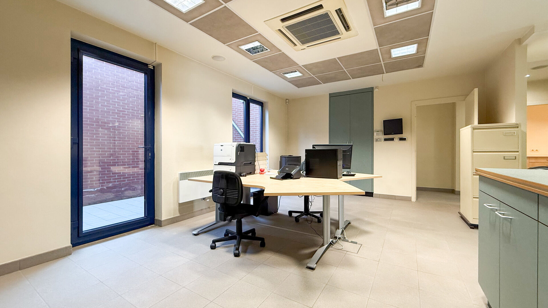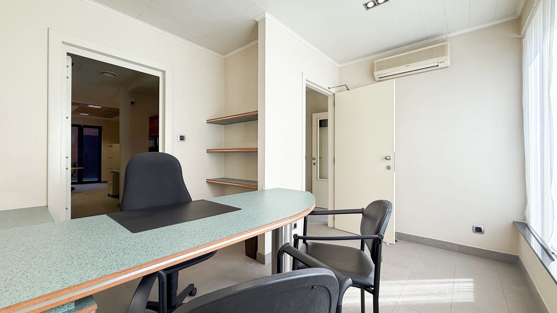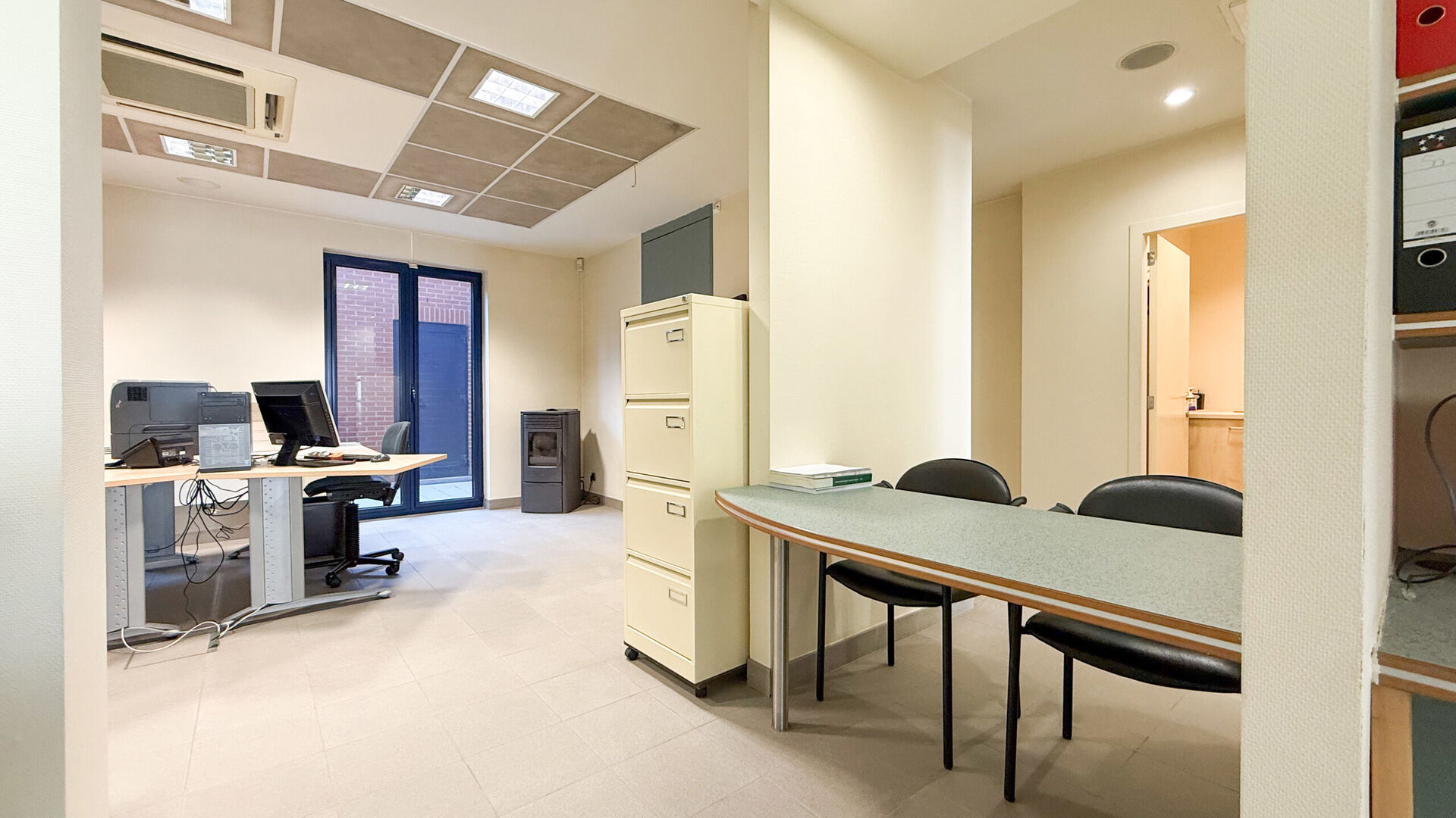 De doordachte inrichting voor efficiënte werking van een kantoor vallen hier meteen op: een multifunctionele ontvangstruimte met onthaalbalie en burelen, de onthaalbalie ligt centraal tussen 2 directieburelen; op het einde van de gang is er een grote vergaderzaal; die ook vlakbij de keuken ligt - handig voor de koffie; tussenruimte met ingebouwde met daarachter de sanitaire ruimte met een gescheiden toilet