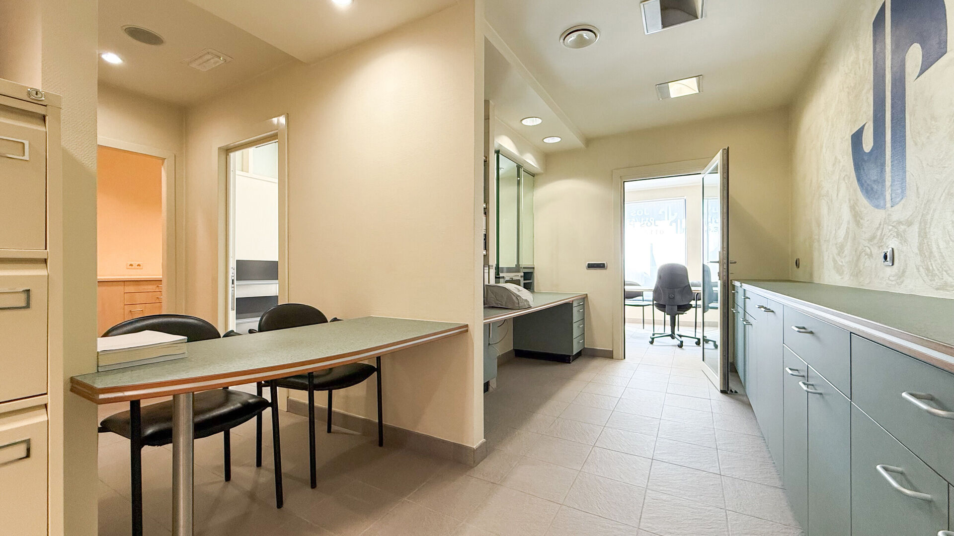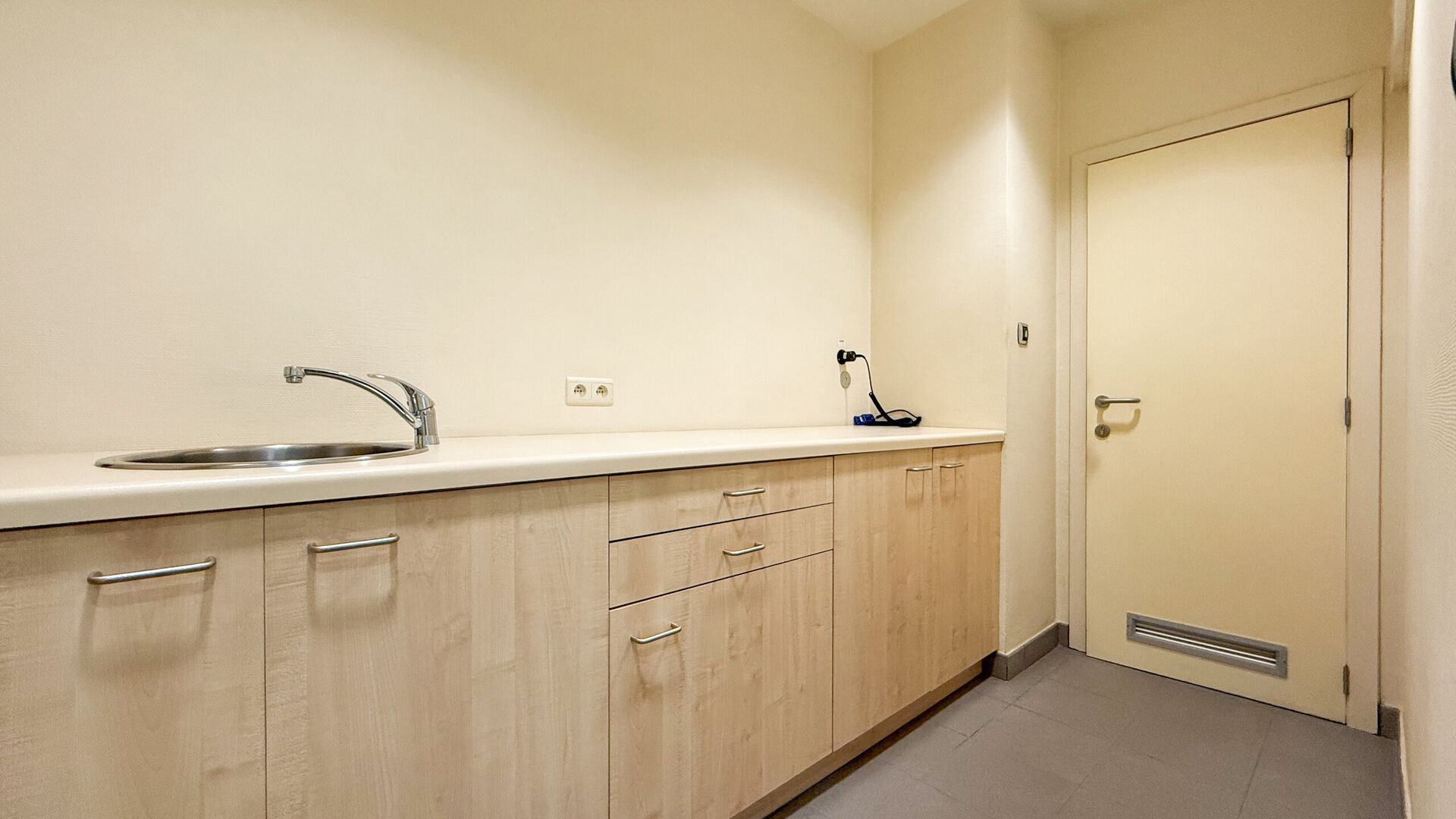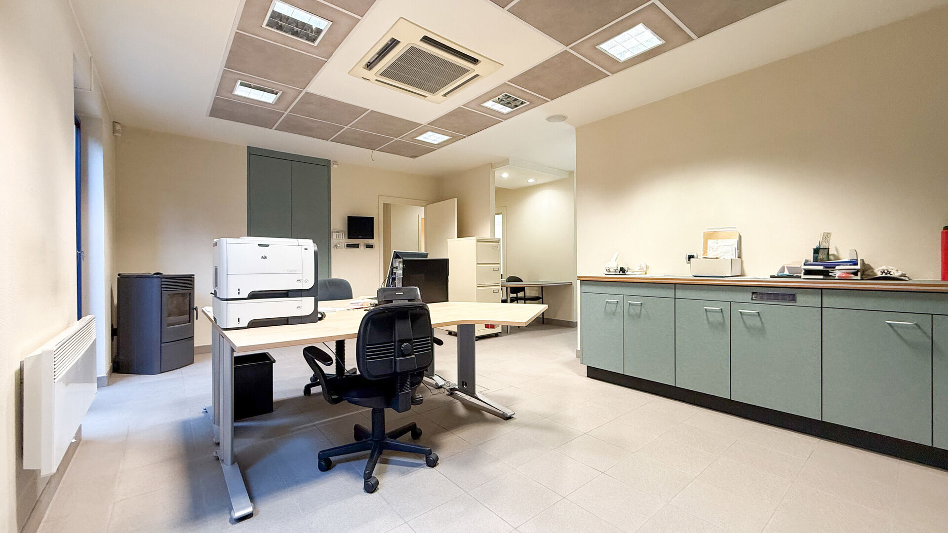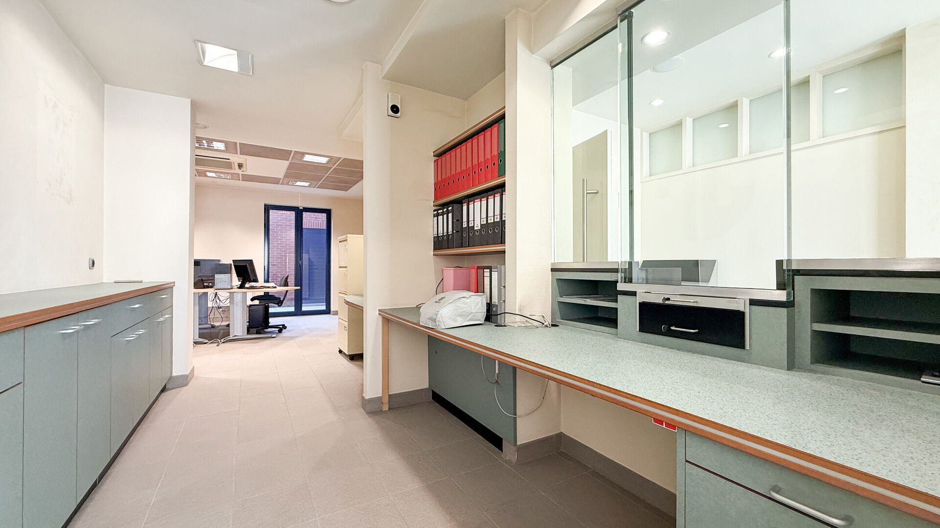 De doordachte inrichting voor efficiënte werking van een kantoor vallen hier meteen op: een multifunctionele ontvangstruimte met onthaalbalie en burelen, de onthaalbalie ligt centraal tussen 2 directieburelen; op het einde van de gang is er een grote vergaderzaal; die ook vlakbij de keuken ligt - handig voor de koffie; tussenruimte met ingebouwde met daarachter de sanitaire ruimte met een gescheiden toilet