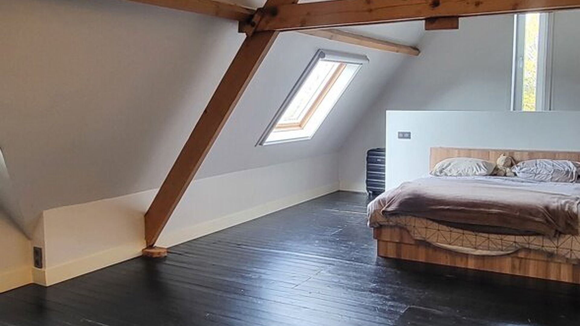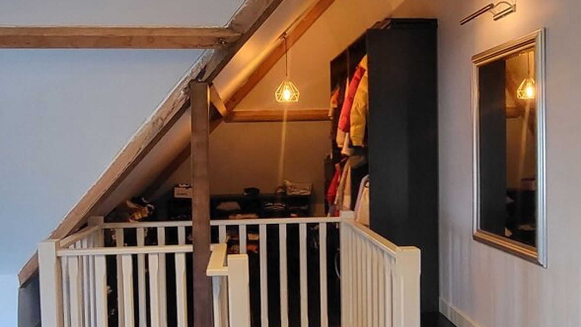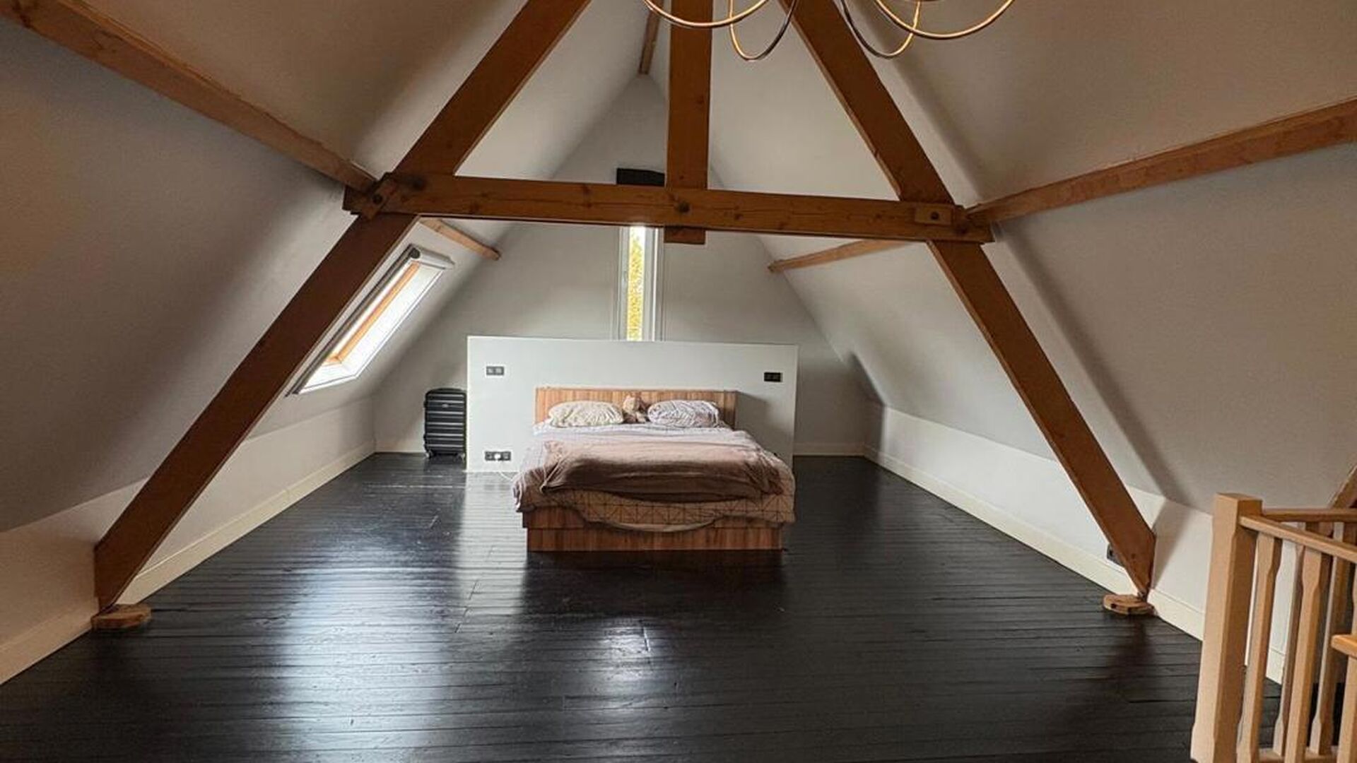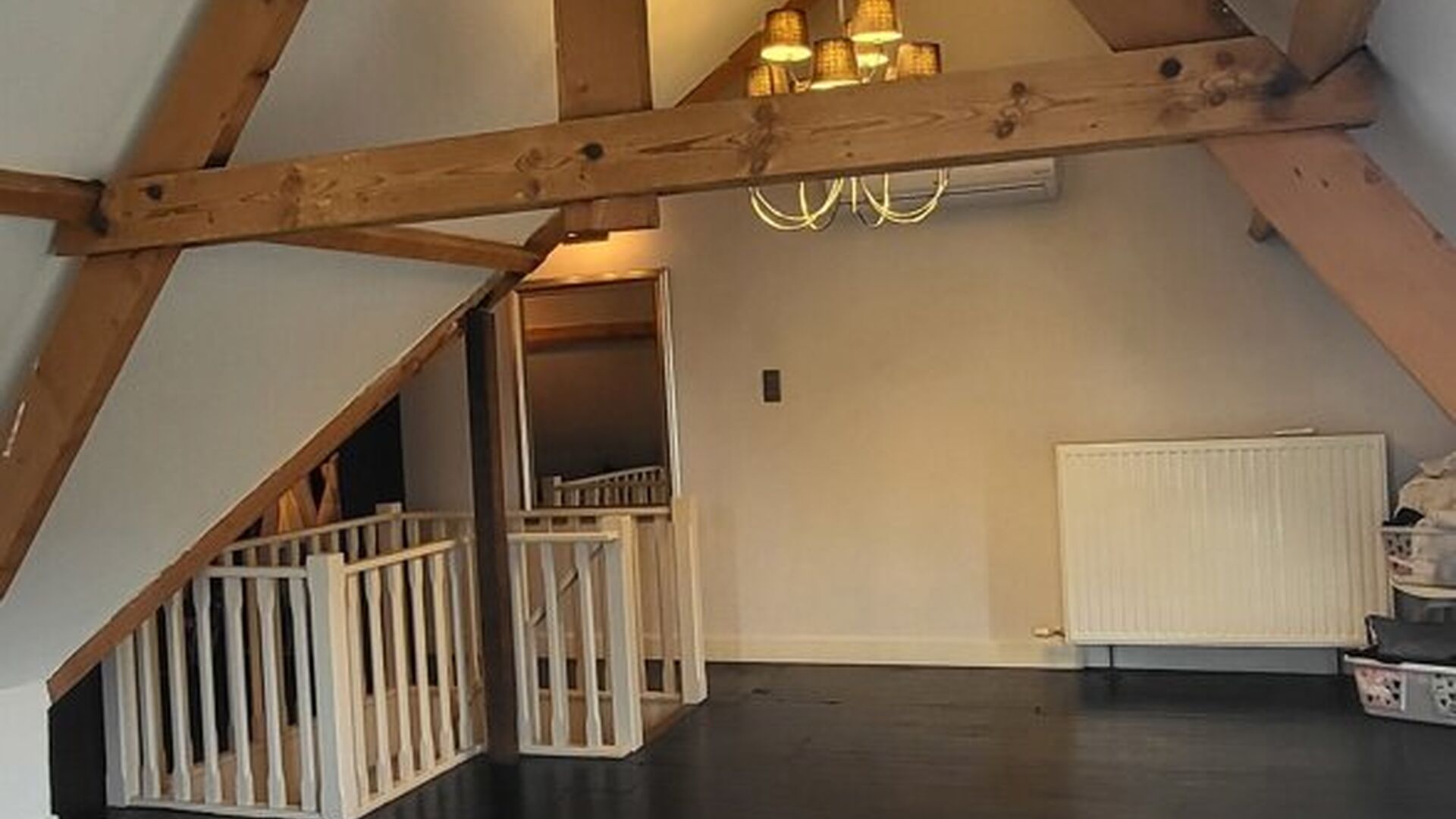 De trap naar de zolderverdieping heeft een witte balustrade en houten treden, wat een mooie overgang creëert naar de bovenverdieping. De zolderverdieping is omgebouwd tot een grote, sfeervolle slaapkamer, verdeeld in een slaapgedeelte en een inloopdressing. Daarnaast is er nog voldoende ruimte voor een speelkamer. De zoldervloer is afgewerkt met donkere laminaat en de muren zijn wit geverfd. Een Veluxraam zorgt voor natuurlijk licht.