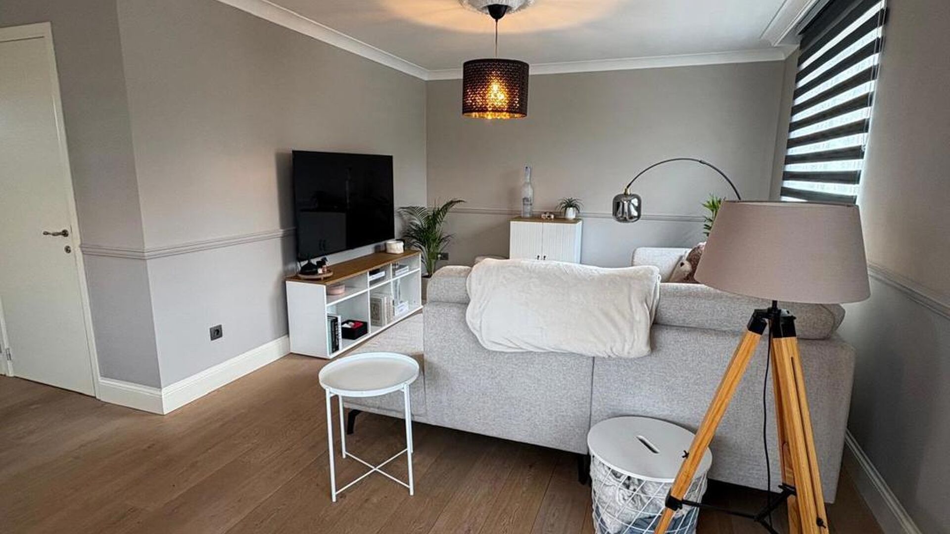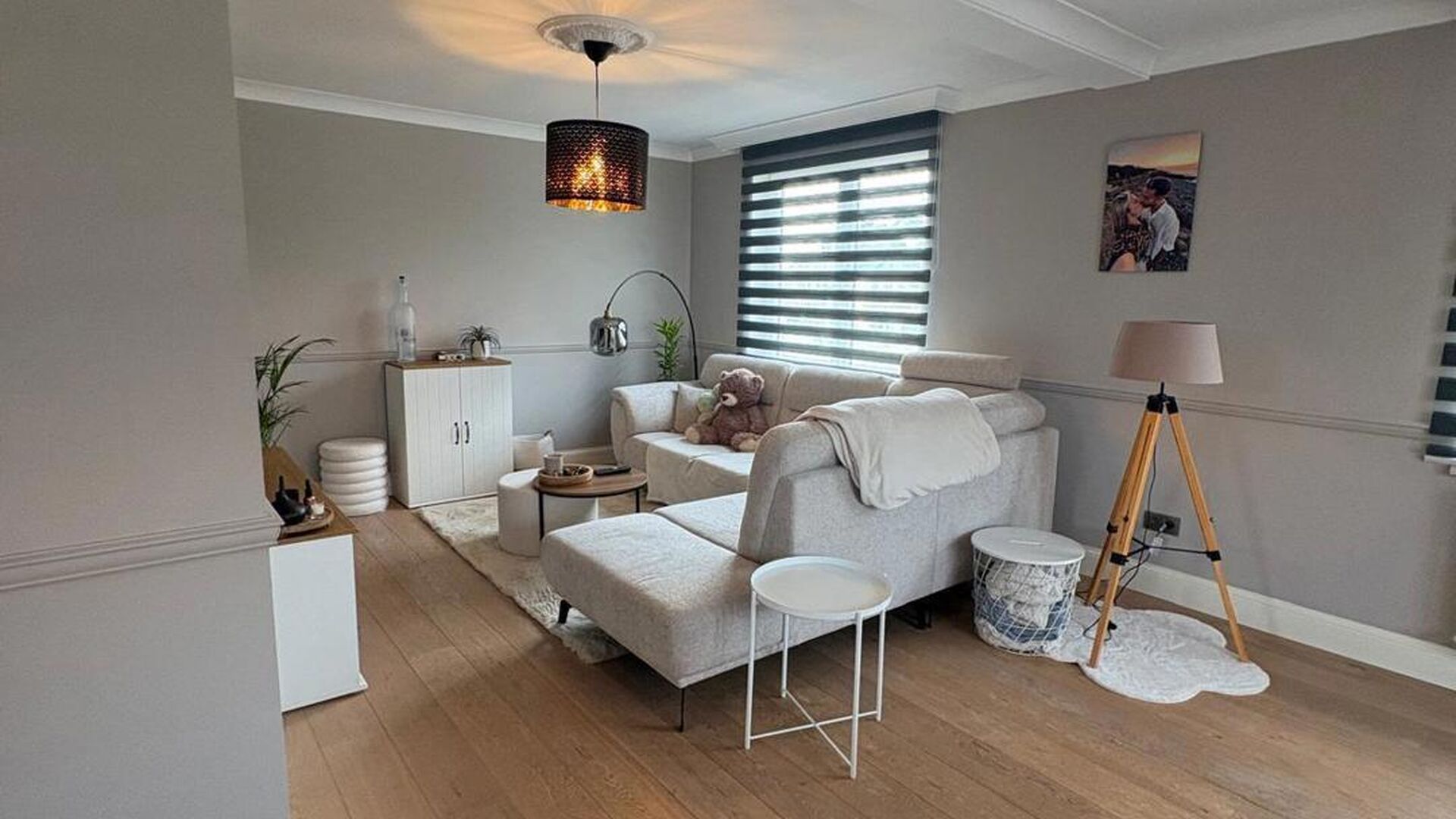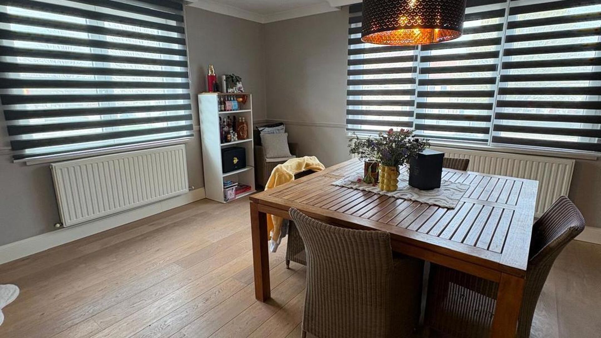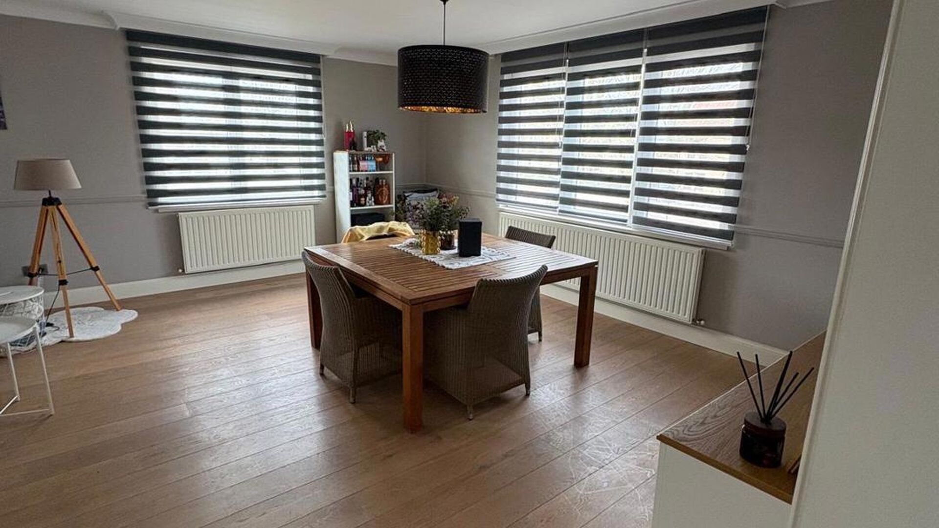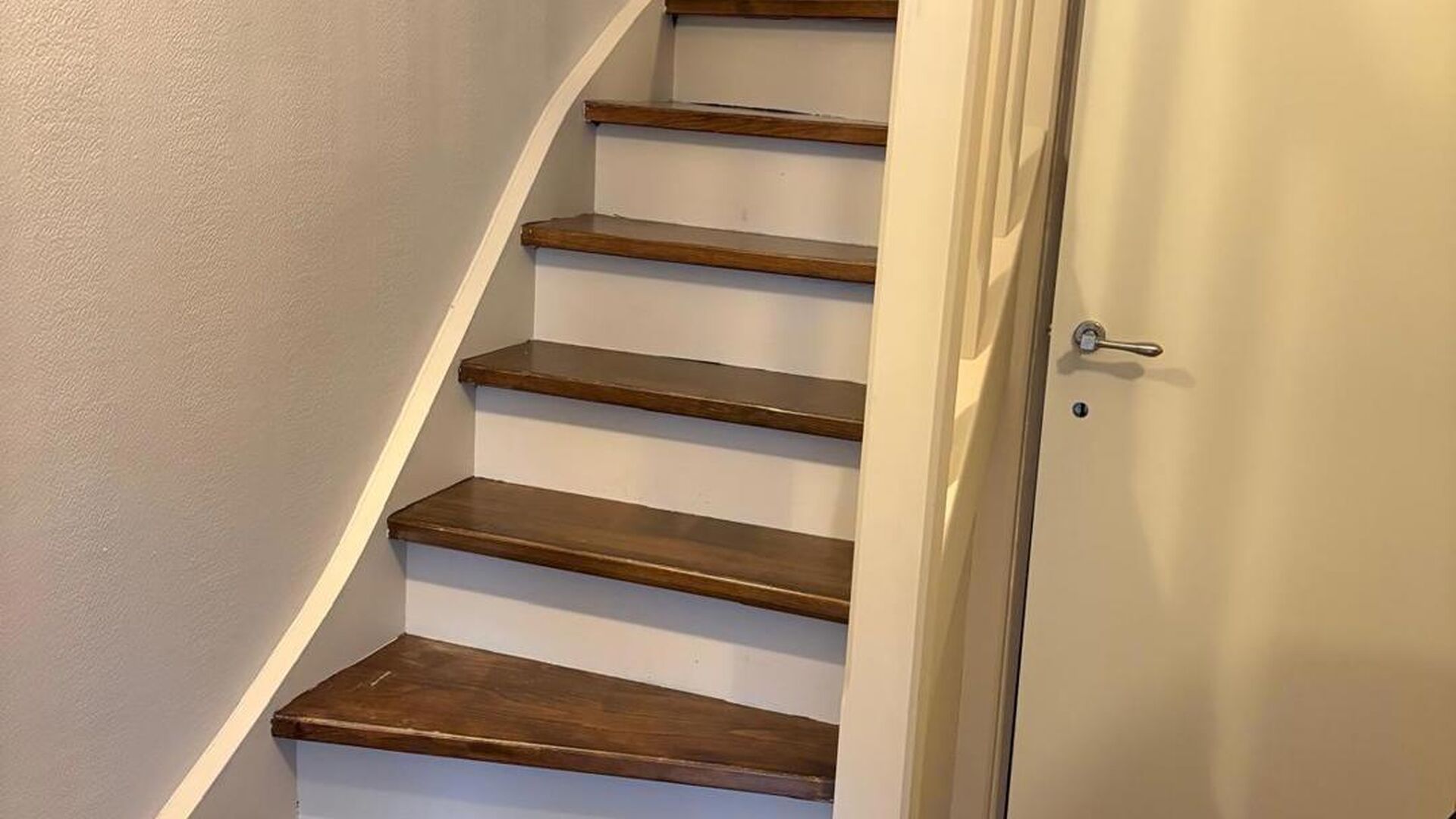 De trap naar de zolderverdieping heeft een witte balustrade en houten treden, wat een mooie overgang creëert naar de bovenverdieping. De zolderverdieping is omgebouwd tot een grote, sfeervolle slaapkamer, verdeeld in een slaapgedeelte en een inloopdressing. Daarnaast is er nog voldoende ruimte voor een speelkamer. De zoldervloer is afgewerkt met donkere laminaat en de muren zijn wit geverfd. Een Veluxraam zorgt voor natuurlijk licht.