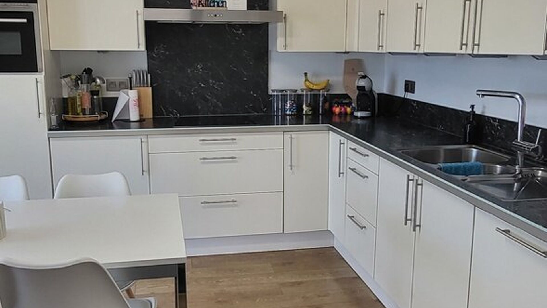 Op de eerste verdieping vindt u een moderne witte keuken en een ruime leefruimte, afgewerkt met een lichte laminaatvloer. De muren zijn geverfd in een elegant kleurenschema: de bovenkant is donkerbruin en de onderkant beige. Aansluitend is er een overdekte veranda, ideaal om buiten te zitten en te ontspannen. Verder vindt u op deze verdieping een badkamer met een zwarte natuurstenen vloer en witte muren. De badkamer is uitgerust met een wc, inloopdouche en een wastafel.