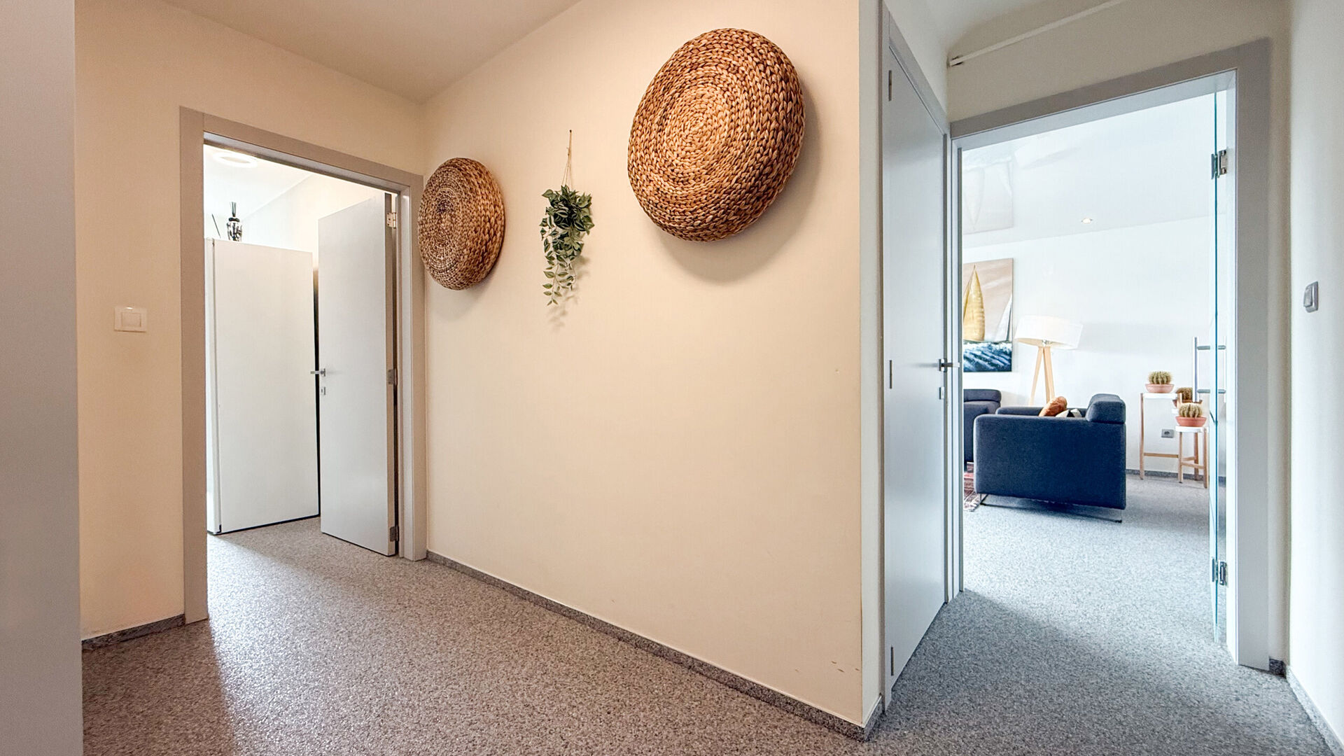 Links van de inkom bevindt zich het waskot en een praktische berging, met ruimte voor de inloopdouche. Vanuit deze ruimte is er eveneens toegang tot het terras. Via de grote schuifdeur in de woonkamer bereikt u het ruime zonneterras van maar liefst ca. 40 m², perfect om te ontspannen of gasten te ontvangen.