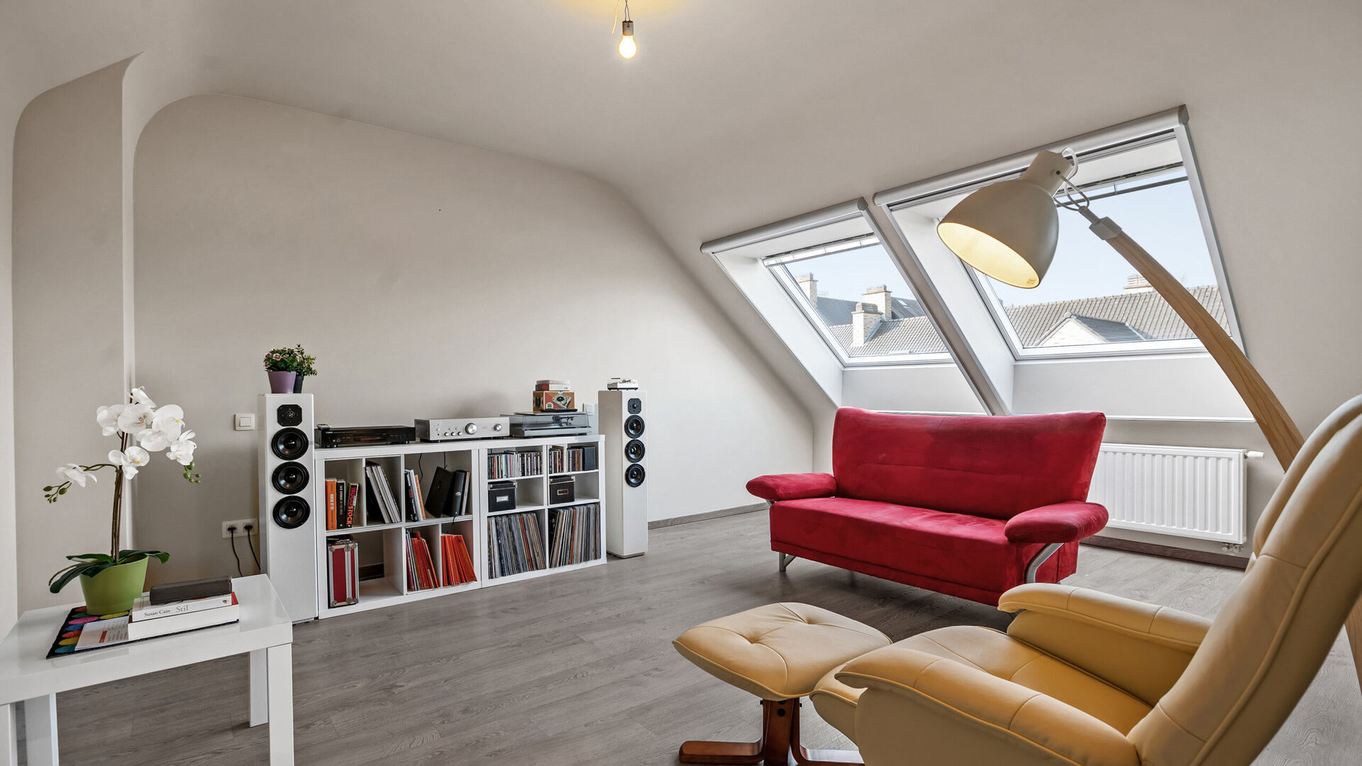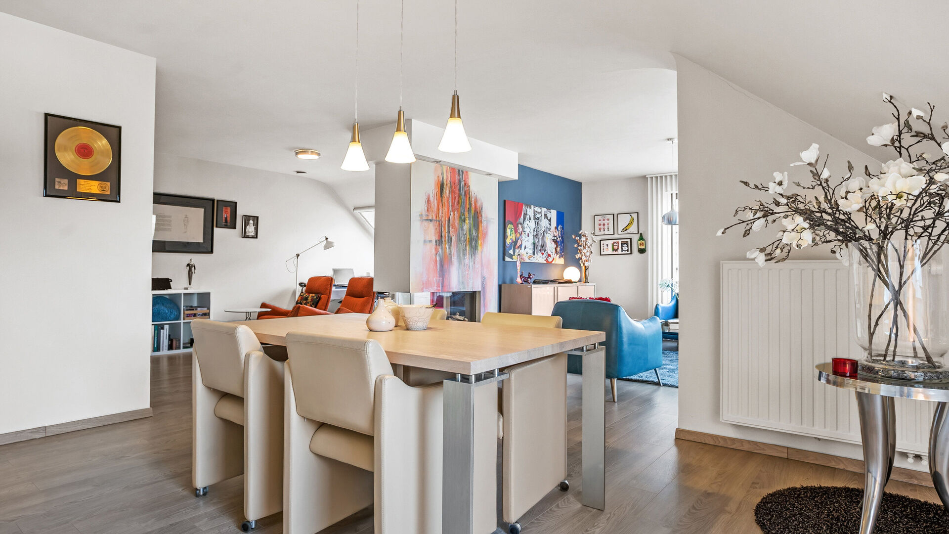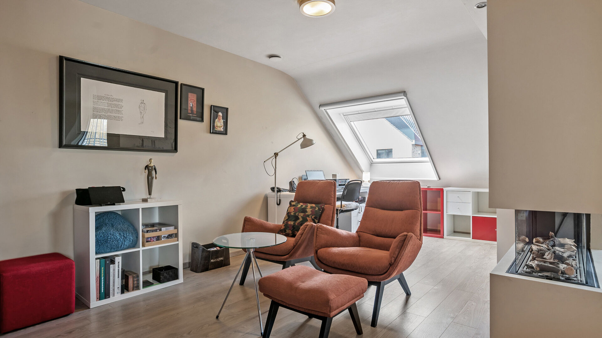 Het appartement strekt zich uit over de tweede en derde verdieping van een goed onderhouden gebouw. Bij binnenkomst op de tweede verdieping kom je in een ruime inkomhal met gastentoilet. Aansluitend tref je de indrukwekkende leefruimte aan, voorzien van grote raampartijen die zorgen voor overvloedig daglicht en een gezellige open haard die warmte en sfeer brengt. Deze ruimte is ingedeeld met een zithoek, een eetgedeelte en voldoende plek voor een bureau of leeshoek. Via de leefruimte bereik je het zonnige terras aan de voorzijde, waar je heerlijk kunt genieten van de buitenlucht.