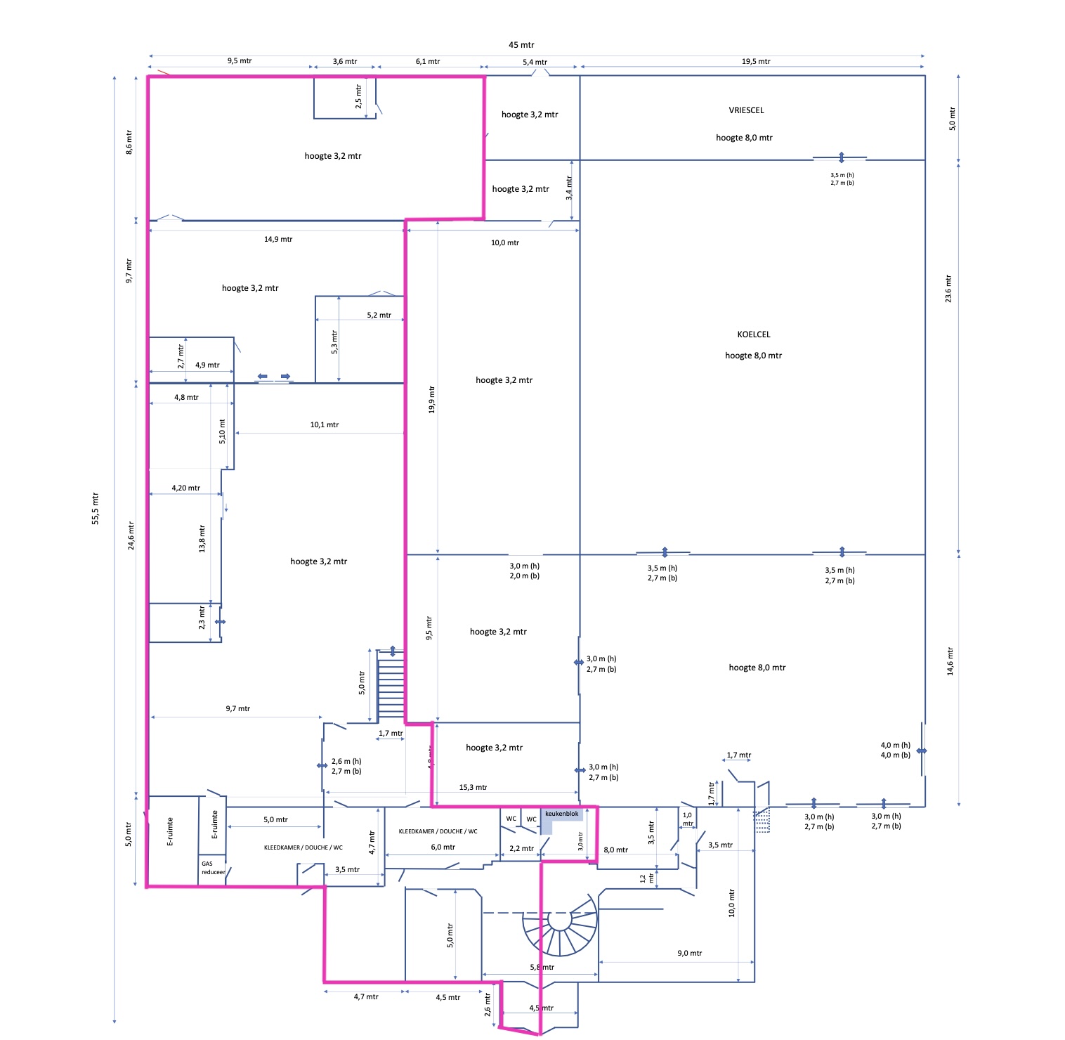 - Gelijkvloers: Naast kantoorruimtes en een gemeenschappelijke inkomhal, omvat het gelijkvloers kleedkamers, douches, toiletten en een bedrijfshal. De maximale vrije hoogte in de bedrijfshal bedraagt 8 meter, met een vloerbelasting van 2.500 kg/m².