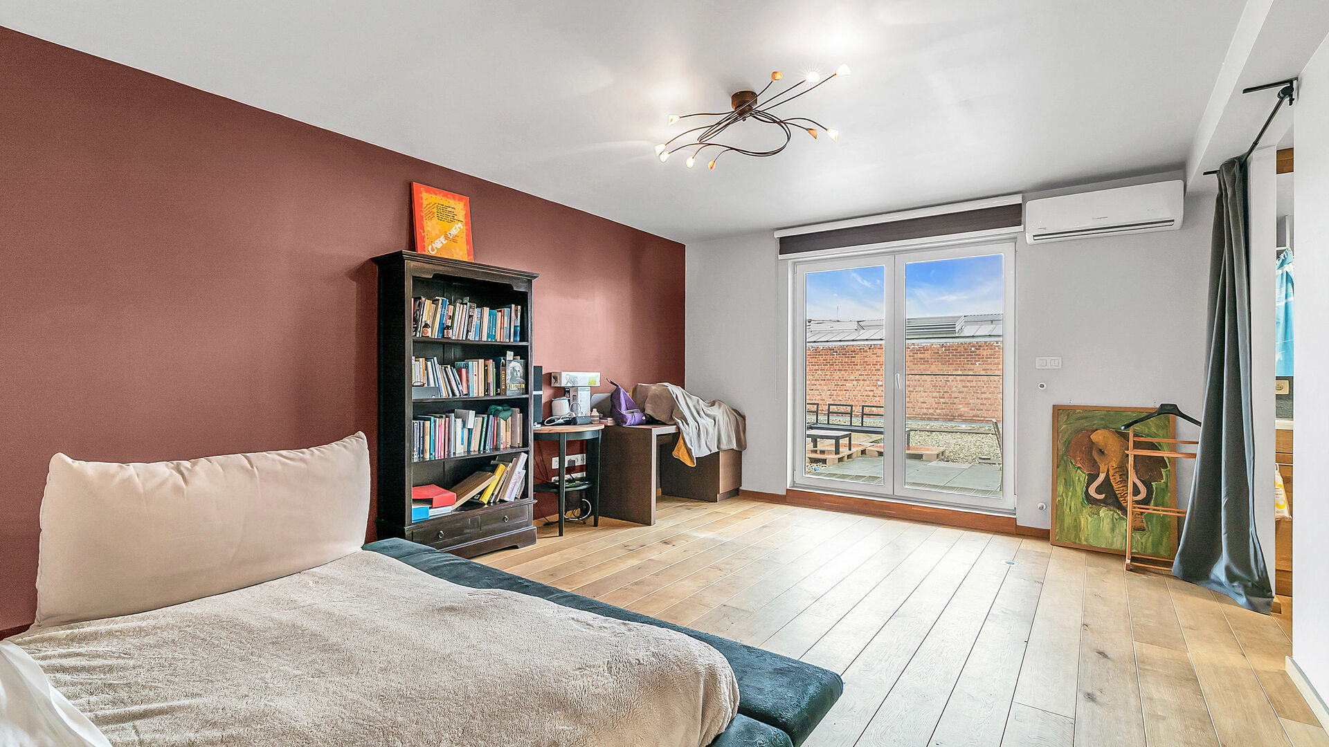 Op de eerste verdieping bevindt zich een ruime conciërgewoning (met mogelijkheid tot herbestemming naar kantoorruimte). Deze woonst beschikt over een zeer ruim dakterras en een lichtrijke veranda met vloerverwarming. Verder omvat ze een ruime woonkamer, een volledig geïnstalleerde keuken, één master bedroom met dressing en en-suite badkamer, twee bijkomende slaapkamers en een extra badkamer. De slaapkamers en keuken zijn bovendien voorzien van airconditioning.