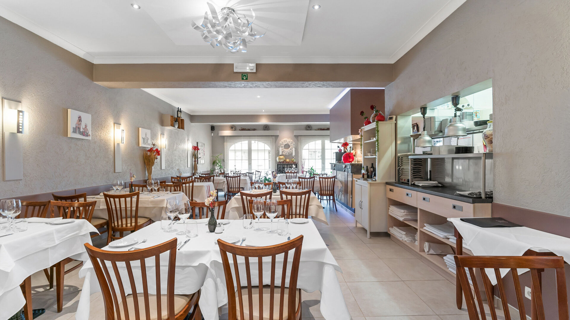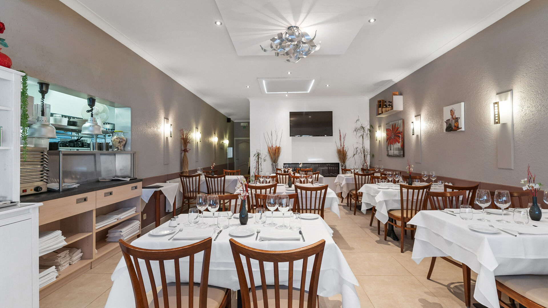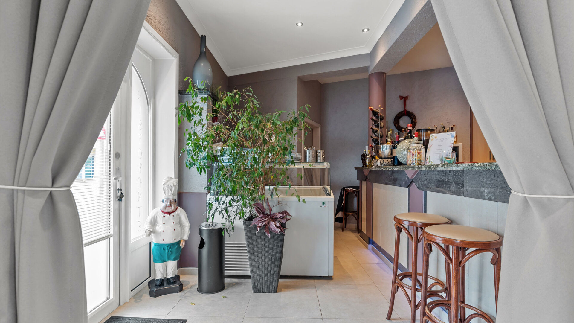 Het handelspand straalt authenticiteit en gezelligheid uit en is goed onderhouden. Een lichte, grote tegelvloer loopt doorheen het volledige pand en zorgt voor een frisse uitstraling en een praktisch onderhoud. De huidige indeling omvat een ruime ontvangstruimte met centrale toog/balie, ideaal te benutten als toonbank, servicepunt of onthaal.