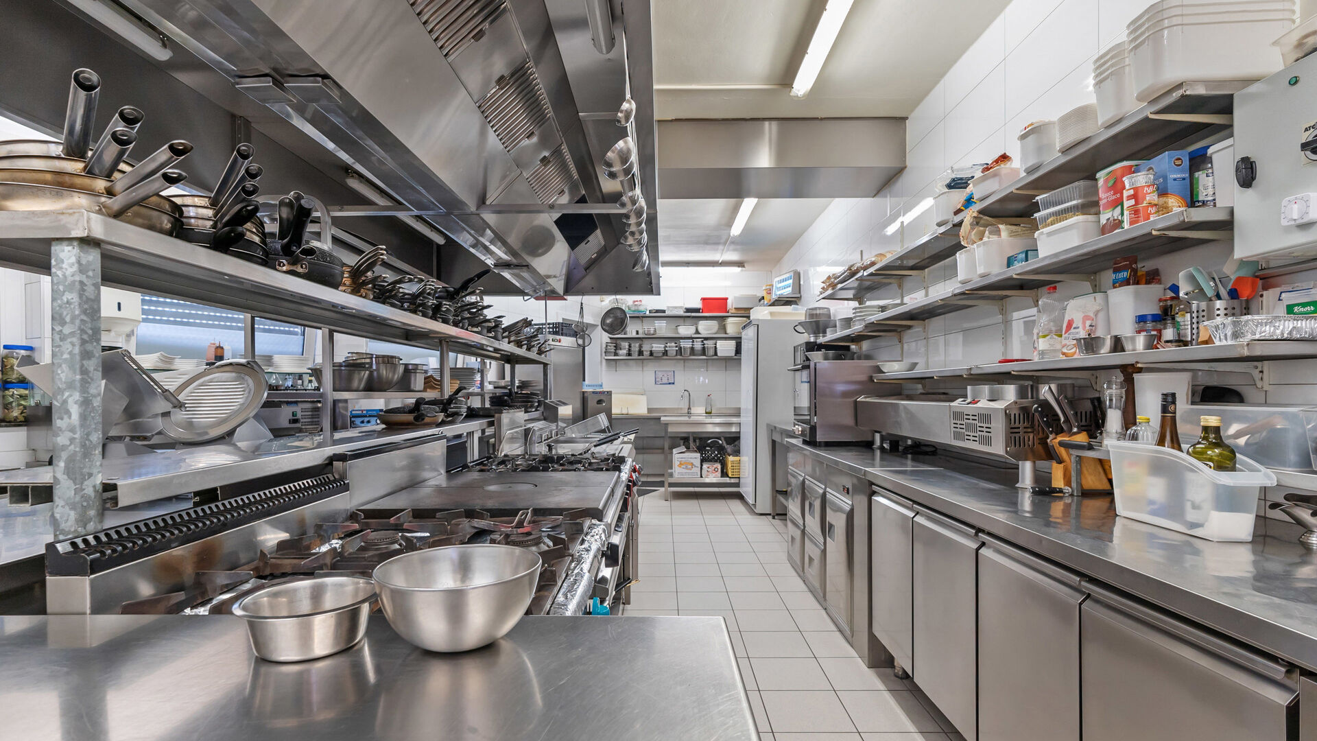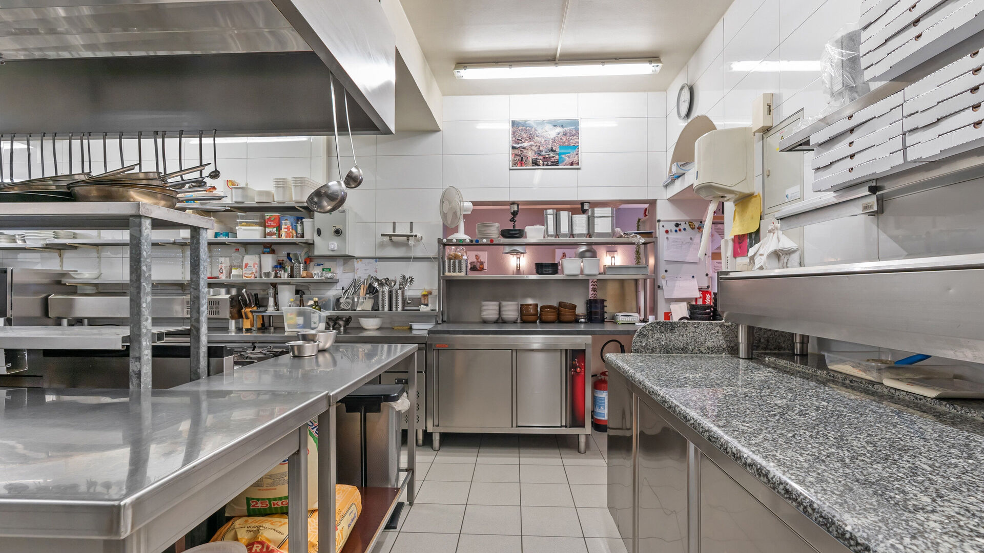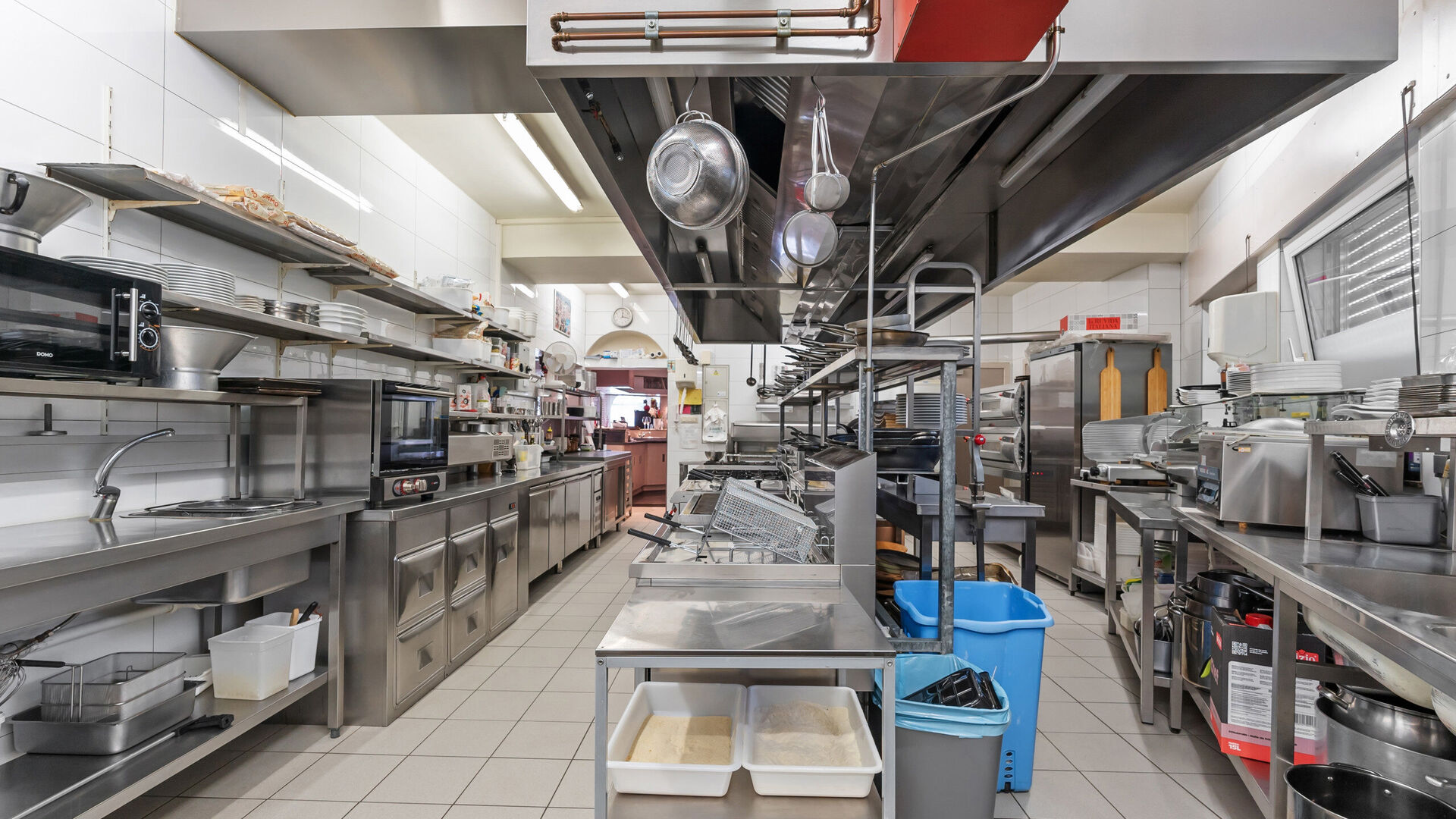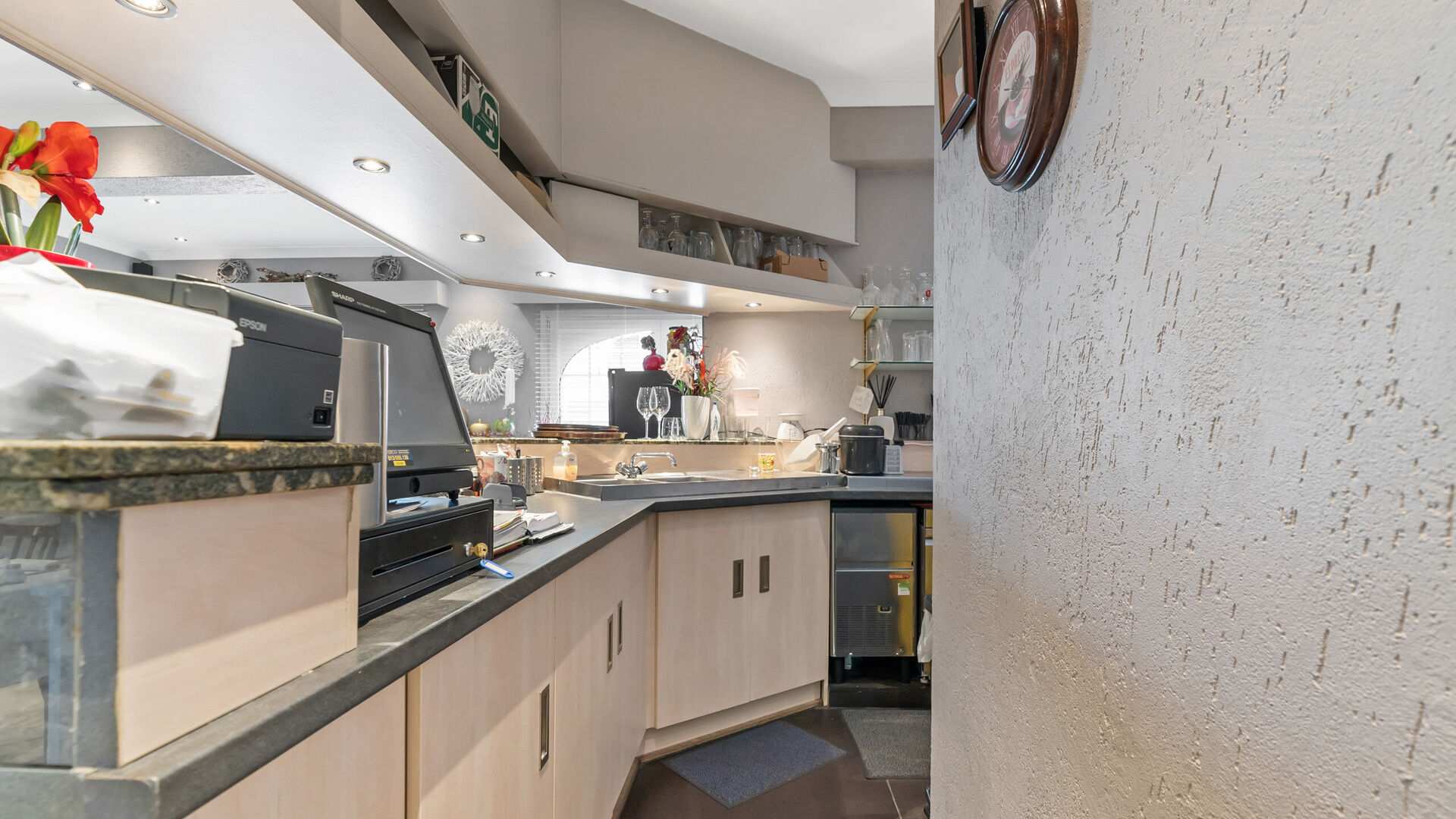 Opzij van de balie bevindt zich een grote bijkomende ruimte die flexibel inzetbaar is voor diversere commerciële concepten die nood hebben aan stockage- of werkruimte, magazijn, staffruimte, keuken, praktijkruimte, winkelruimte etc…