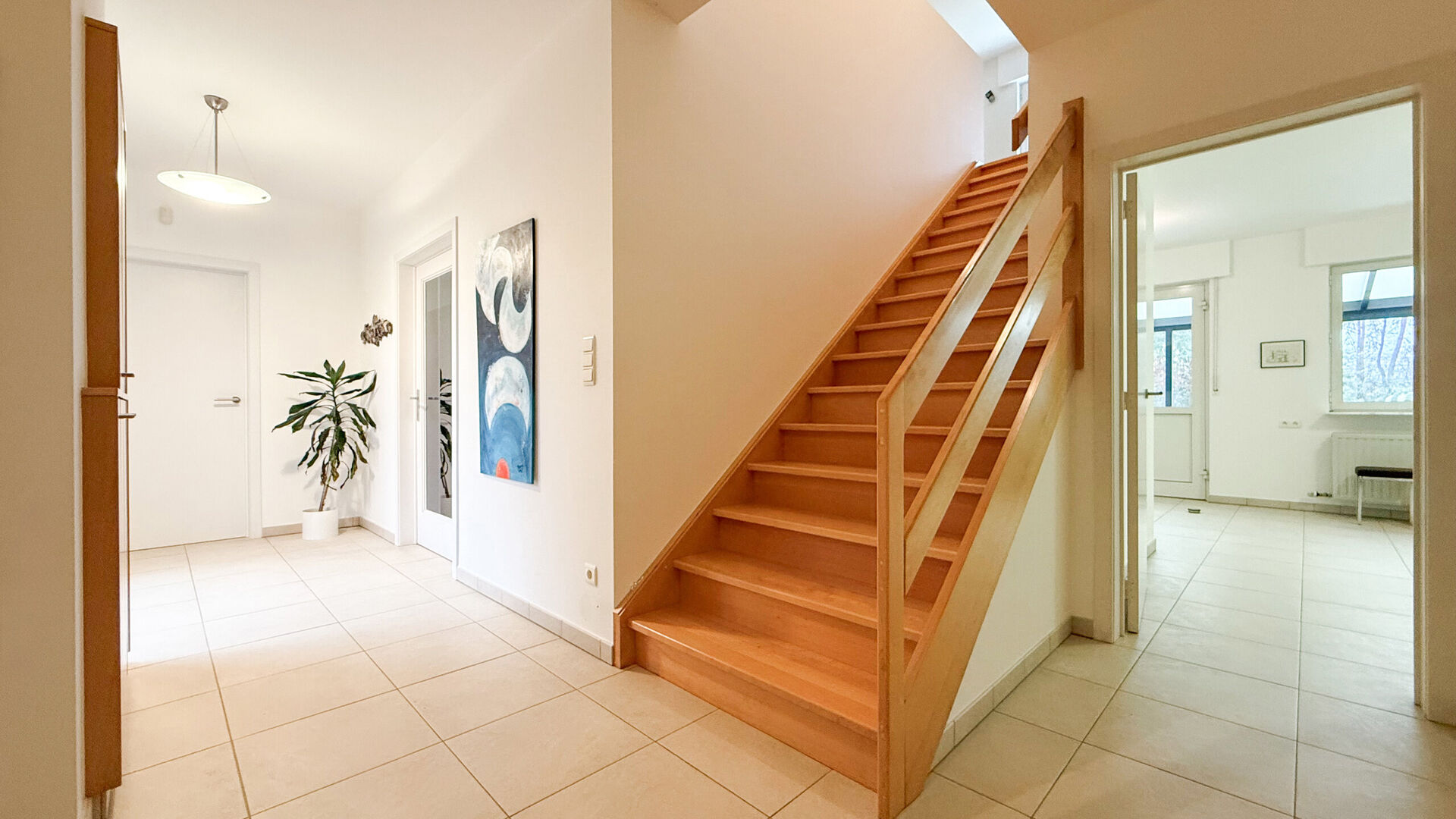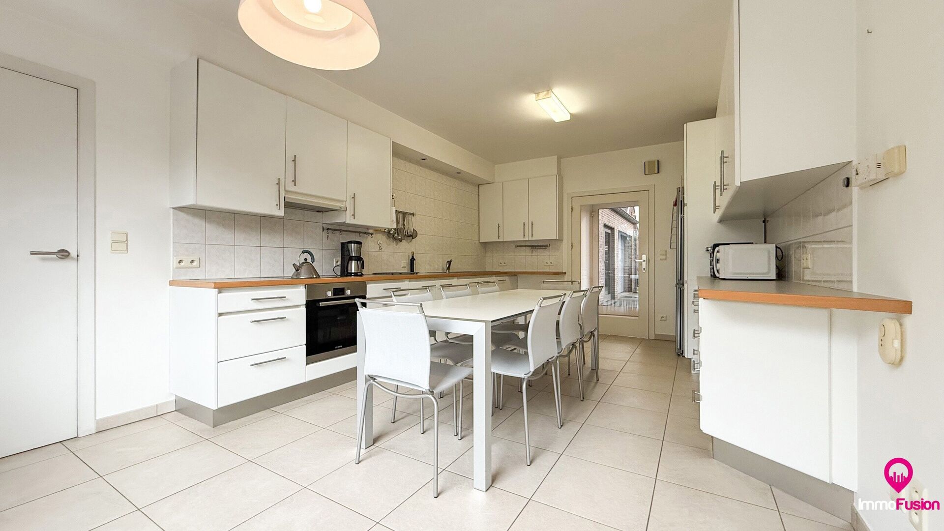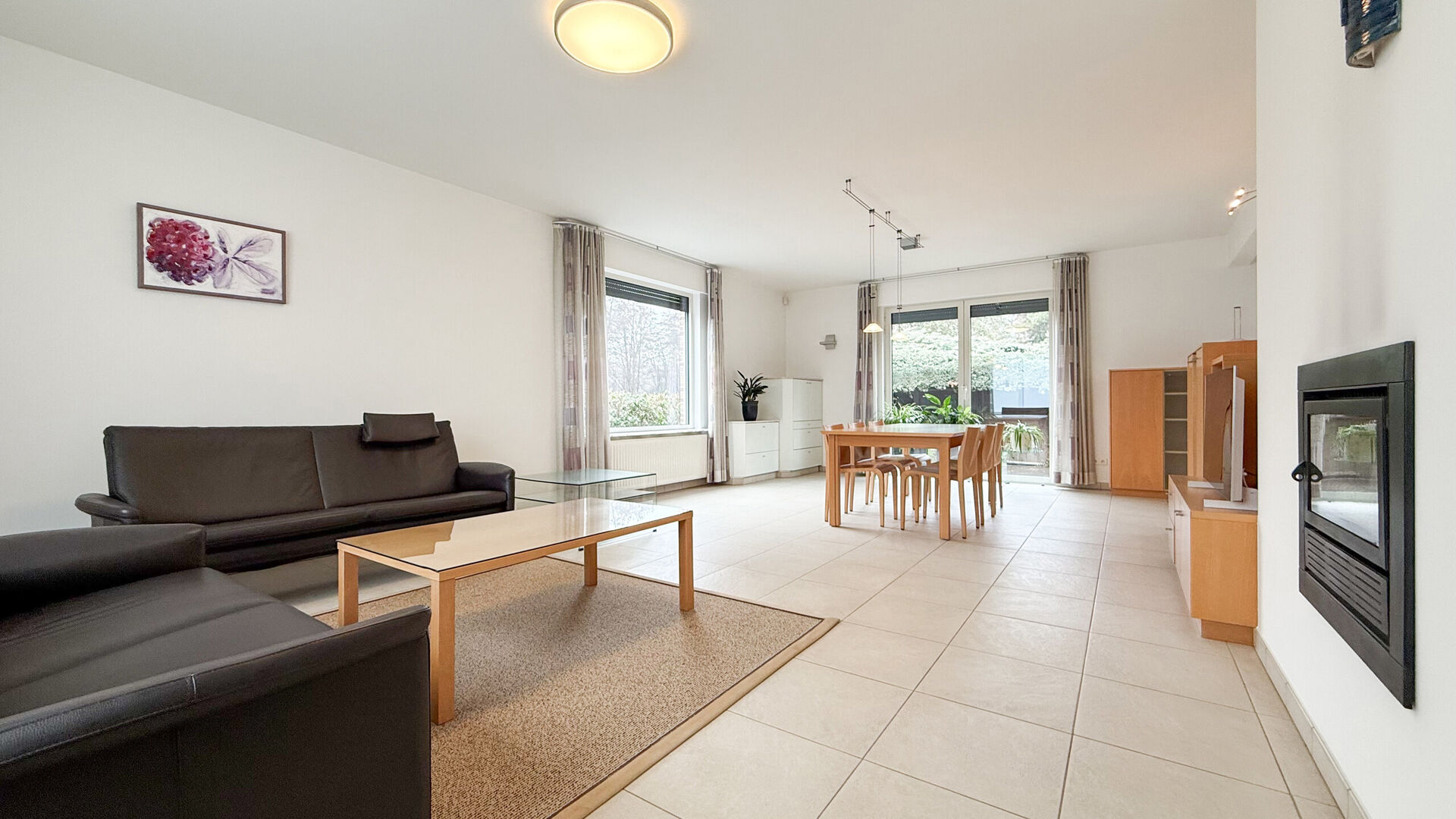 Via de inkomhal betreden we de woning. Links bevindt zich de lichtrijke living met gezellige haard. Dankzij de vele ramen geniet u hier van een overvloed aan natuurlijke lichtinval. Vanuit de leefruimte is er een mooie doorloop naar de keuken, wat zorgt voor een aangename en open sfeer.