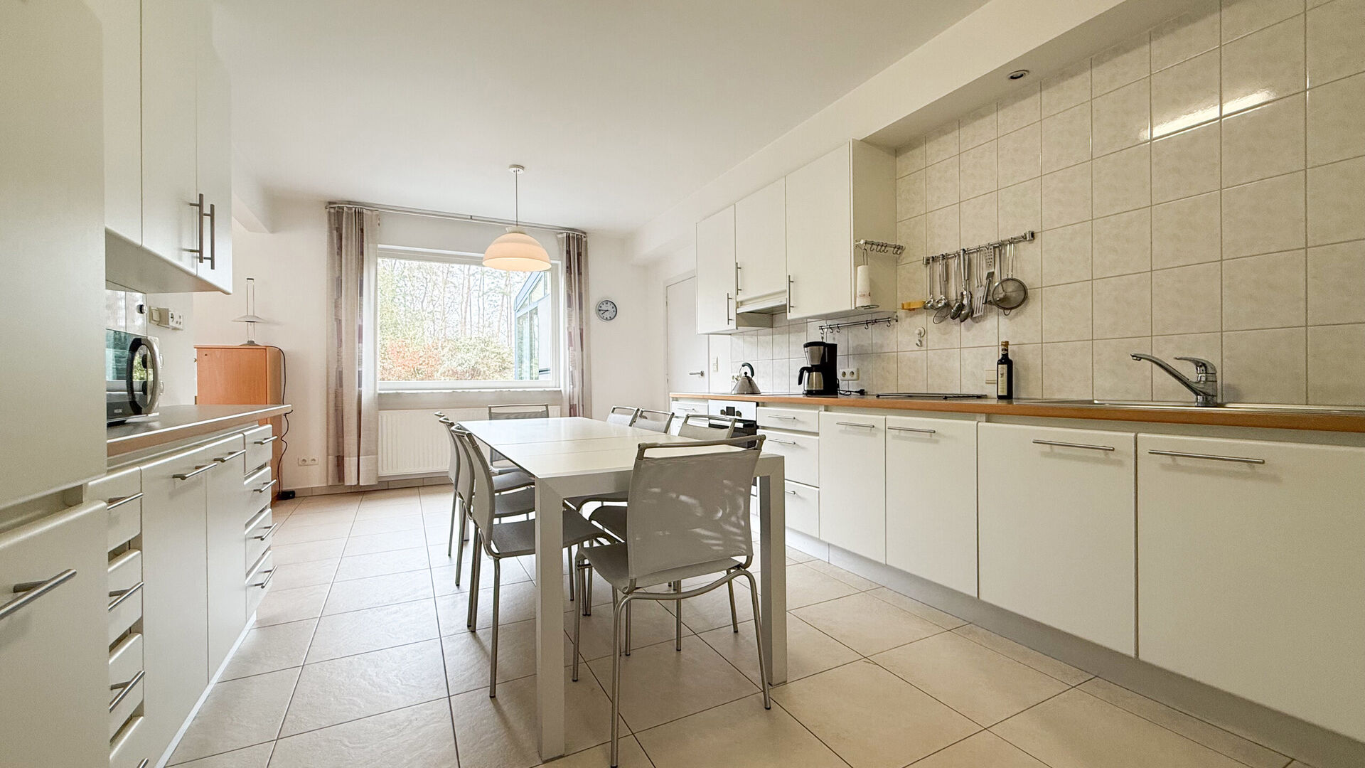 De keuken is uitgerust met een groot keukenmeubel met veel opbergruimte, een ingebouwd inductievuur, oven, dampkap en spoelbak. Er is voldoende plaats voor een eettafel en bovendien bestaat de mogelijkheid om een kookeiland te installeren.