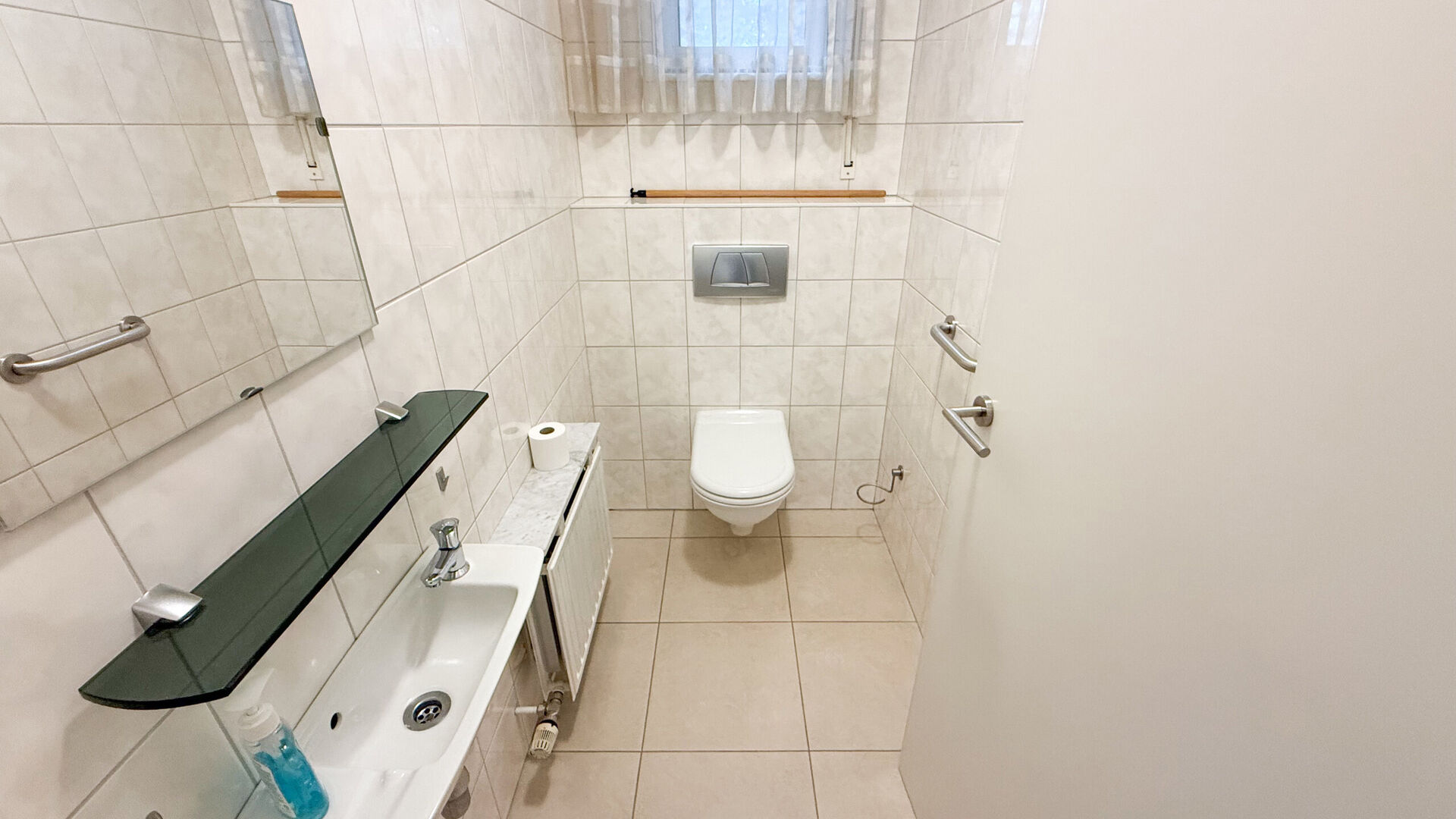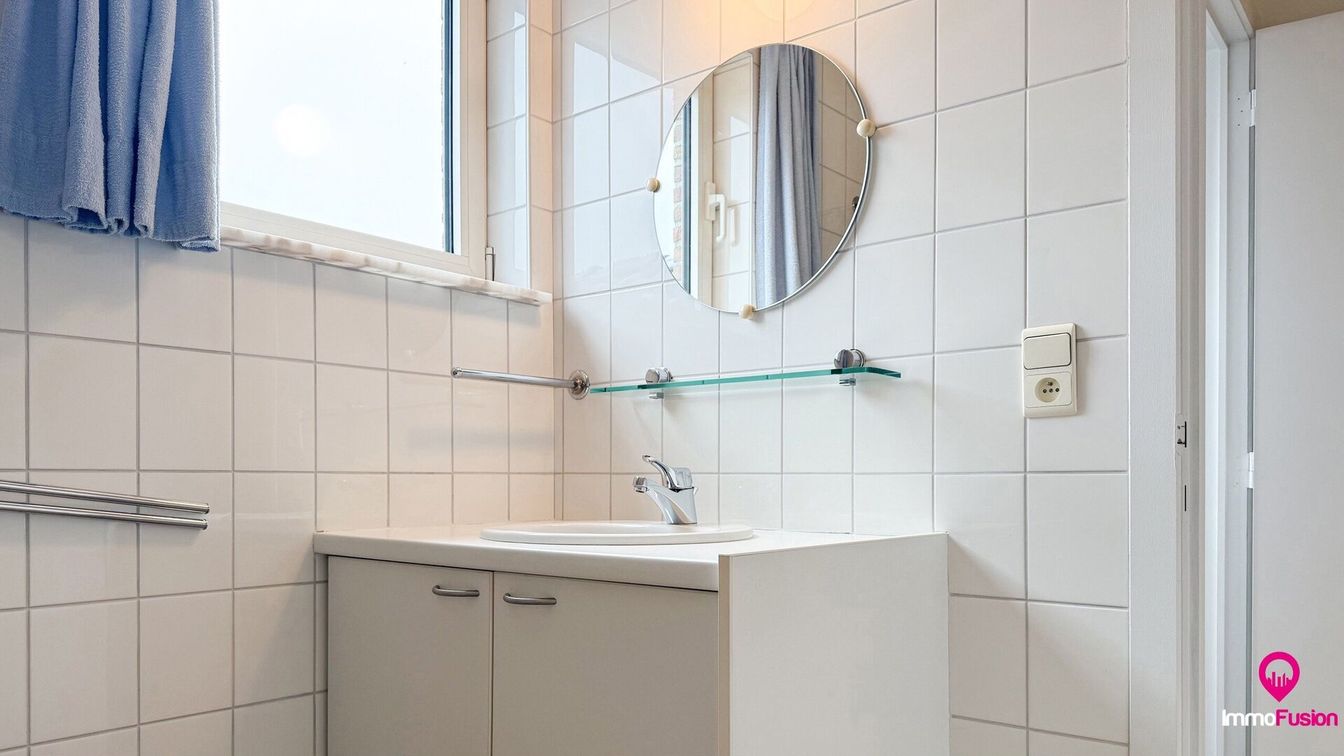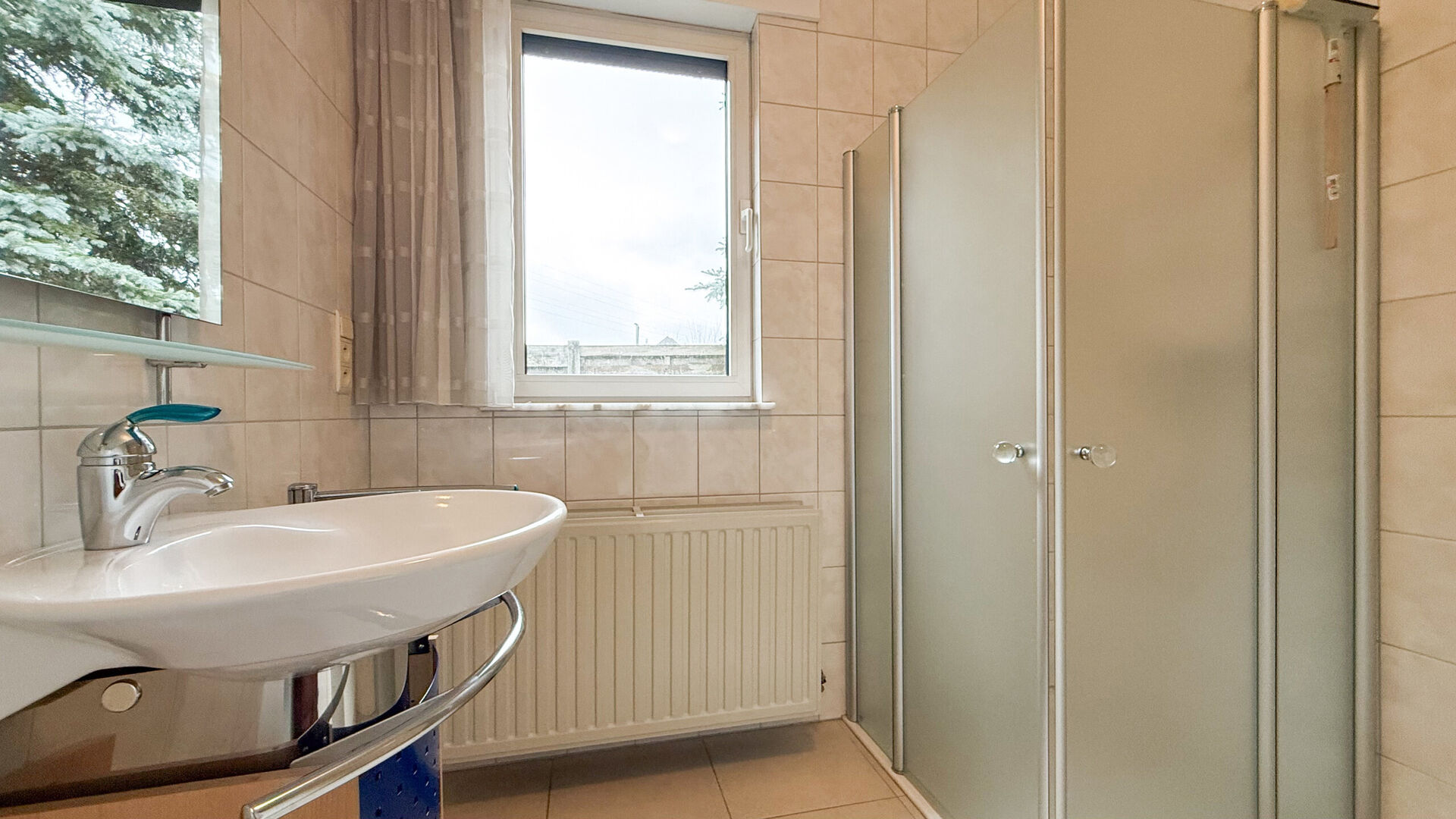 Op het gelijkvloers bevindt zich eveneens een badkamer met douchecabine en pompbak, alsook een ruime gastentoilet in de hal.