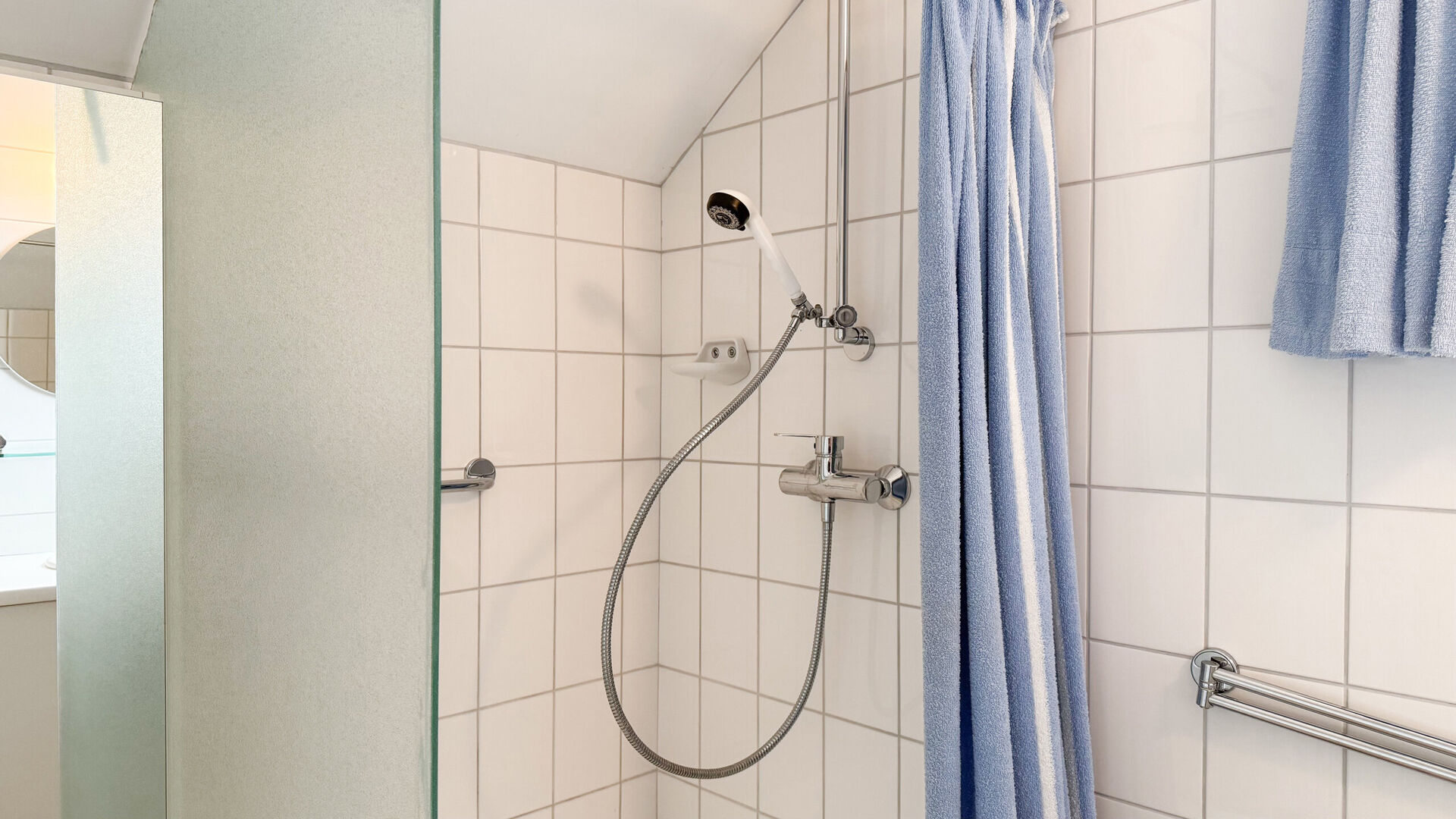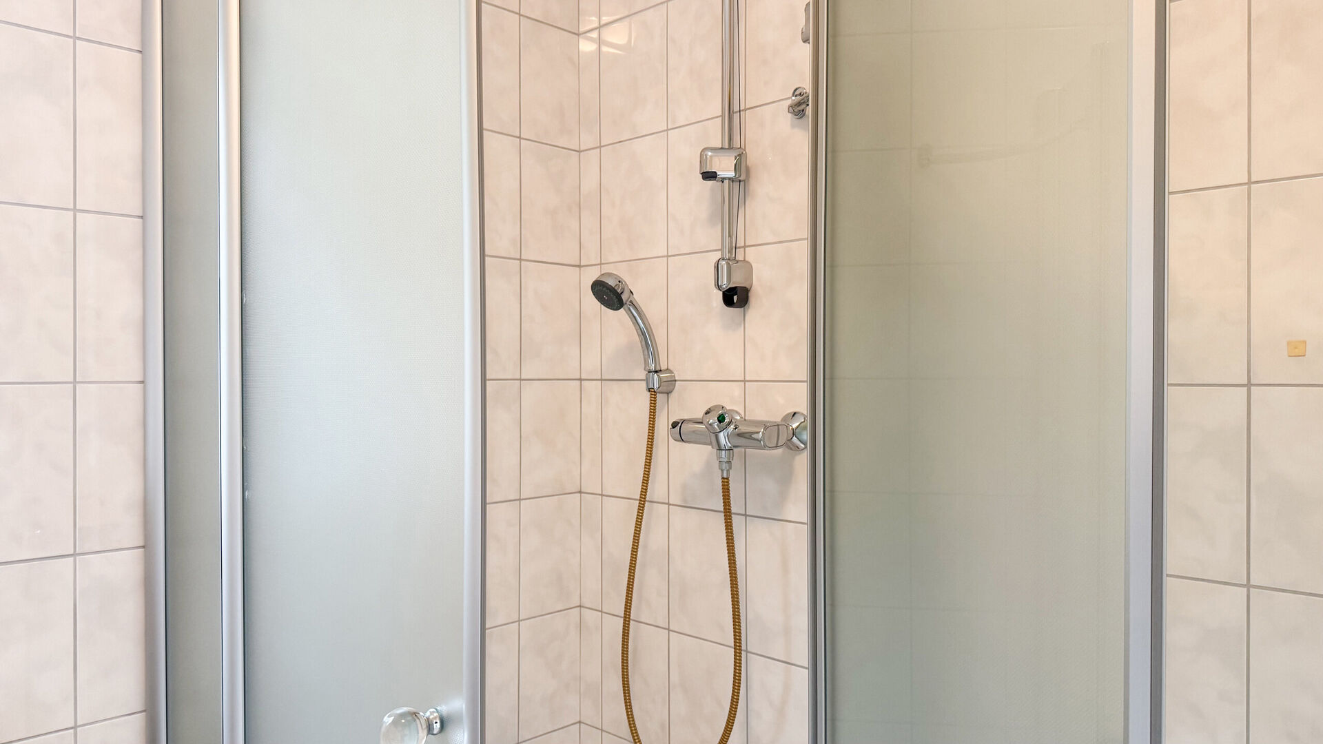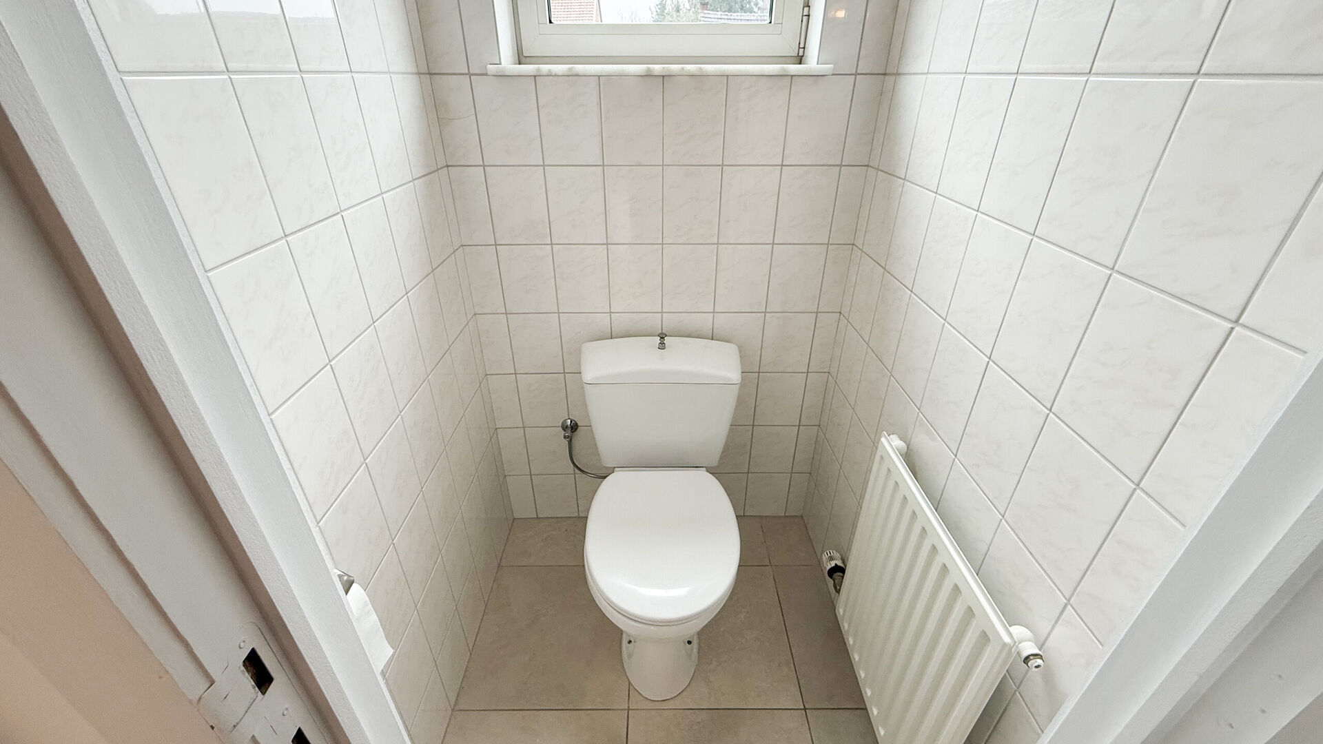Op het gelijkvloers bevindt zich eveneens een badkamer met douchecabine en pompbak, alsook een ruime gastentoilet in de hal.