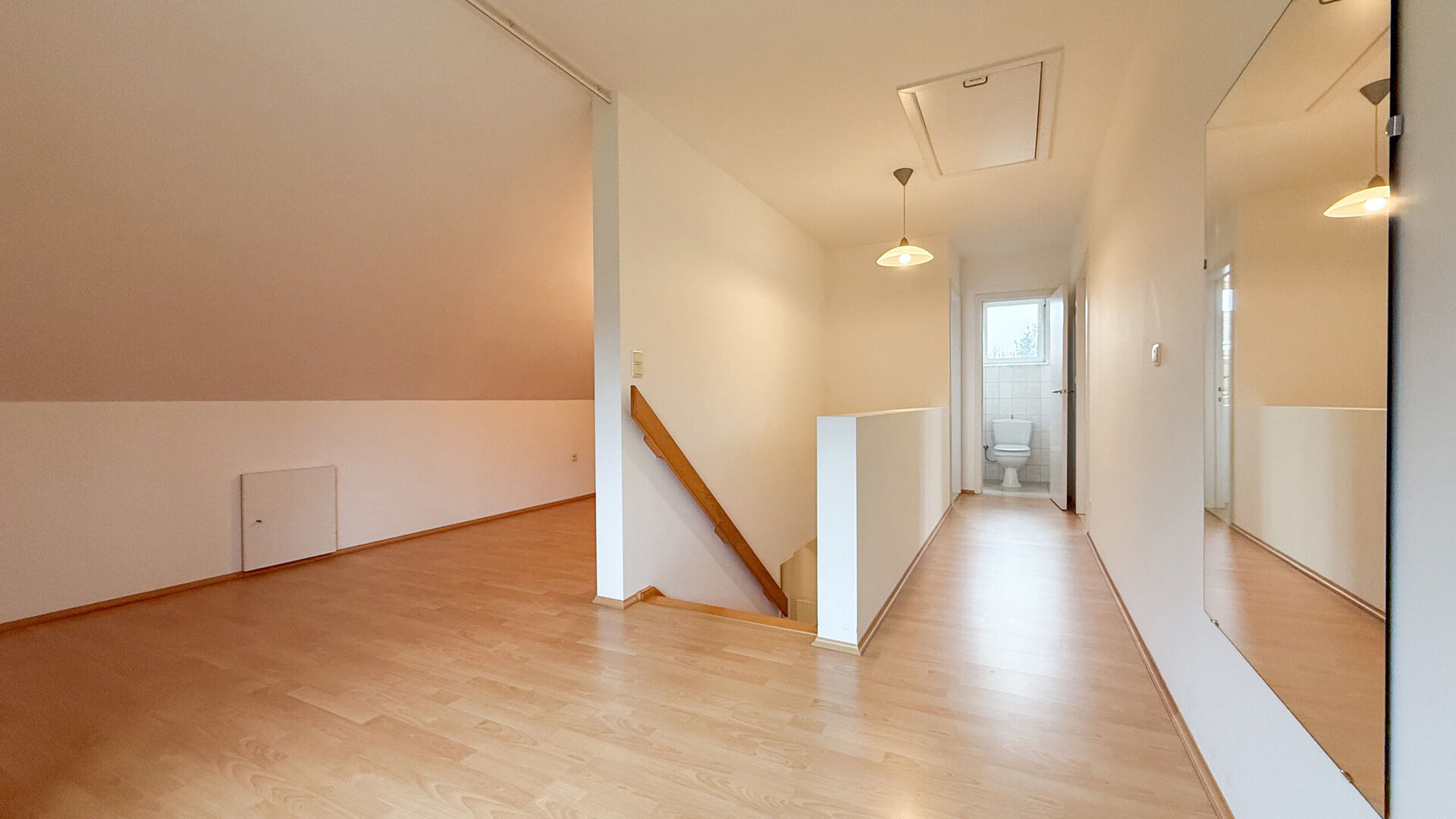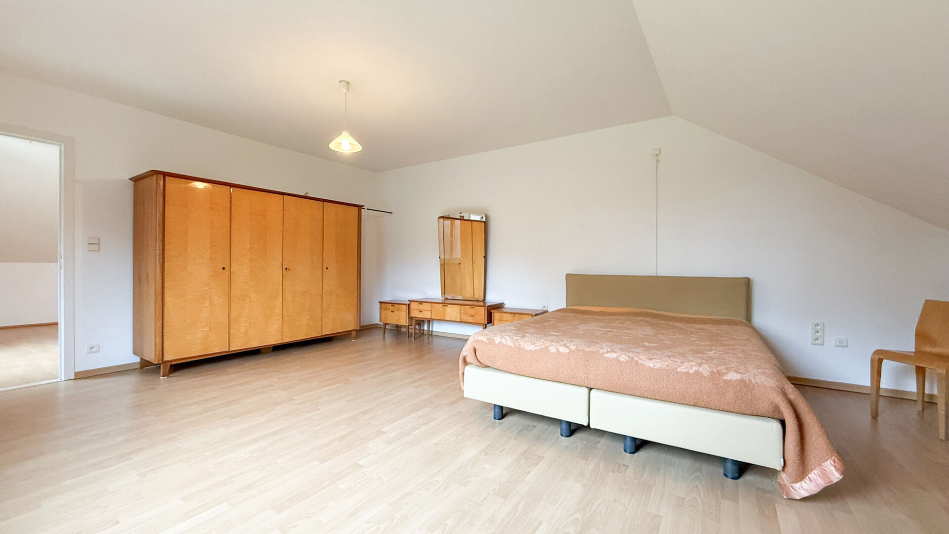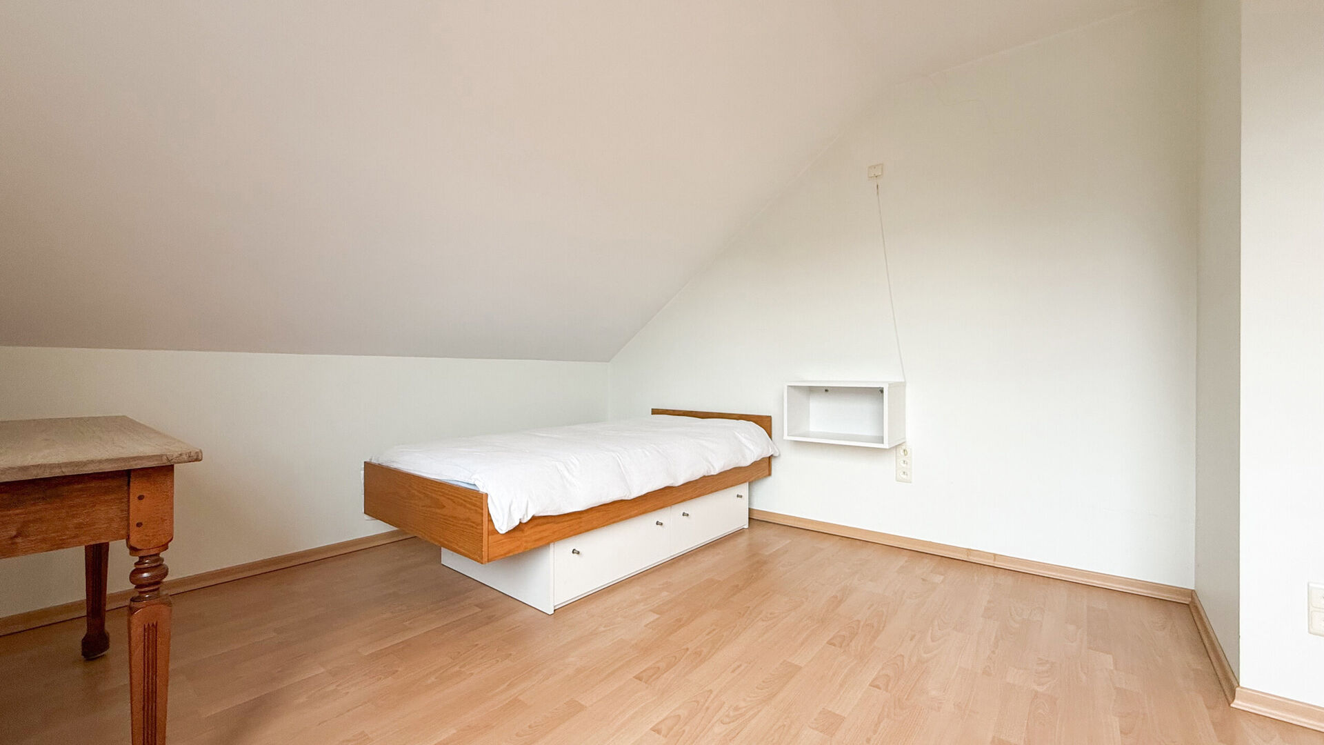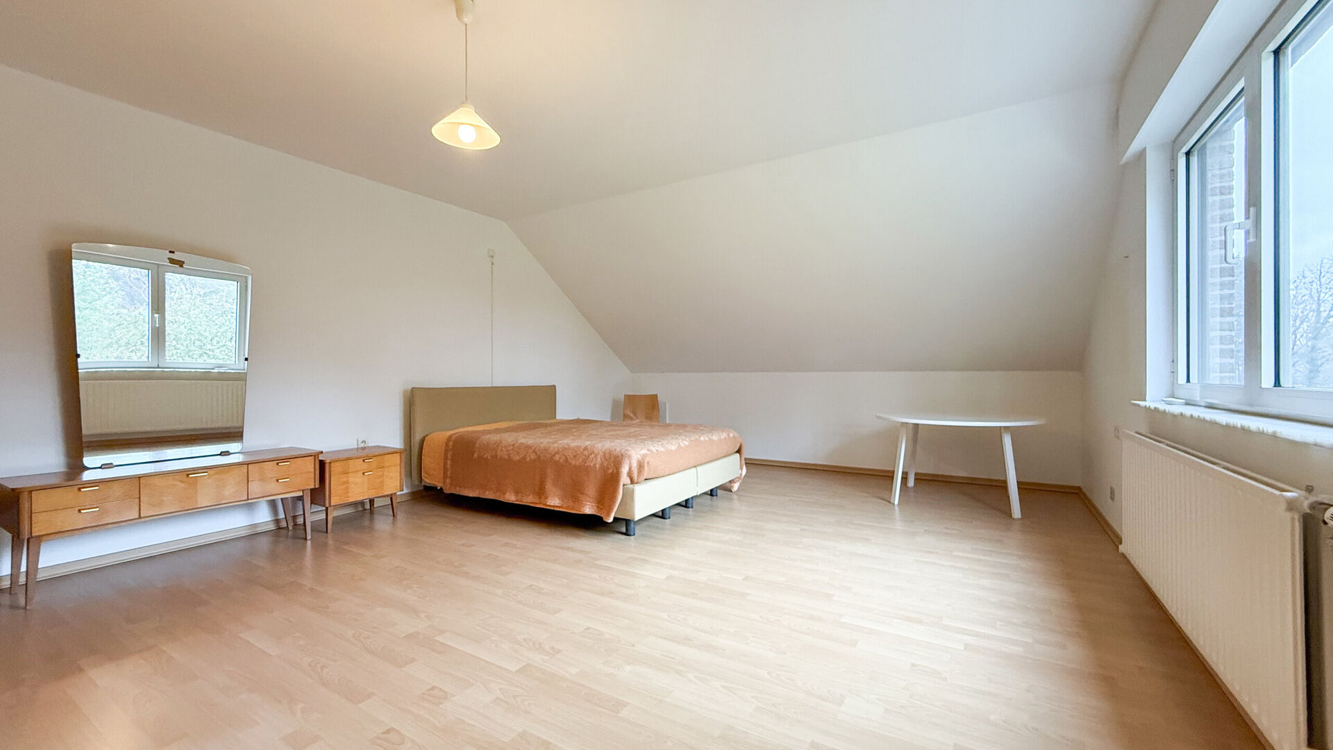 Op de eerste verdieping bevinden zich twee zeer ruime slaapkamers, met de mogelijkheid om extra kamers te creëren tot in totaal vier slaapkamers. De grootste slaapkamer biedt een prachtig uitzicht op de enorme tuin, terwijl de tweede slaapkamer is uitgerust met praktische inbouwkasten. Ook op deze verdieping zijn badkamer en toilet van elkaar gescheiden. De badkamer is voorzien van een douchecabine.