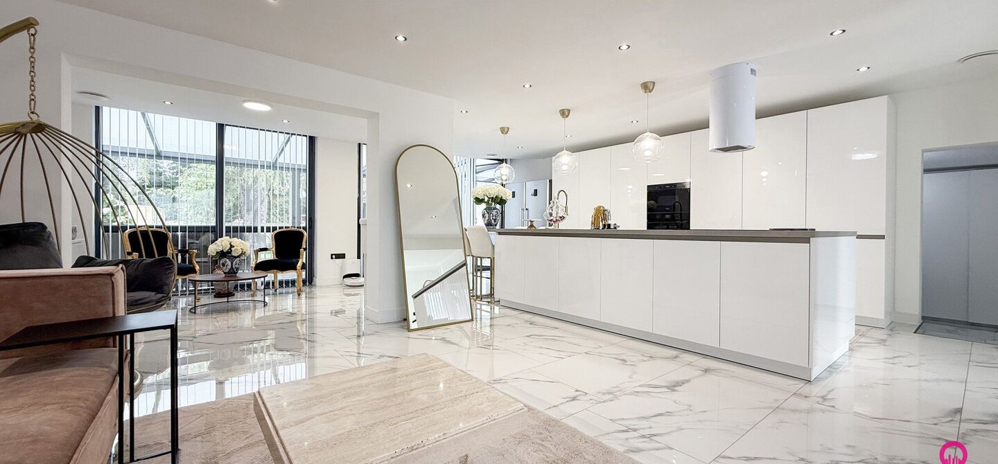 Bij binnenkomst wordt u verwelkomd in een ruime, lichte inkomhal met een praktische vestiairekast. Aan de voorkant bevindt zich een bureau dat perfect kan dienen als kantoorruimte of als gelijkvloerse zesde slaapkamer van 17 m². Vanuit de hal loopt u door naar de royale open leefruimte van in totaal 60 m², waarin de woonkamer, eetruimte en de riante keuken naadloos in elkaar overvloeien. Grote ramen zorgen voor een overvloed aan natuurlijk licht, en vanuit de keuken heeft u zicht op de volledig aangelegde en omheinde tuin. De keuken, volledig vernieuwd in 2024, combineert modern design met een praktische indeling en biedt alles wat een kookliefhebber zich kan wensen.