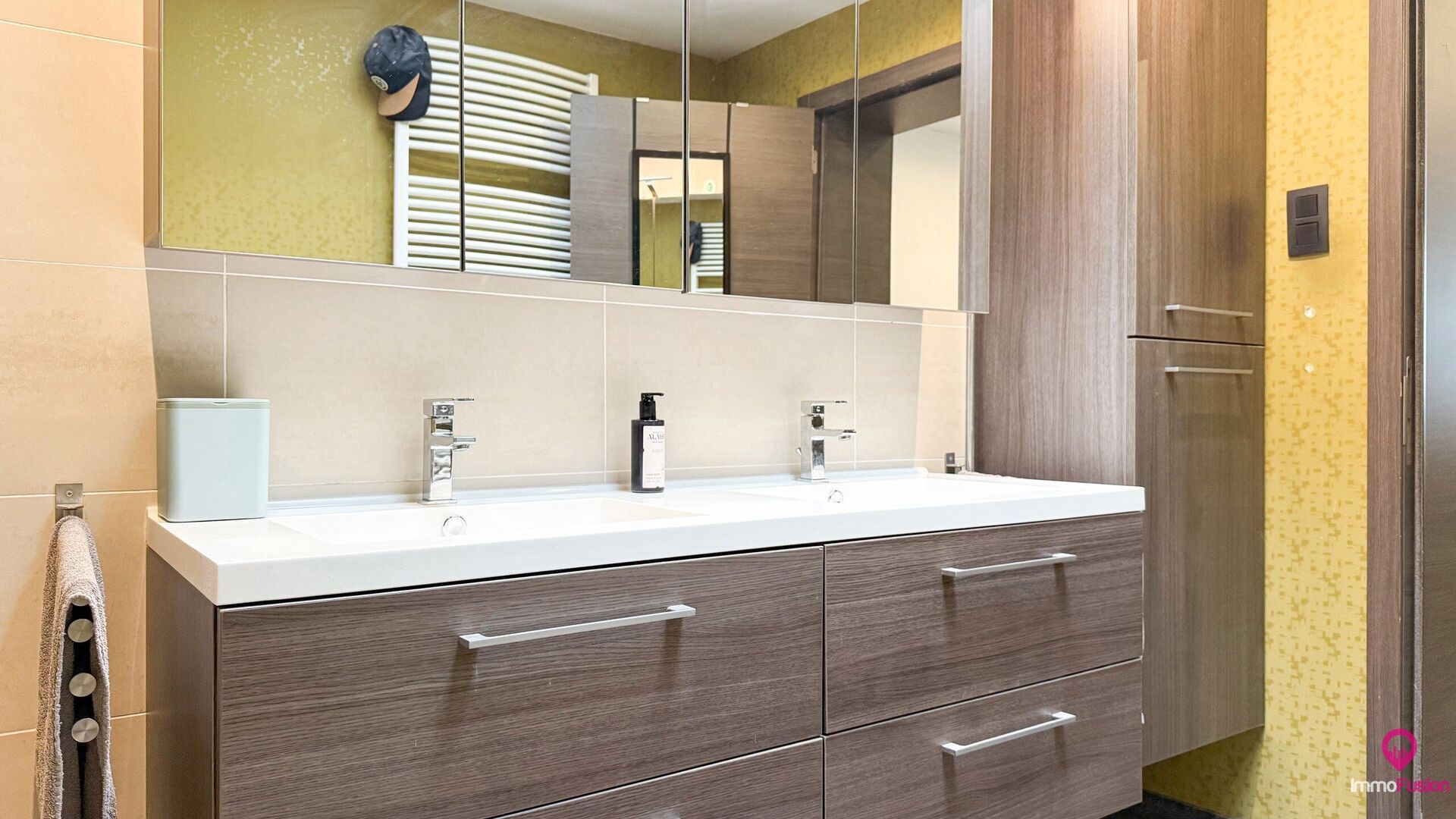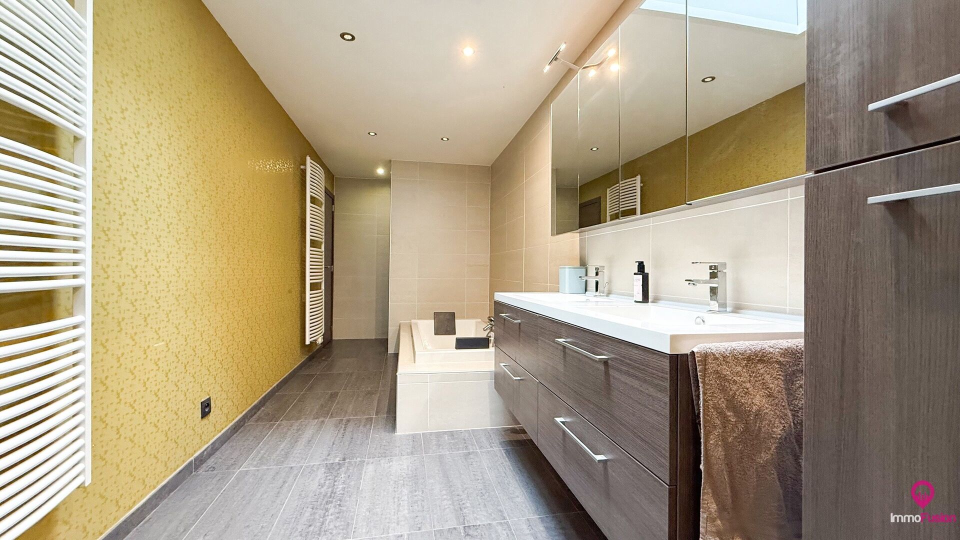 De badkamer is bijzonder royaal: uitgerust met een inloopdouche én bad, dubbele wasbak, en ontworpen voor comfort en rust.