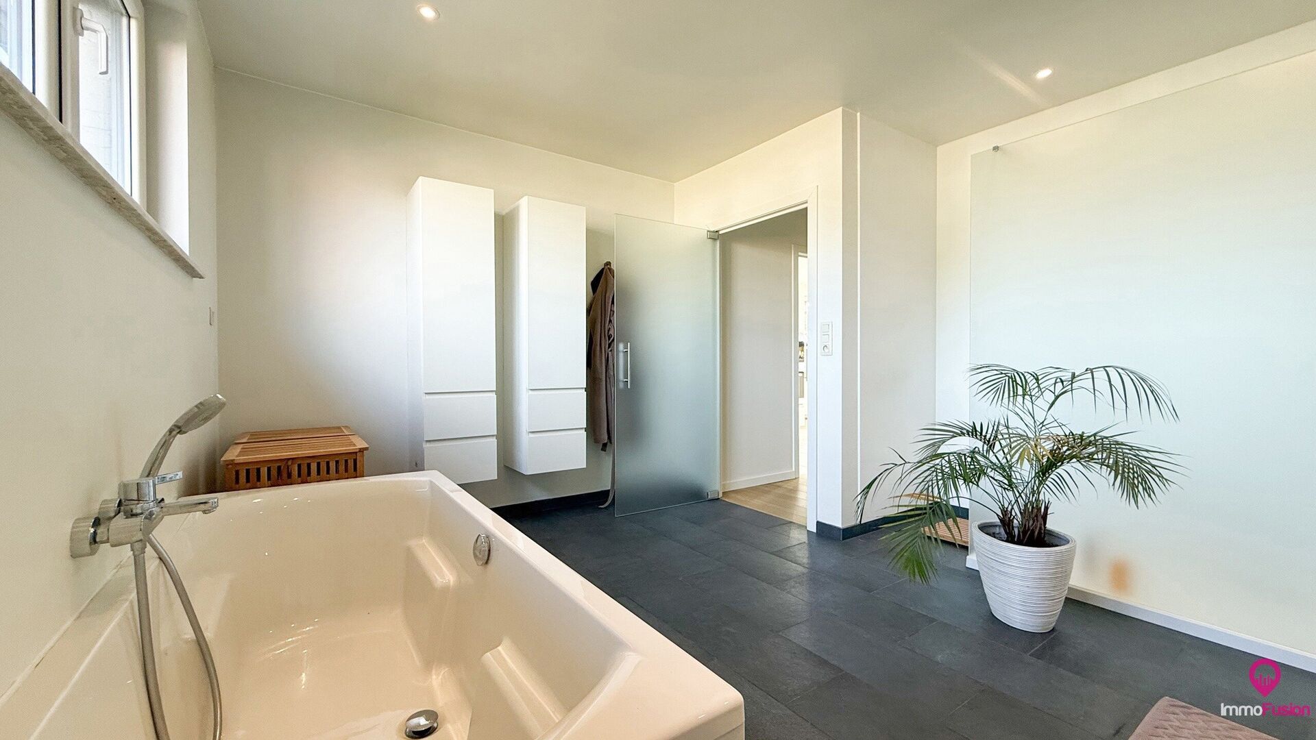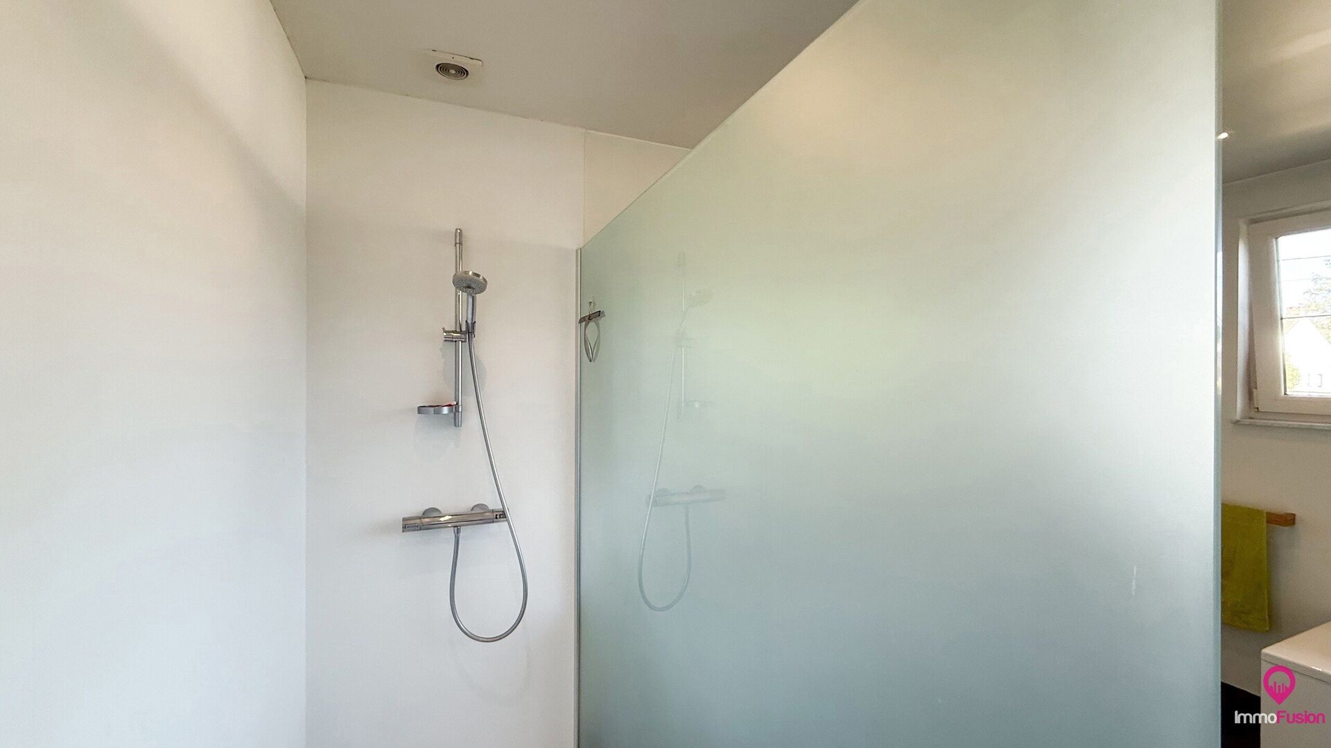 Vanuit de keuken brengt een gang je naar de prachtig ingerichte badkamer. Deze is modern afgewerkt en uitgerust met een dubbele lavabo, inloopdouche én ligbad, pure luxe!