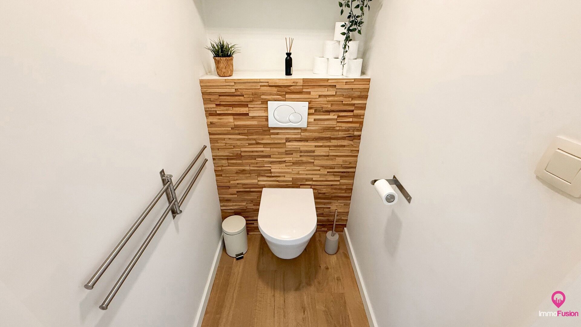 Vanuit de keuken brengt een gang je naar de prachtig ingerichte badkamer. Deze is modern afgewerkt en uitgerust met een dubbele lavabo, inloopdouche én ligbad, pure luxe!