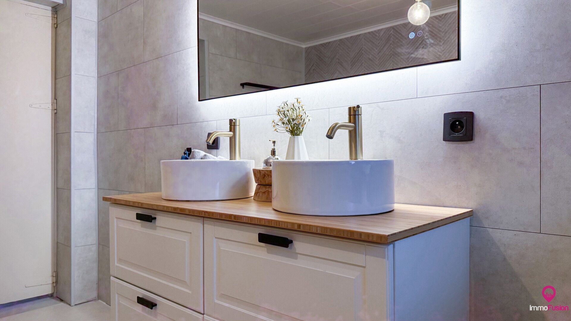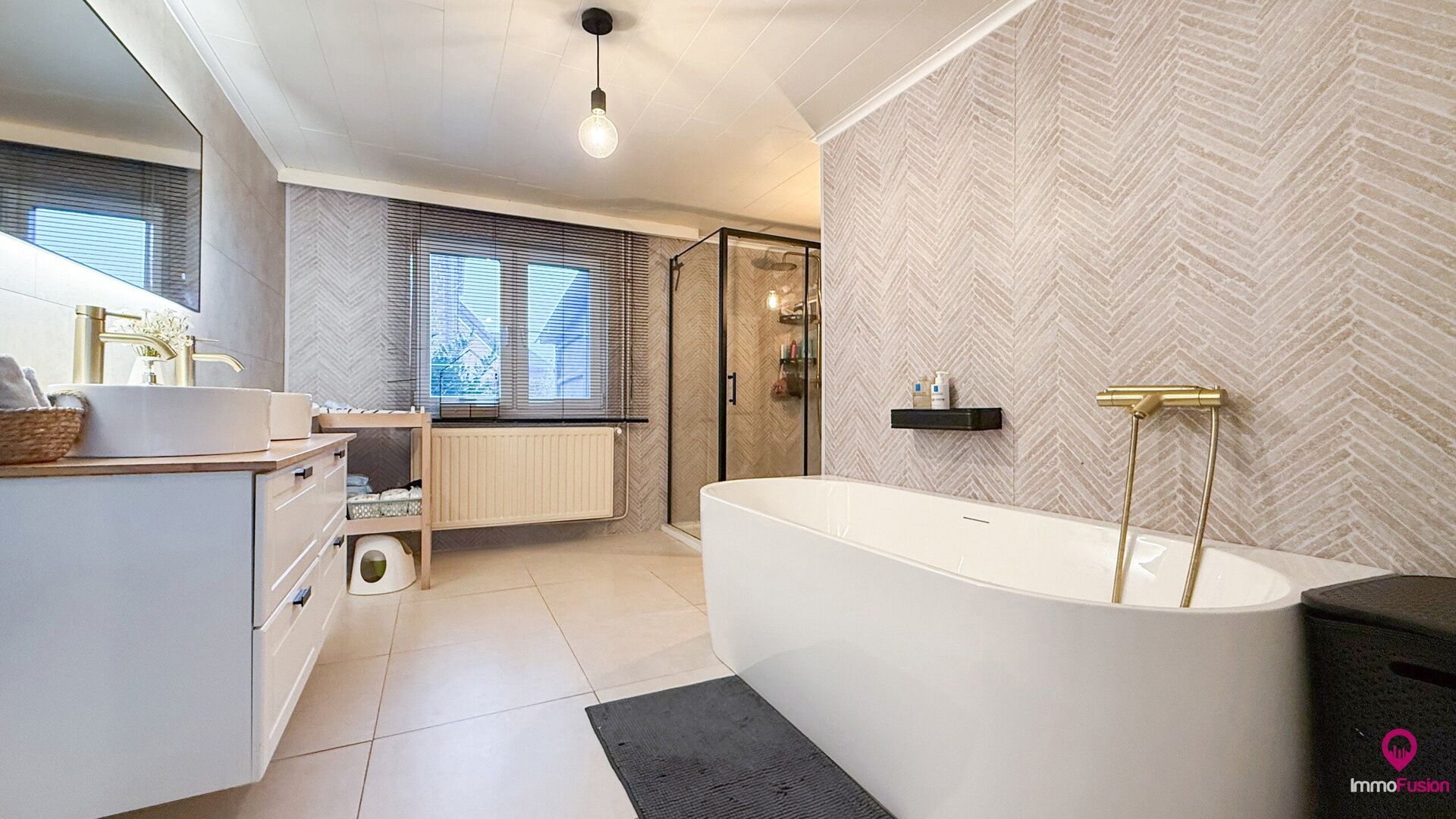 De luxe badkamer is een echte troef: uitgerust met een ligbad, een ruime inloopdouche, een dubbele lavabo en een aparte wasruimte met aansluitingen voor wasmachine en droogkast.