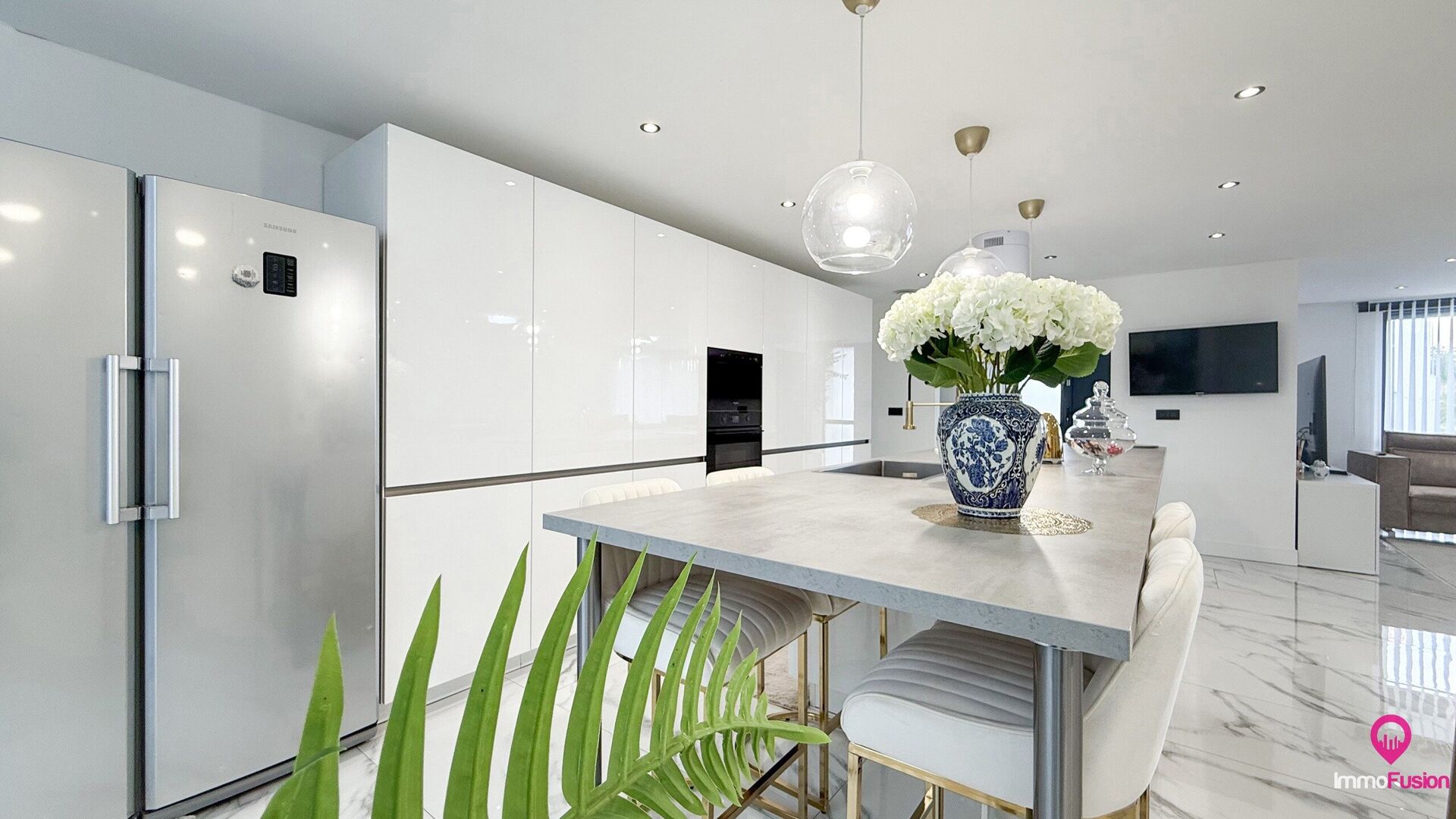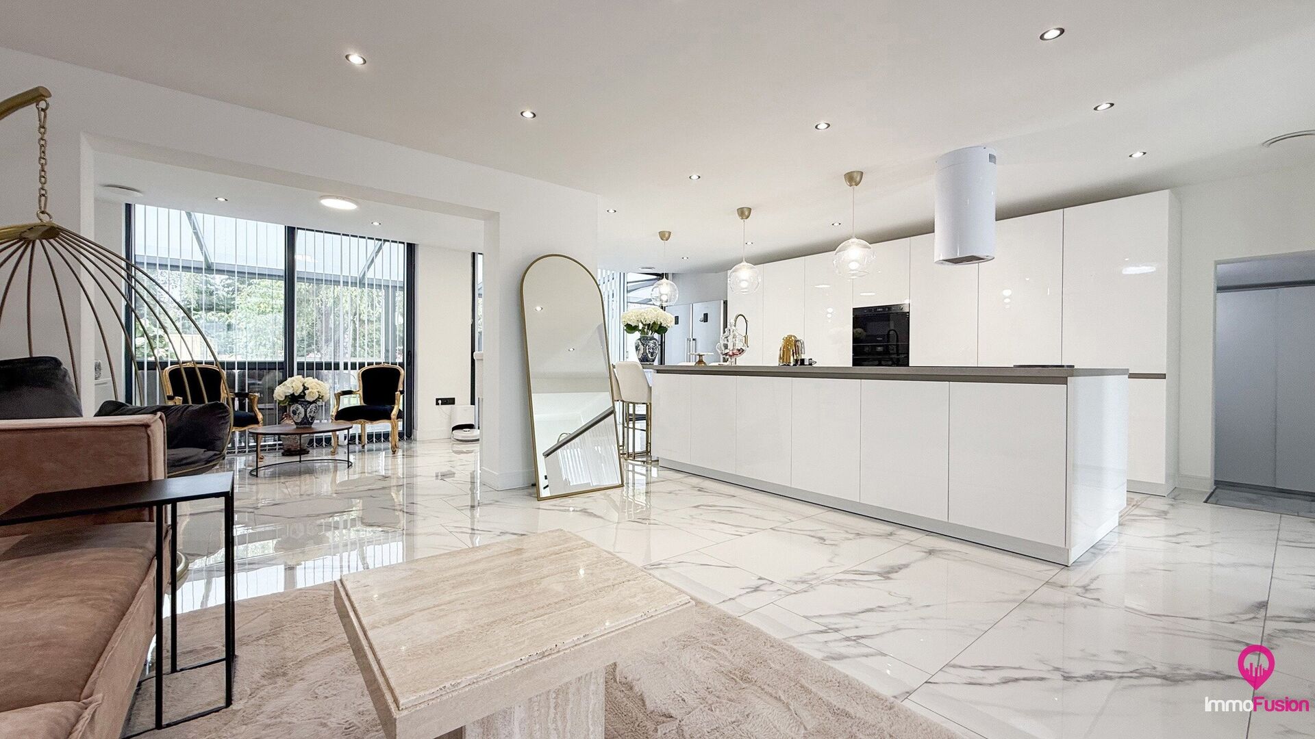 Bij binnenkomst wordt u verwelkomd in een ruime, lichte inkomhal met een praktische vestiairekast. Aan de voorkant bevindt zich een bureau dat perfect kan dienen als kantoorruimte of als gelijkvloerse zesde slaapkamer van 17 m². Vanuit de hal loopt u door naar de royale open leefruimte van in totaal 60 m², waarin de woonkamer, eetruimte en de riante keuken naadloos in elkaar overvloeien. Grote ramen zorgen voor een overvloed aan natuurlijk licht, en vanuit de keuken heeft u zicht op de volledig aangelegde en omheinde tuin. De keuken, volledig vernieuwd in 2024, combineert modern design met een praktische indeling en biedt alles wat een kookliefhebber zich kan wensen.