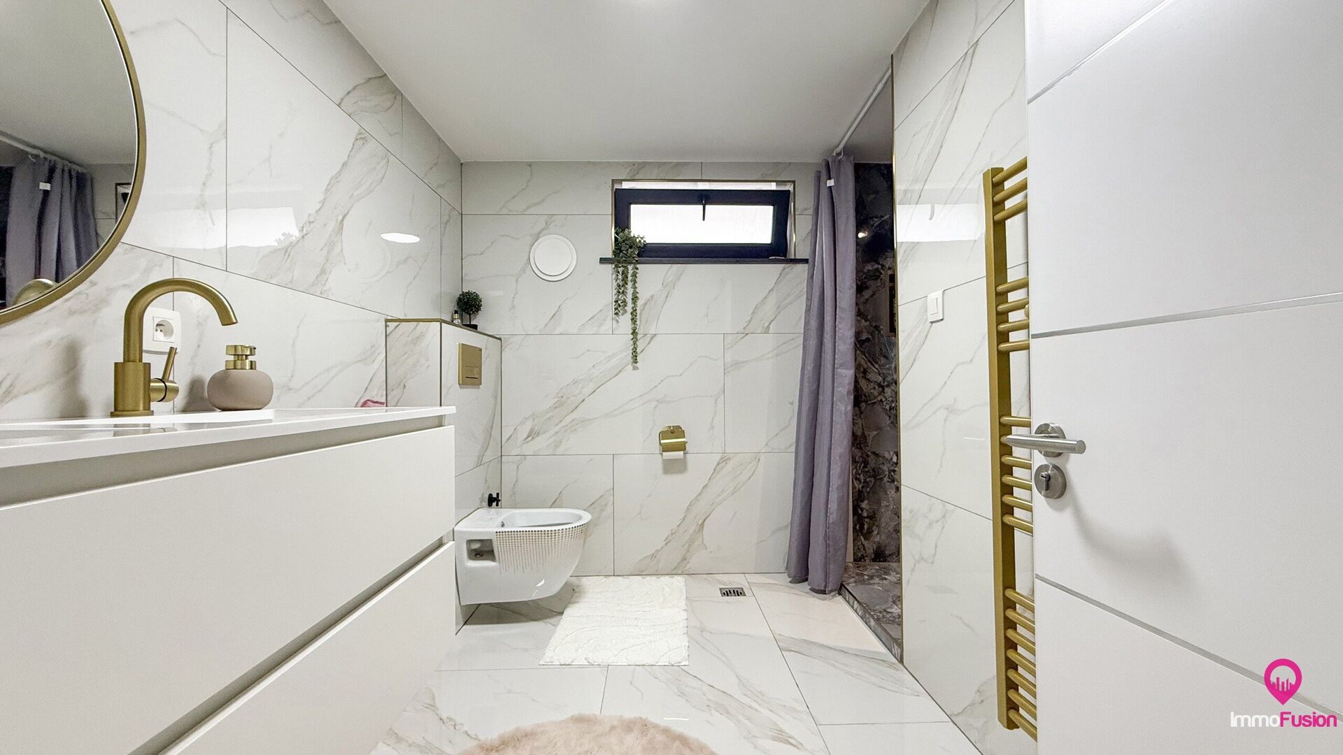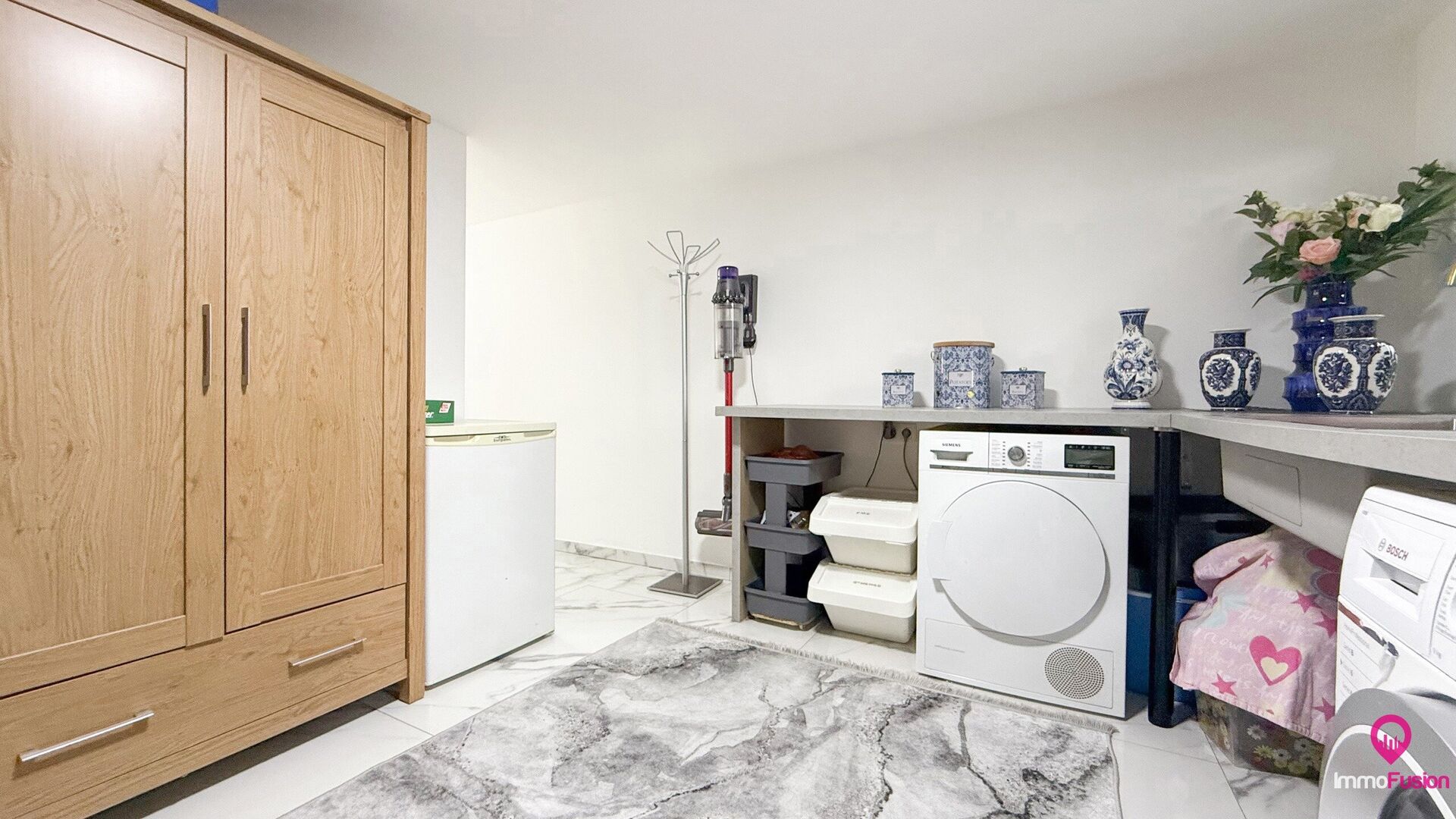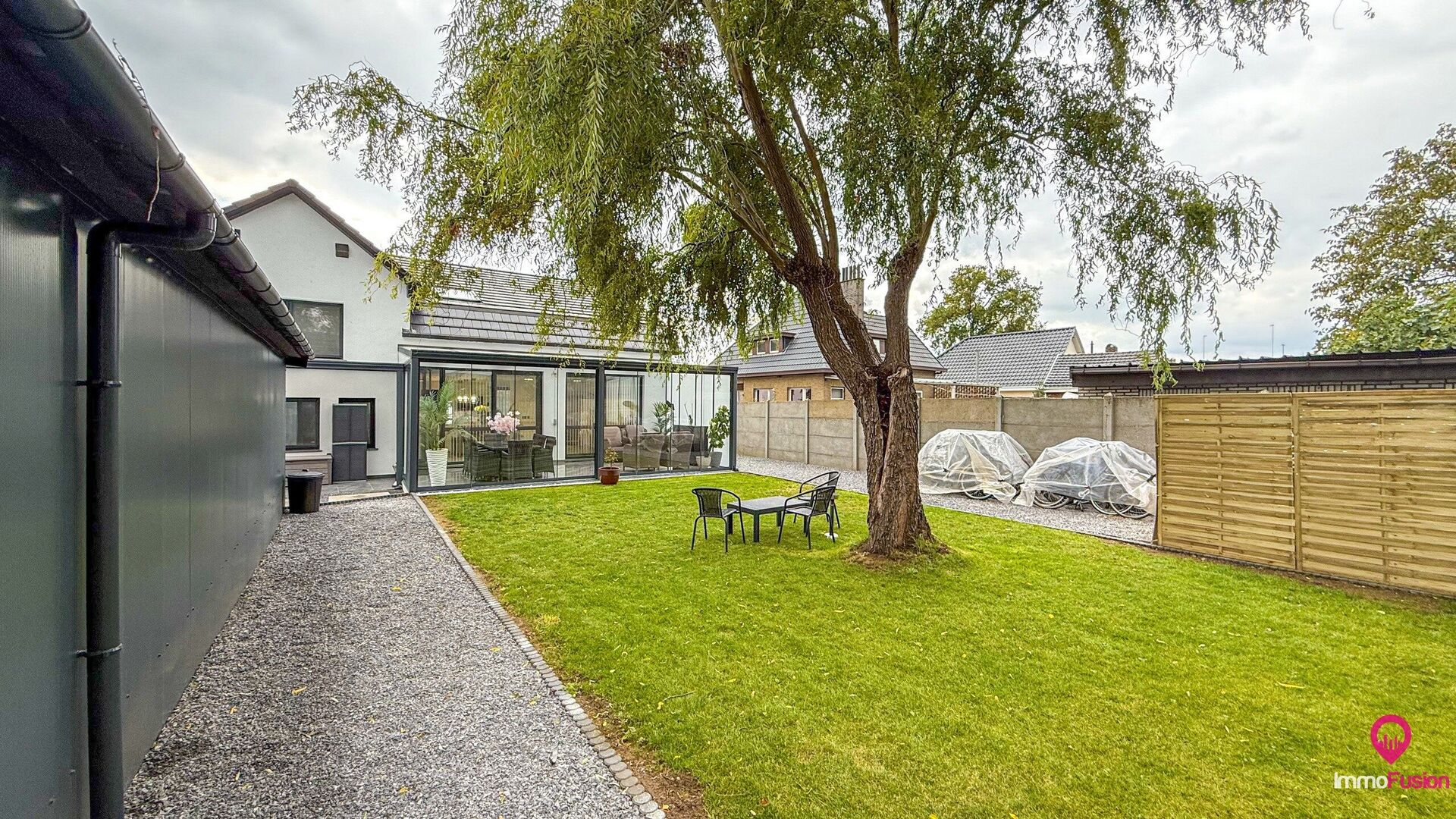 De woning beschikt over drie badkamers, elk met een toilet, waardoor comfort en privacy gegarandeerd zijn voor het hele gezin. Aan de achterzijde werd een overdekt terras met glazen schuifwanden omgevormd tot extra leefruimte, ideaal om het hele jaar door van buiten te genieten. De ruime garage biedt daarnaast volop opslagruimte en praktische mogelijkheden.
