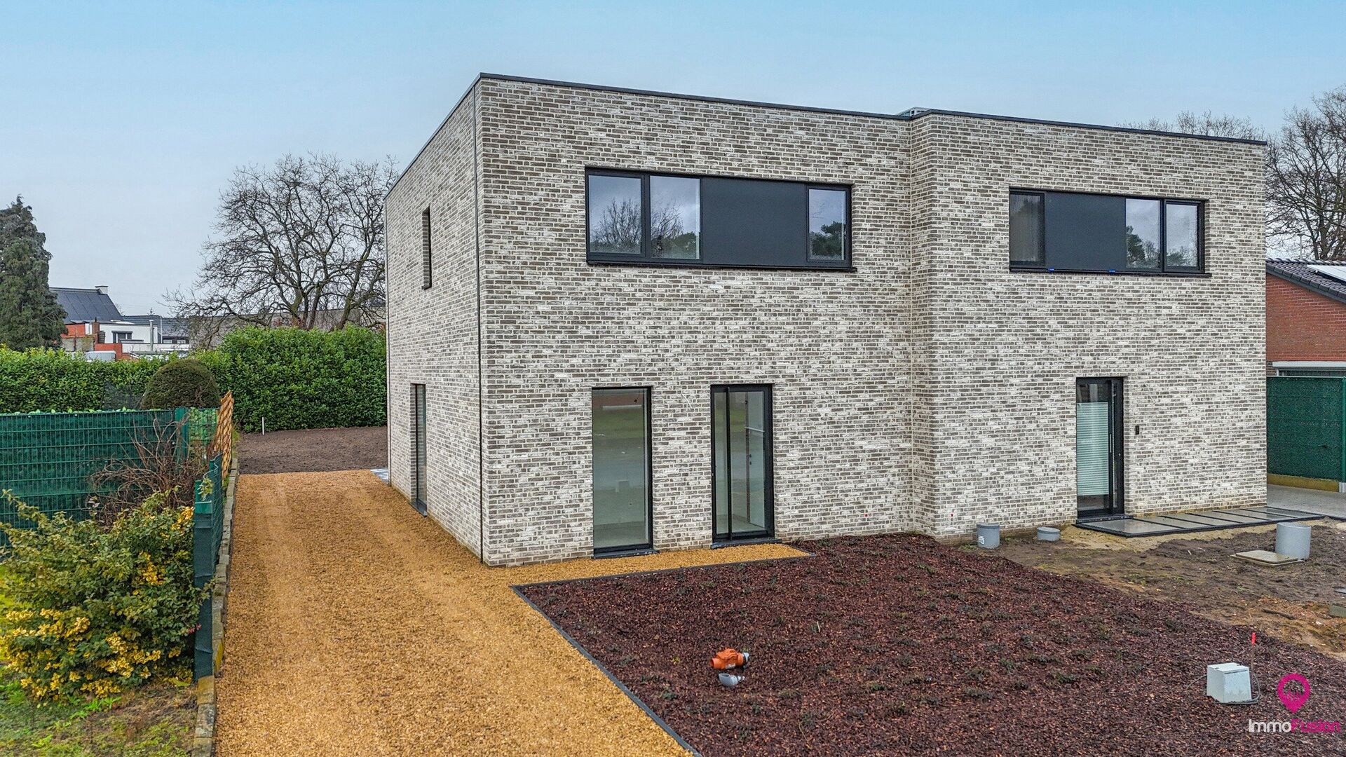 De woning is afgewerkt met aluminium ramen en deuren en beschikt over een plat dak.