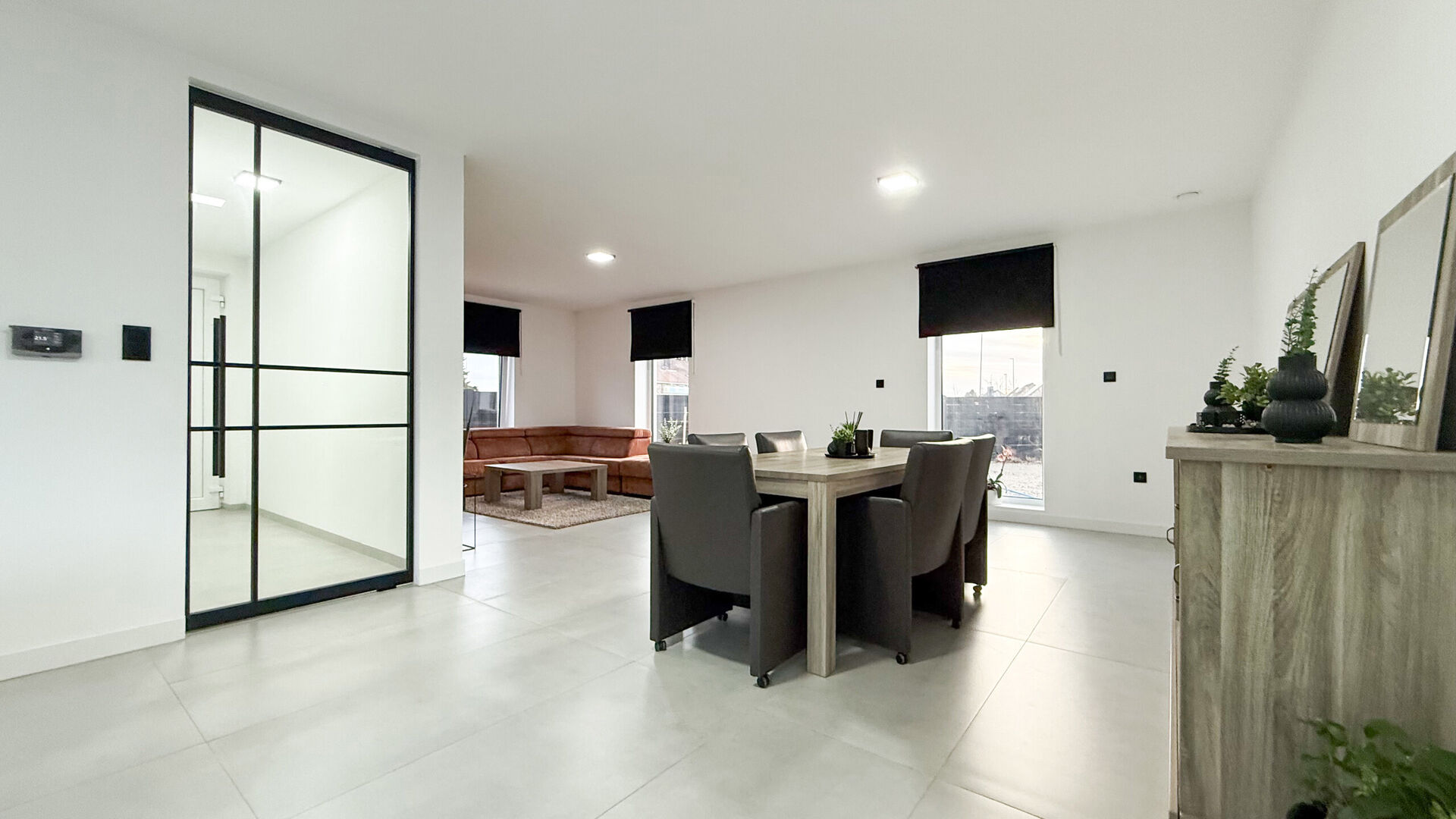 De eetruimte bevindt zich centraal tussen keuken en zithoek en vormt zo de perfecte verbindingsplek voor gezellige gezinsmomenten.