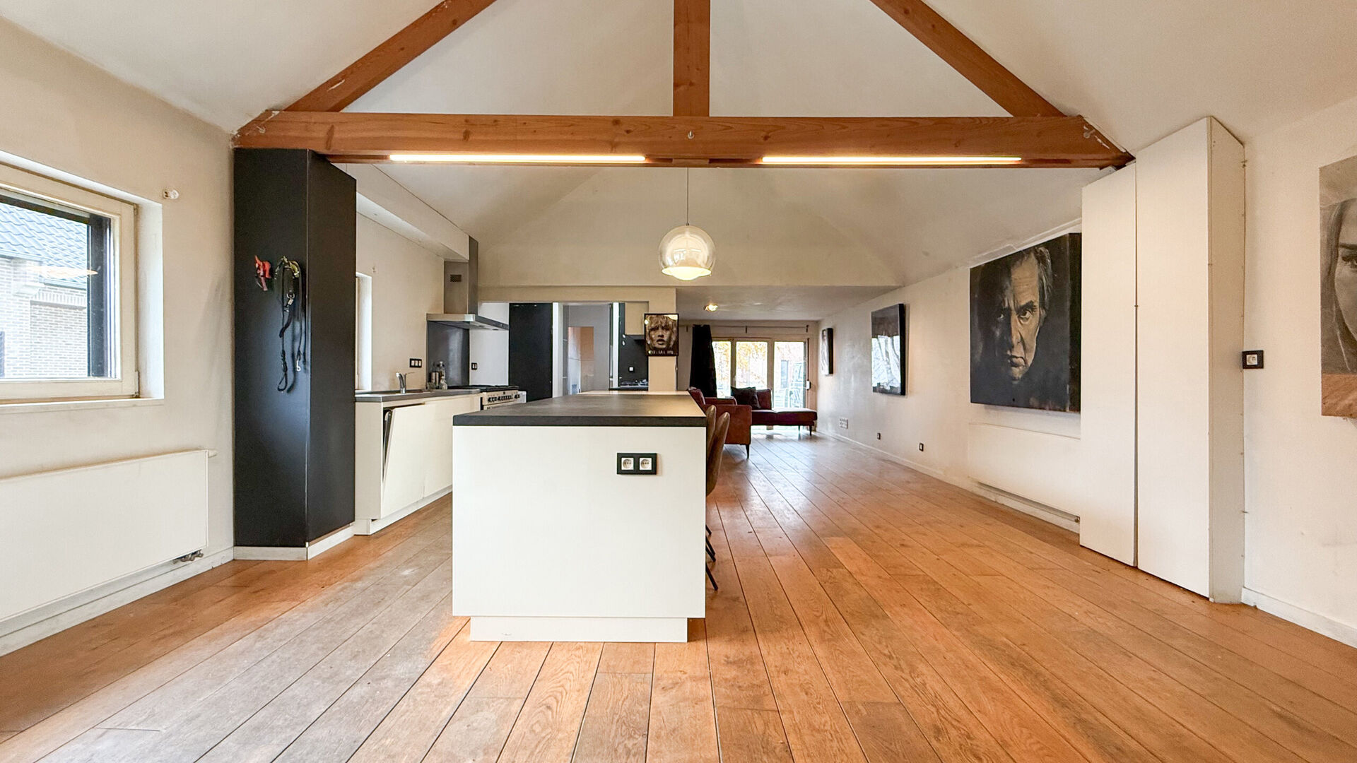 Bij het binnenkomen word je verwelkomd in een gezellige, warme inkomhal die meteen de toon zet voor de rest van de woning. De living en open keuken vloeien mooi in elkaar over en zijn voorzien van een prachtige plankenvloer. De volledig geïnstalleerde keuken beschikt over een kookeiland en een prachtig gasfornuis – een echte eyecatcher voor elke kookliefhebber. Dankzij de open indeling geniet je hier van een heerlijk open leefgevoel.