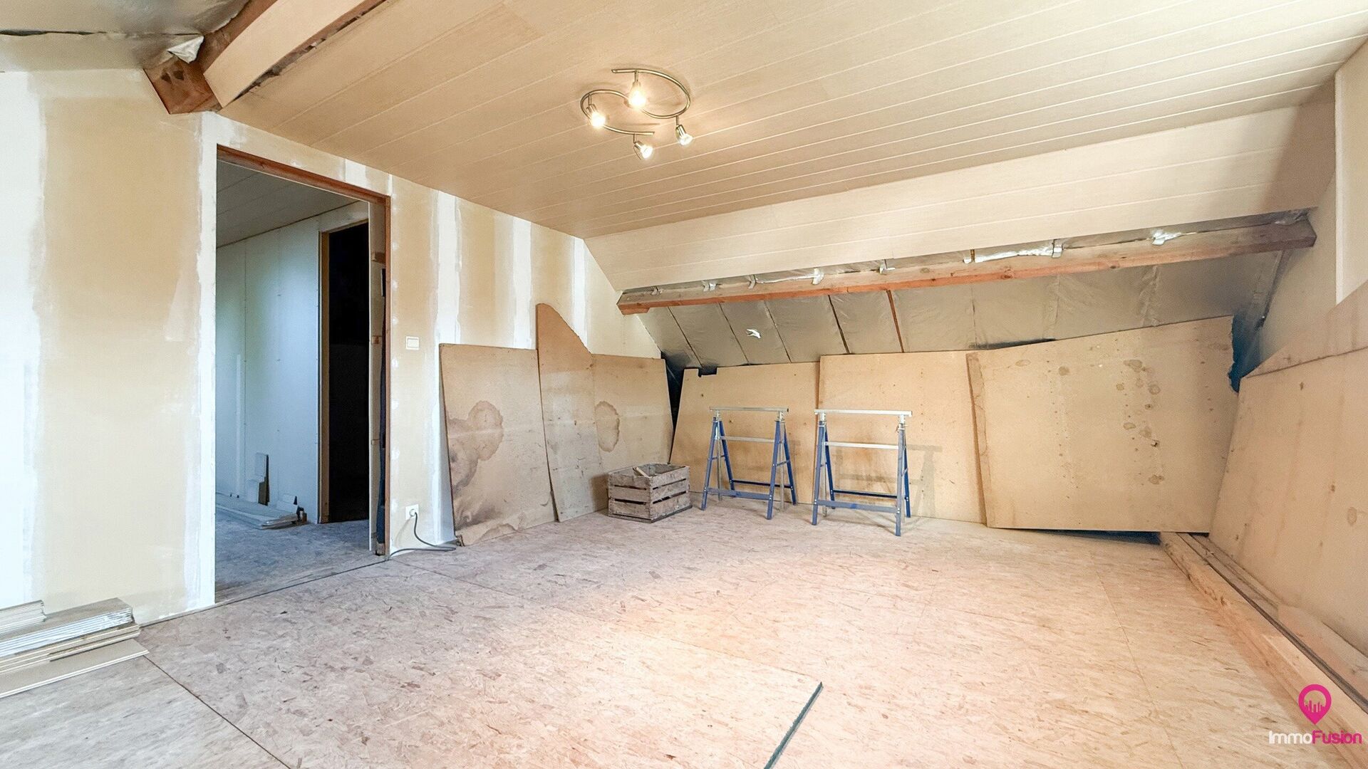 Op de bovenverdieping telt de woning drie slaapkamers. Eén kamer werd reeds volledig afgewerkt, terwijl de twee overige kamers nog een persoonlijke finishing touch vergen — laminaat is hiervoor reeds aanwezig. Hierdoor kan je de ruimte helemaal naar eigen stijl inrichten.