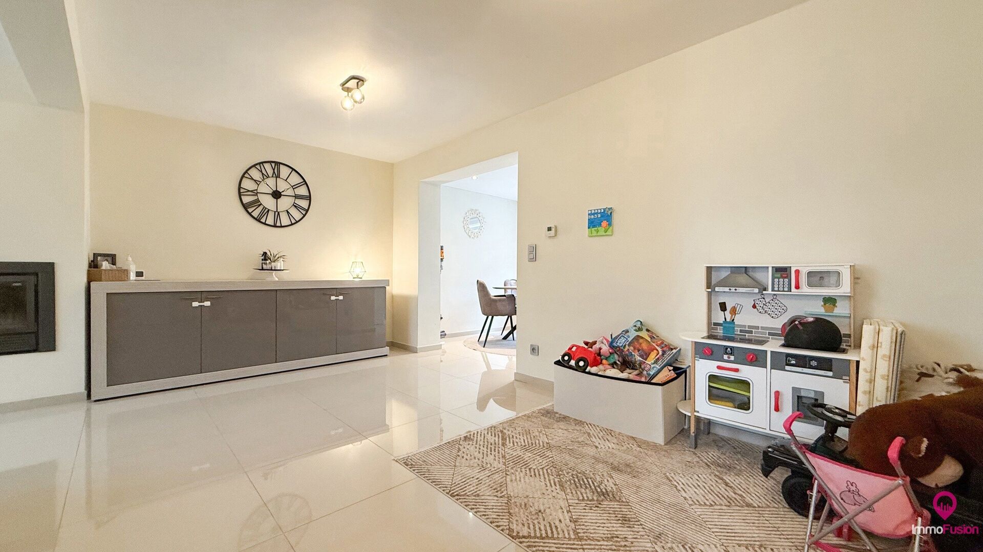 Vanuit de inkomhal wandel je door naar de lichte en zeer ruime living: dankzij grote ramen valt er veel natuurlijk licht binnen, wat zorgt voor een warme, uitnodigende sfeer.