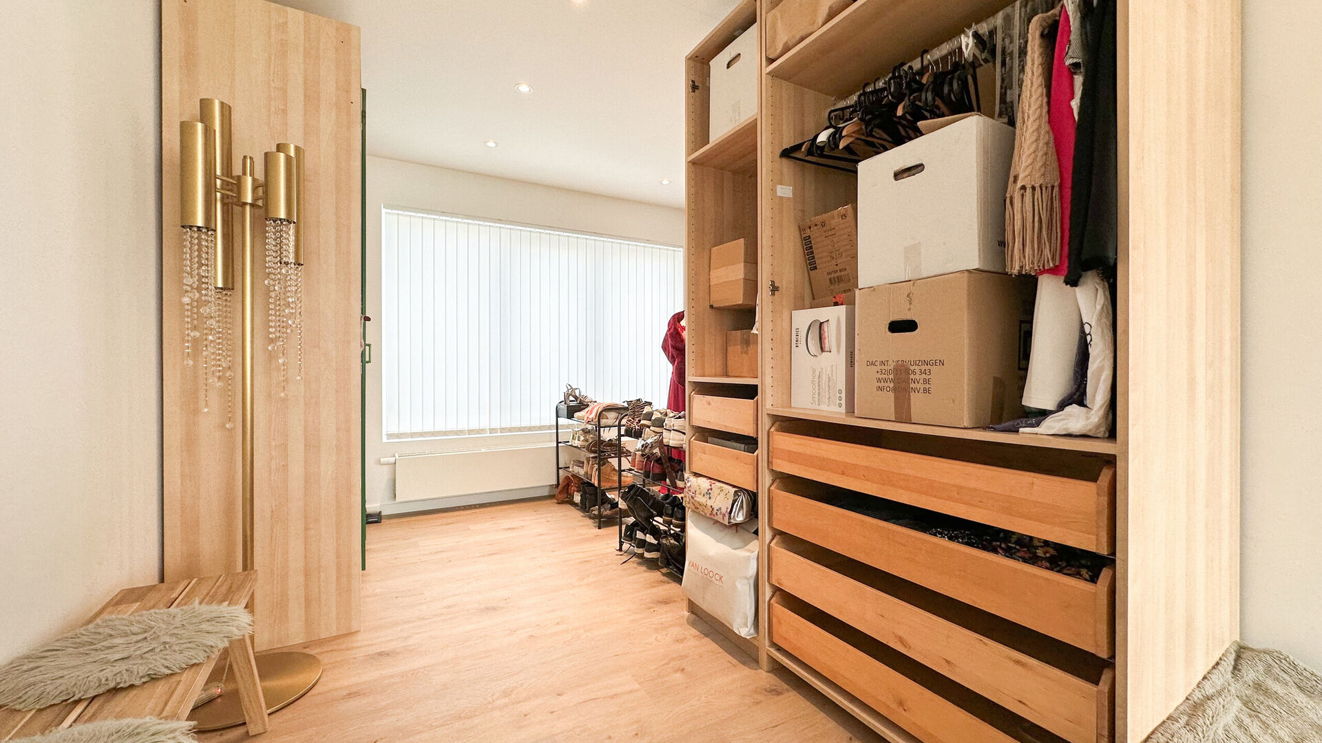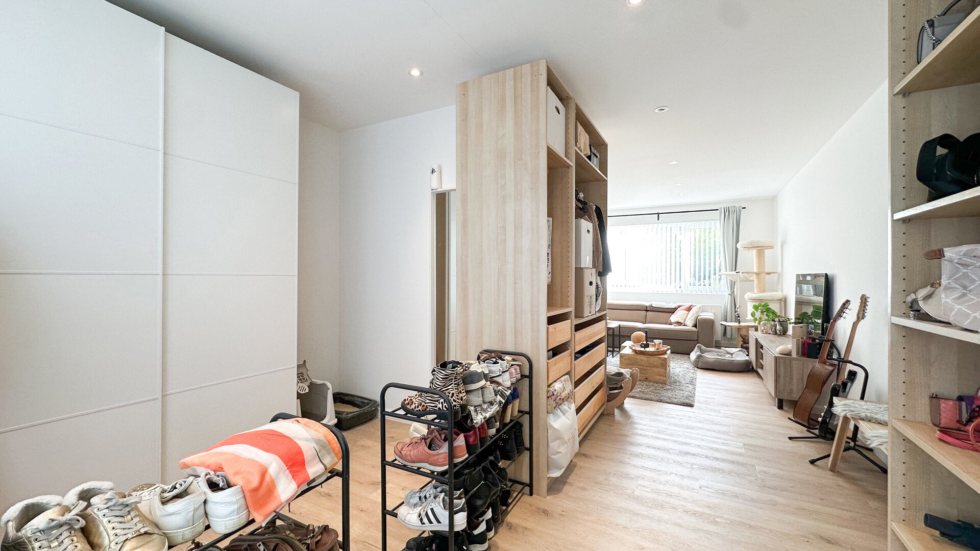 Bij het betreden van de woning word je begroet door de warme uitstraling van de houtkleurige parketvloer, die een gevoel van luxe en gezelligheid toevoegt aan de ruimte. De strakke witte muren vormen een perfecte achtergrond voor elk decor en zorgen voor een heldere en uitnodigende sfeer in elke kamer.