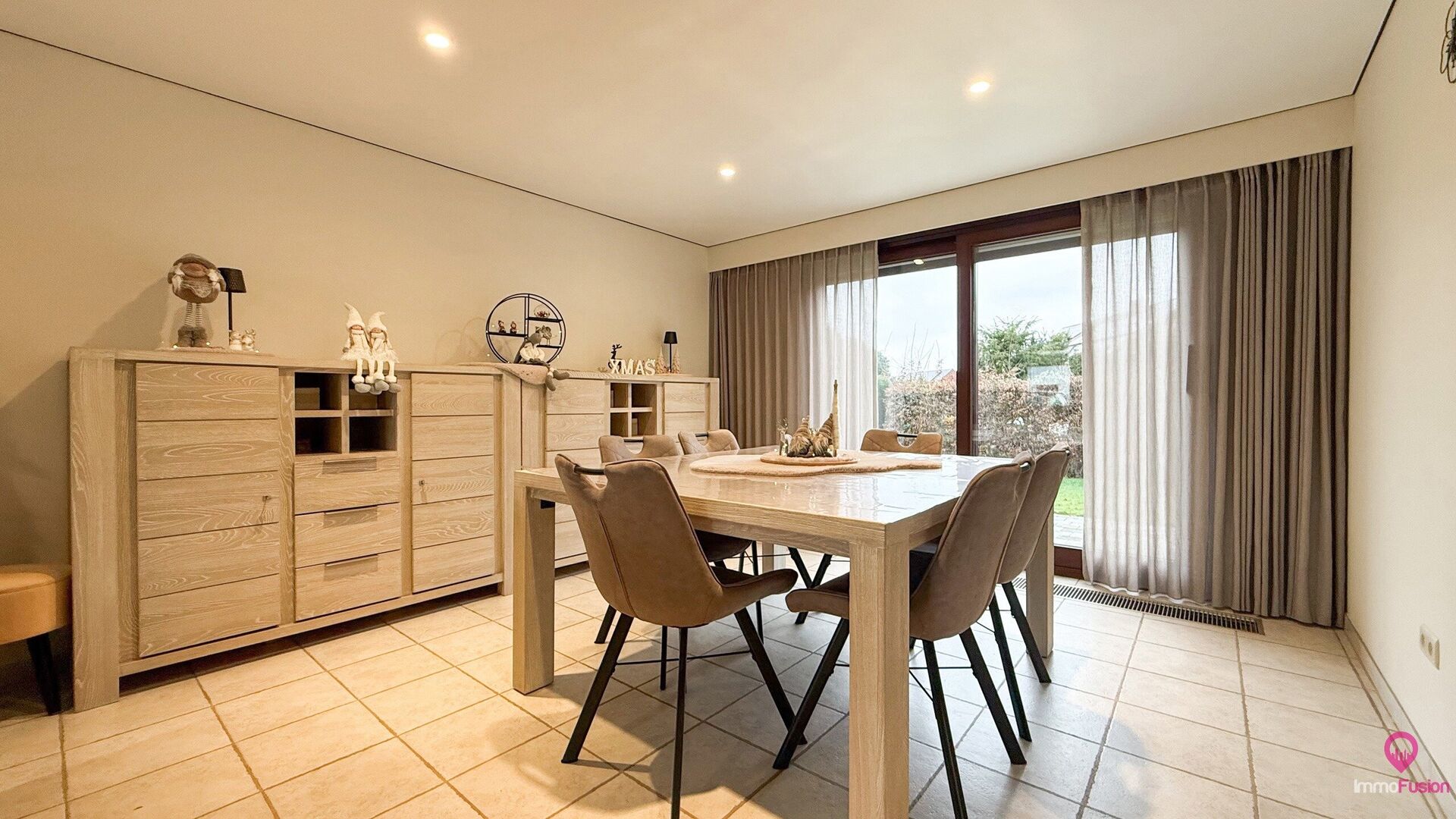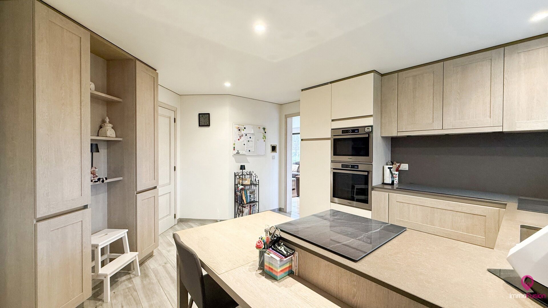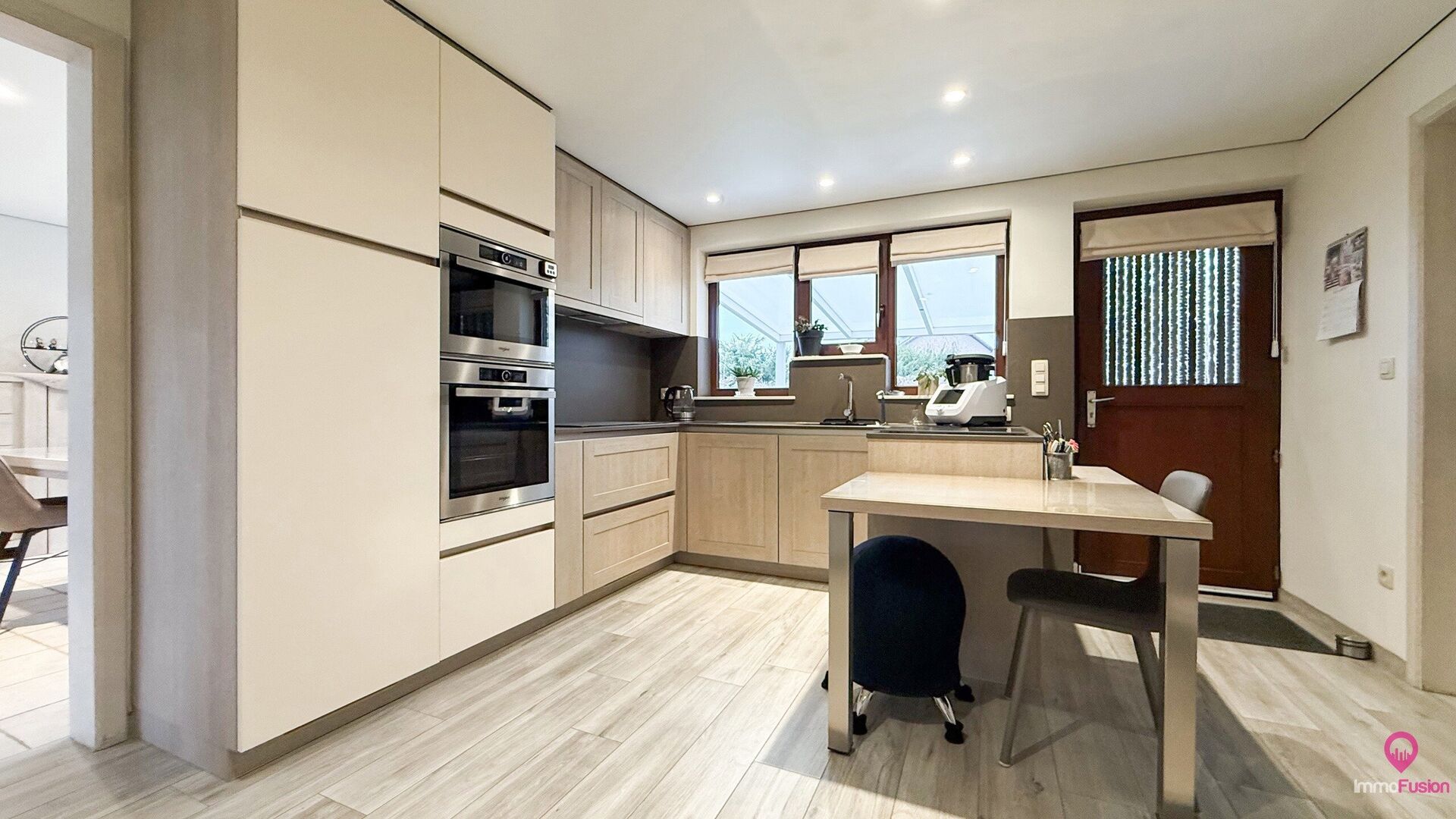 De keuken is volledig uitgerust met een ingebouwde oven en microgolf, frigo, dampkap en inductiekookplaat, en sluit mooi aan op de leefruimte. Op het gelijkvloers bevindt zich bovendien een ruime berging met alle nodige aansluitingen. Hier is momenteel een badkamermeubel met douche voorzien, evenals de voorzieningen voor wasmachine en droogkast. Verder is er een inpandige garage en een apart gastentoilet.