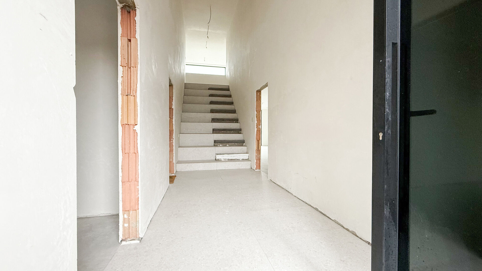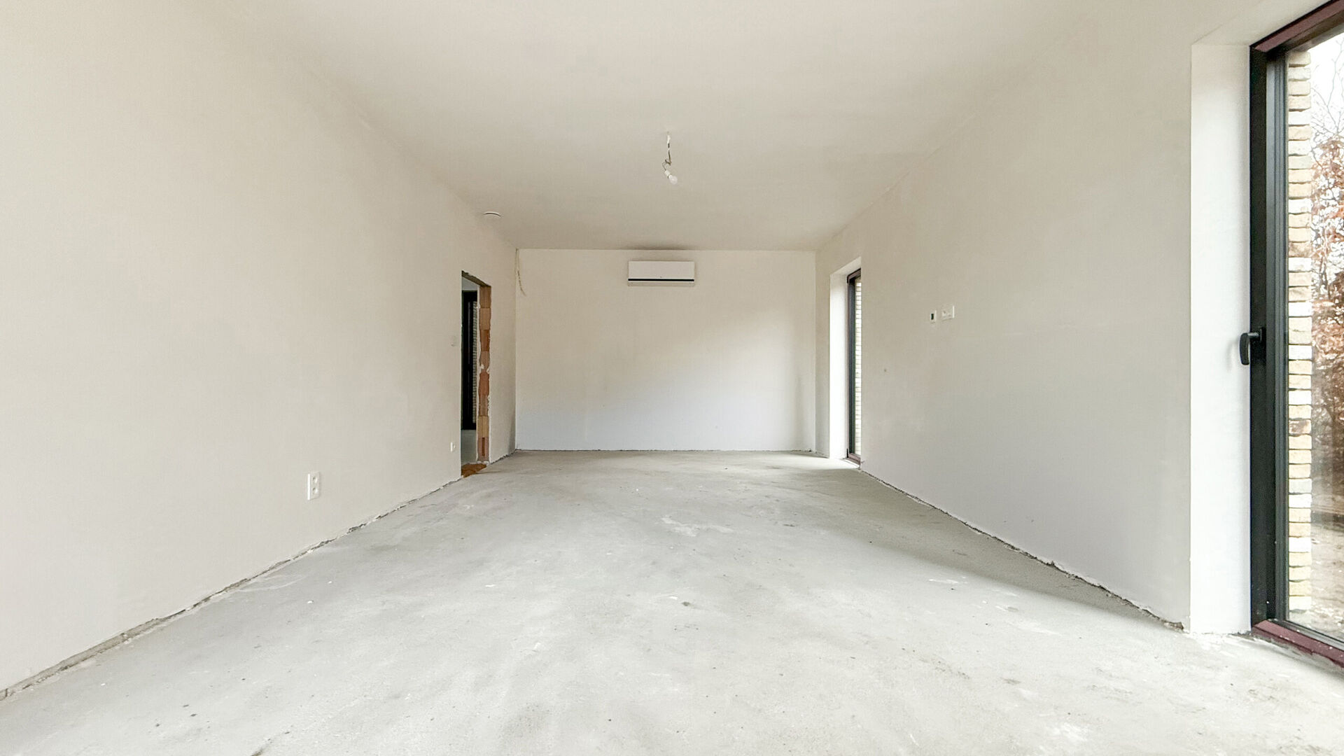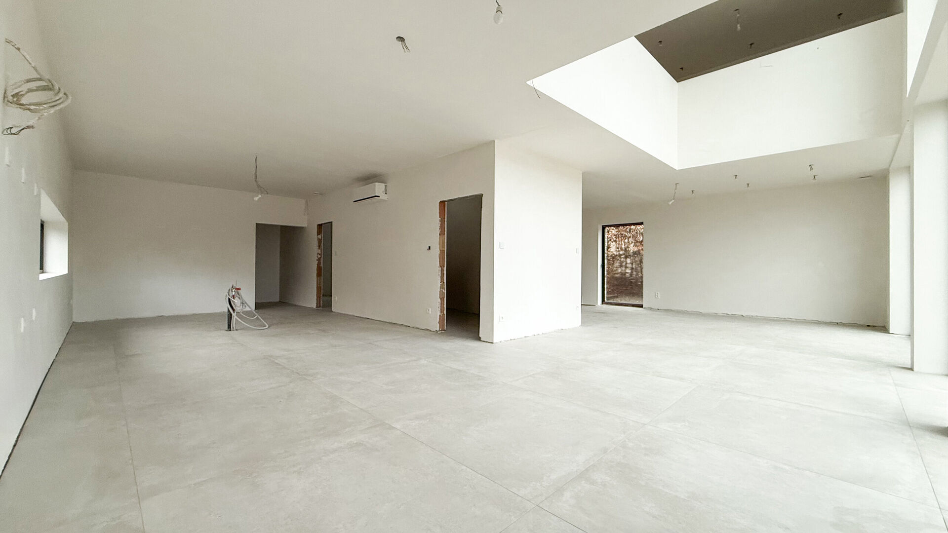 Vanaf het eerste moment maakt deze villa indruk. U wordt verwelkomd via een stijlvolle pivotdeur die uitgeeft op een royale inkomhal met een uitzonderlijk brede gang die visueel wordt doorgetrokken tot achteraan de woning. Deze centrale as creëert niet alleen een gevoel van ruimte en rust, maar versterkt ook de architecturale beleving van het geheel.