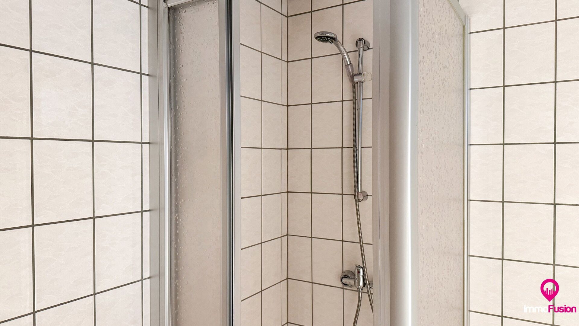 De badkamer is functioneel ingericht met een douche, een toilet en opbergkasten.