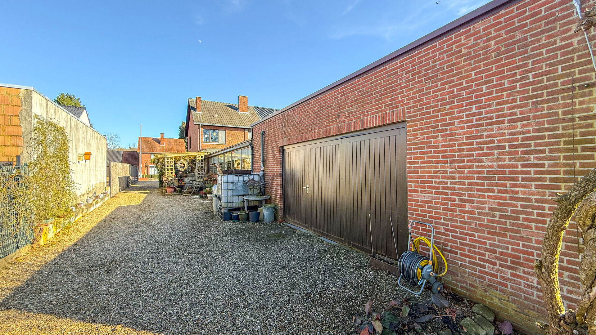 Achteraan bevindt zich een ruime inpandige garage/werkplaats, die momenteel dienstdoet als stockageplaats. Ideaal voor zelfstandigen of mensen met een bijberoep.