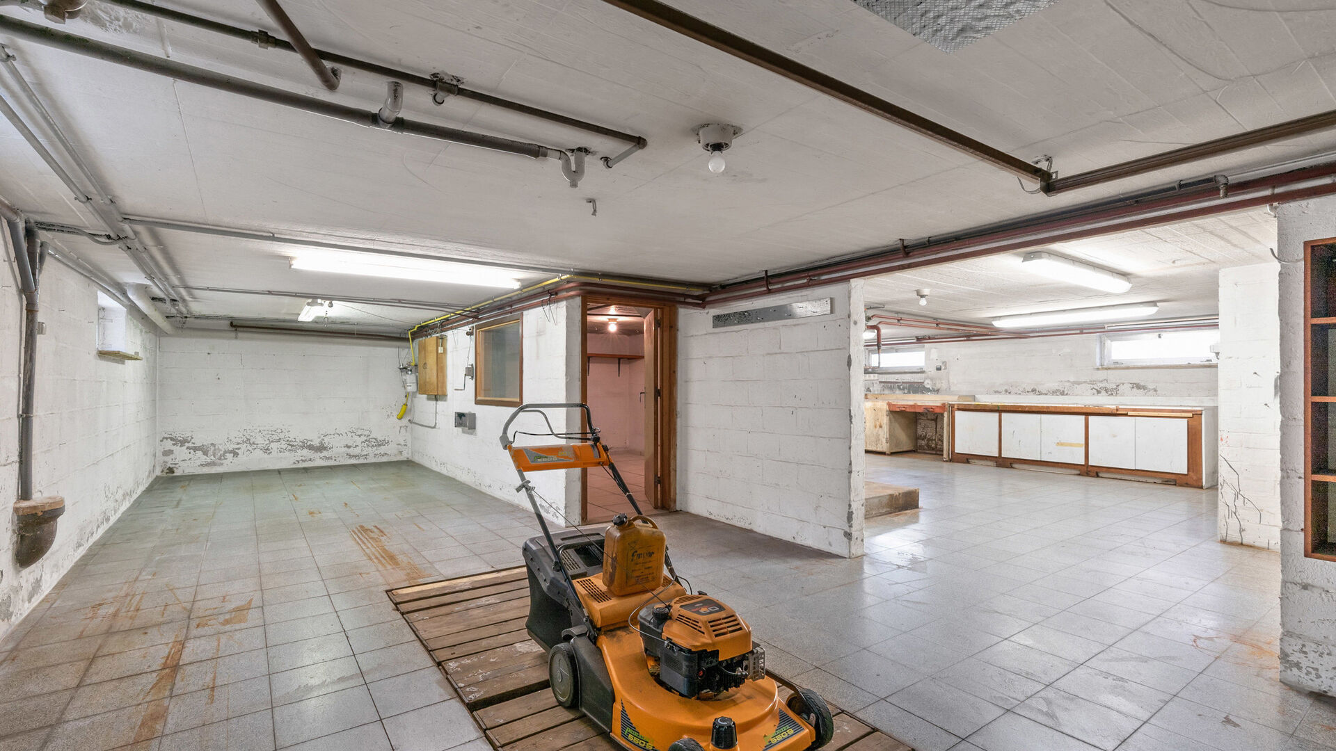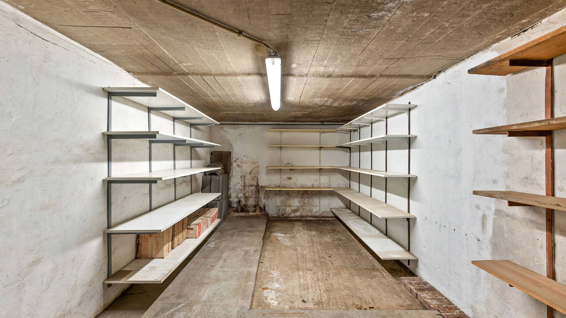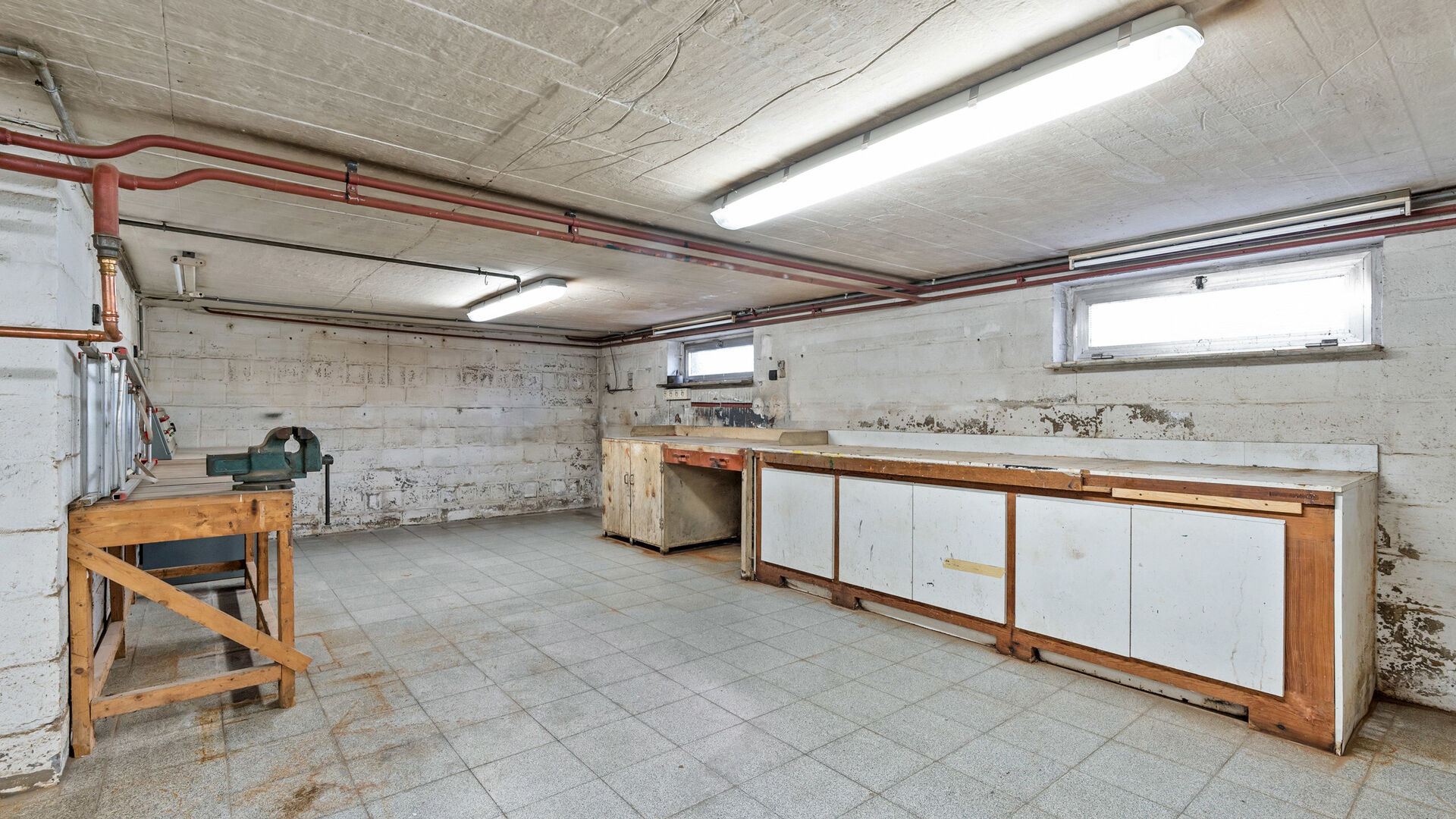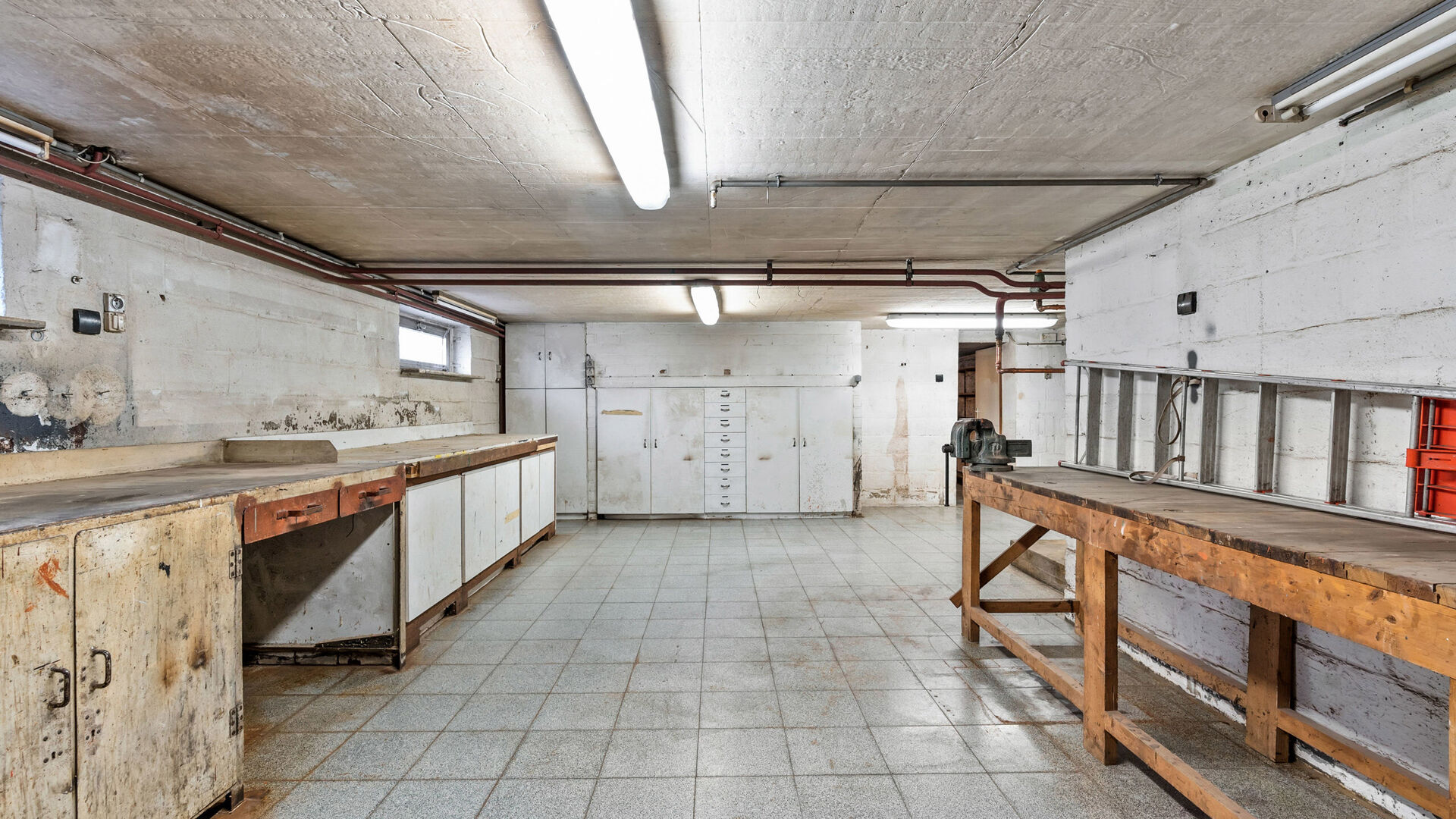 De woning beschikt over een zeer ruime kelder, verdeeld in vier zones: een opbergruimte, een garage voor 2 auto’s met smeerput en manuele poort, een werkplaats/houtatelier en een ruimte met opbergrekken. De kelder is volledig betegeld en voorzien van TL-verlichting – ideaal voor extra werk-, opslag- of hobbyruimte.