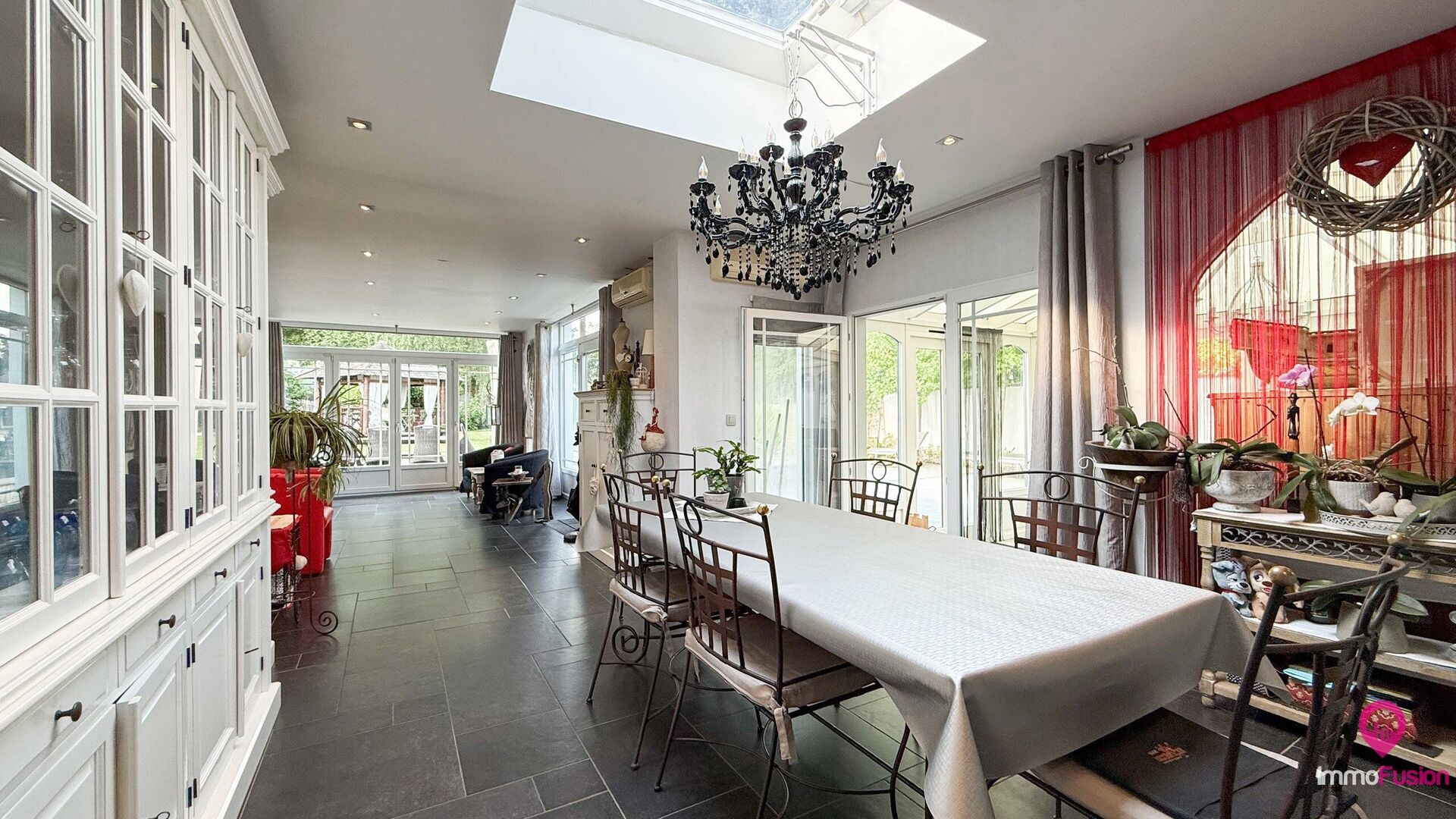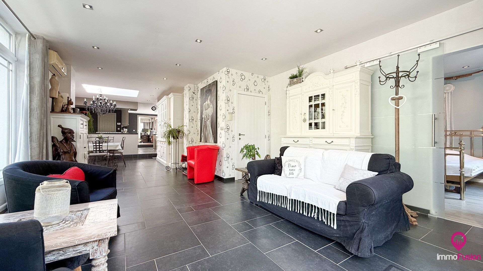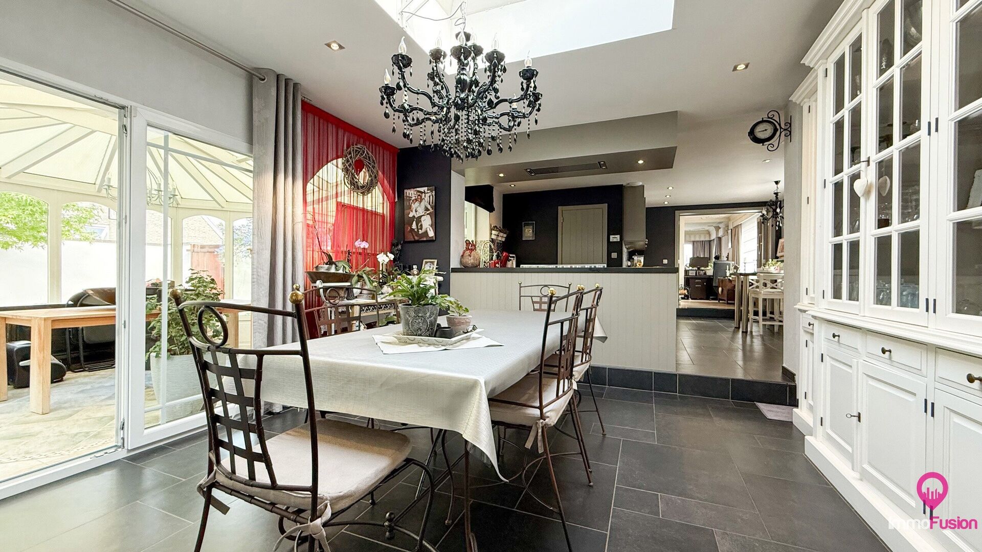 De eetkamer is bijzonder ruim en wordt gecombineerd met de zitruimte. Hier vind je een gezellige opstelling met zetels en een grote eettafel.