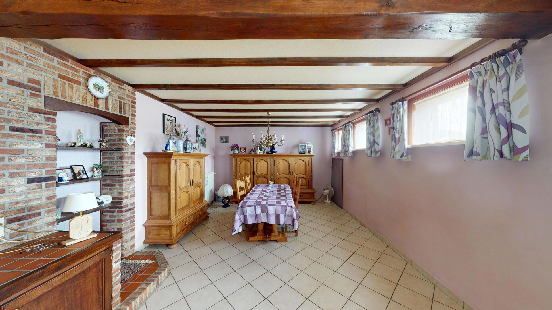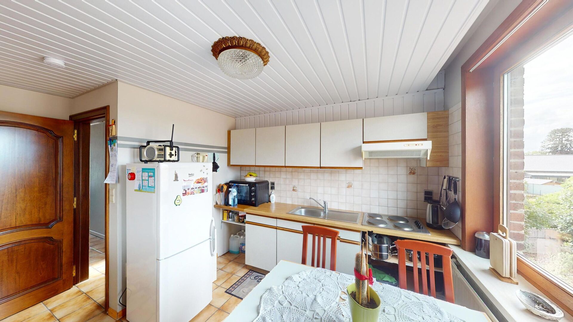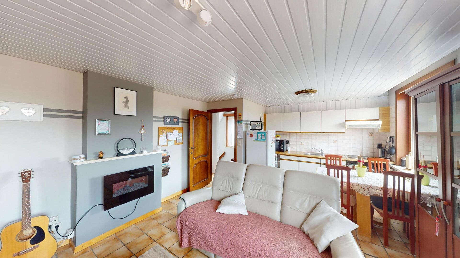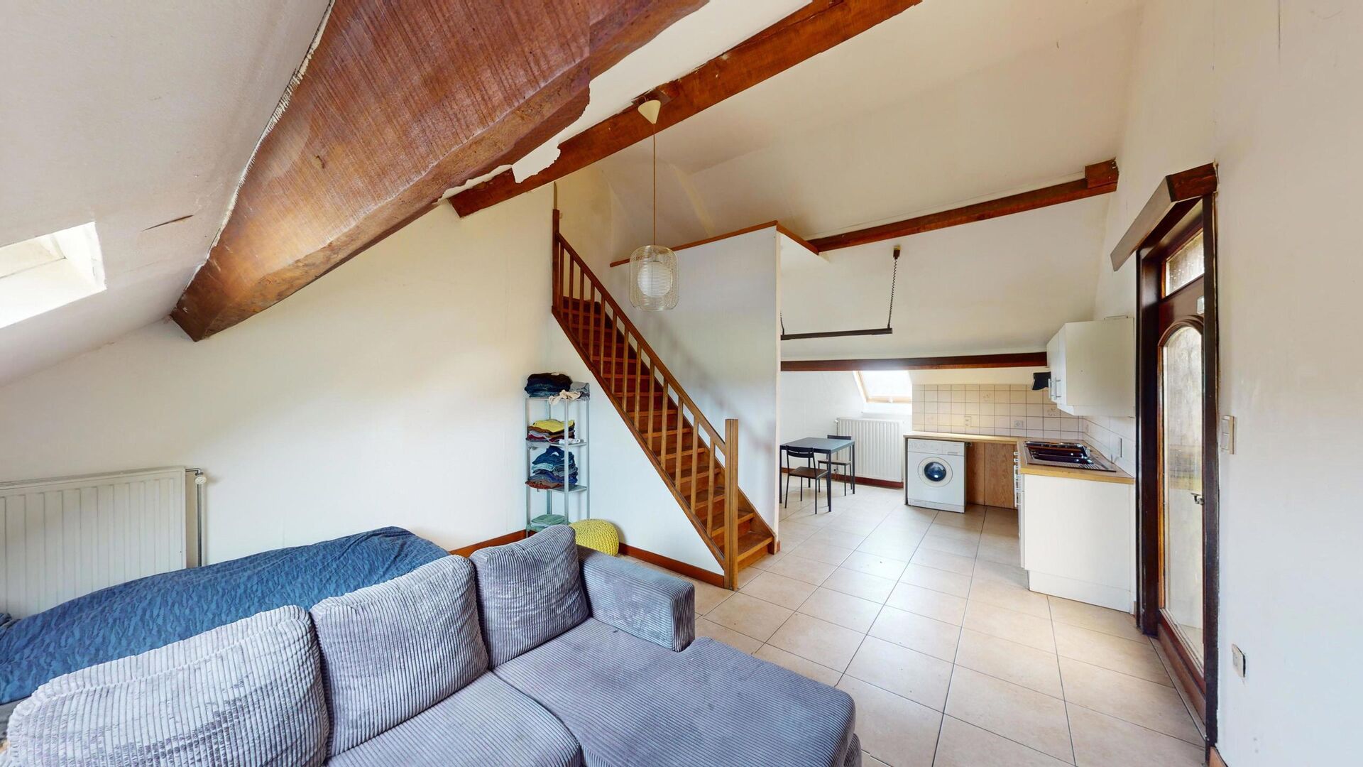 Op het gelijkvloers bevind zich een appartement met ruime leefruimte bestaande uit zithoek en eetkamer. Hier kan u genieten van een haardvuur.